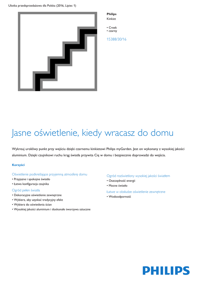 Ulotka przedsprzedażowa dla Polska (2016, Lipiec 1) Philips Kinkiet • Creek • czarny 15388/30/16 Jasne oświetlenie, kiedy wracasz do domu Wykreuj urokliwy punkt przy wejściu dzięki czarnemu kinkietowi Philips myGarden. Jest on wykonany z wysokiej jakości aluminium. Dzięki czujnikowi ruchu krąg światła przywita Cię w domu i bezpiecznie doprowadzi do wejścia. Korzyści Oświetlenie podkreślające przyjemną atmosferę domu • Przyjazne i spokojne światło • Łatwa konfiguracja czujnika Ogród pełen światła • Dekoracyjne oświetlenie zewnętrzne • Wybierz, aby uzyskać tradycyjny efekt • Wybierz do oświetlenia ścian • Wysokiej jakości aluminium i doskonałe tworzywa sztuczne Ogród rozświetlony wysokiej jakości światłem • Oszczędność energii • Mocne światło Łatwe w obsłudze oświetlenie zewnętrzne • Wodoodporność Cechy Przyjazne i spokojne światło Najwyższej jakości materiały Ta lampa Philips została zaprojektowana specjalnie do zastosowań zewnętrznych. Jest trwała i będzie oświetlać ogród przez długi czas. Została wykonana z wysokiej jakości odlewanego aluminium i doskonałych tworzyw sztucznych. Oszczędność energii Czujnik ruchu włącza się automatycznie, gdy wracasz do domu, i informuje Cię, gdy ktoś przyjedzie. Łatwa konfiguracja czujnika Ta lampa firmy Philips zużywa mniej energii niż tradycyjne źródła światła, co pozwala zmniejszyć rachunki za prąd i przyczynia się do ochrony środowiska. Mocne światło Prosta konfiguracja pozwala ustawić, kiedy i na jak długo automatyczny czujnik włącza lampę lub lampy. Ta lampa zewnętrzna daje mocne, ciepłe, białe światło. Jasny strumień światła odpowiednio oświetli Twój ogród lub taras. Wodoodporność Dekoracyjne oświetlenie zewnętrzne Oświetlenie zewnętrzne może poprawić wygląd ogrodu lub przestrzeni wokół domu poprzez podświetlenie przyciągających uwagę elementów, rozświetlenie ścieżek lub stworzenie doskonałej atmosfery podczas niezapomnianych wieczorów z rodziną i przyjaciółmi. Właśnie dla takich zastosowań firma Philips stworzyła myGarden, czyli serię pięknych, dekoracyjnych, zewnętrznych opraw oświetleniowych charakteryzujących się klasą i funkcjonalnością. Wszystko po to, aby można było w pełni wykorzystać przestrzeń zewnętrzną i nadać jej własny styl. Wybierz, aby uzyskać tradycyjny efekt Ta zaprojektowana w Europie lampa o unikatowym wzorze pozwala osiągnąć tradycyjny efekt na zewnątrz. Ta lampa Philips została zaprojektowana pod kątem wilgotnych miejsc i przeszła rygorystyczne testy, które potwierdziły jej odporność na wodę. Poziom IP określają dwie liczby: pierwsza to poziom ochrony przeciw kurzowi, a druga przeciw wodzie. Poziom IP44 oznacza, że jest odporna na zachlapania. To czyni z niej idealną lampę do zastosowań zewnętrznych. Wybierz do oświetlenia ścian Wykorzystaj dostępną przestrzeń. Ten kinkiet jest idealny do zamontowania w pobliżu drzwi wejściowych lub na ścianach tarasu. Specyfikacje Prosimy pamiętać, że jest to ulotka przedsprzedażowa. Treść ulotki jest zgodna z naszą najlepszą wiedzą w momencie publikacji i w odniesieniu do danego kraju (podane powyżej). Treść ulotki może ulec zmianie bez powiadomienia. Firma Philips nie ponosi odpowiedzialności za treść ulotki. Stylistyka i wykończenie Materiał Kolor aluminium syntetyk czarny Dodatkowe funkcje/akcesoria w zestawie Czujnik ruchu Pełna odporność na warunki pogodowe TAK TAK Wymiary i waga produktu Wysokość Długość Szerokość Waga netto 28,5 cm 17,5 cm 20 cm 0,717 kg Dane techniczne Zasilanie sieciowe Liczba źródeł światła Przedział 220–240 V 50–60 Hz 1 Trzonek Moc źródła światła w zestawie Maksymalna moc wymiennego źródła światła Oprawa z możliwością przyciemniania LED Wbudowane źródło światła LED Klasa energetyczna dołączonego źródła światła Oprawa jest zgodna ze źródłami światła klasy Współczynnik IP E27 źródło światła niedołączone do zestawu 60 W Tak Nie NIE źródło światła do nabycia osobno A++ do E IP44 ochrona przed przedmiotami powyżej 1 mm ochrona przed rozchlapaną wodą Dane wkrótce ulegną zmianie 2016, Lipiec 1 Klasa ochronności I — uziemienie Waga Serwis Gwarancja Różne 2 lata Opracowano z myślą o Styl Typ Wymiary i waga opakowania Wysokość Długość Szerokość 0,940 kg 25,9 cm 21,8 cm 18,3 cm Dane wkrótce ulegną zmianie 2016, Lipiec 1 Version: 2.0.1 EAN: 8718291443605 Ogród i patio Tradycyjny Kinkiet © 2016 Koninklijke Philips Electronics N.V. Wszelkie prawa zastrzeżone Dane mogą ulec zmianie bez uprzedniego powiadomienia. Znak towarowy jest własnością Koninklijke Philips Electronics N.V. lub odpowiednich podmiotów . www.philips.com