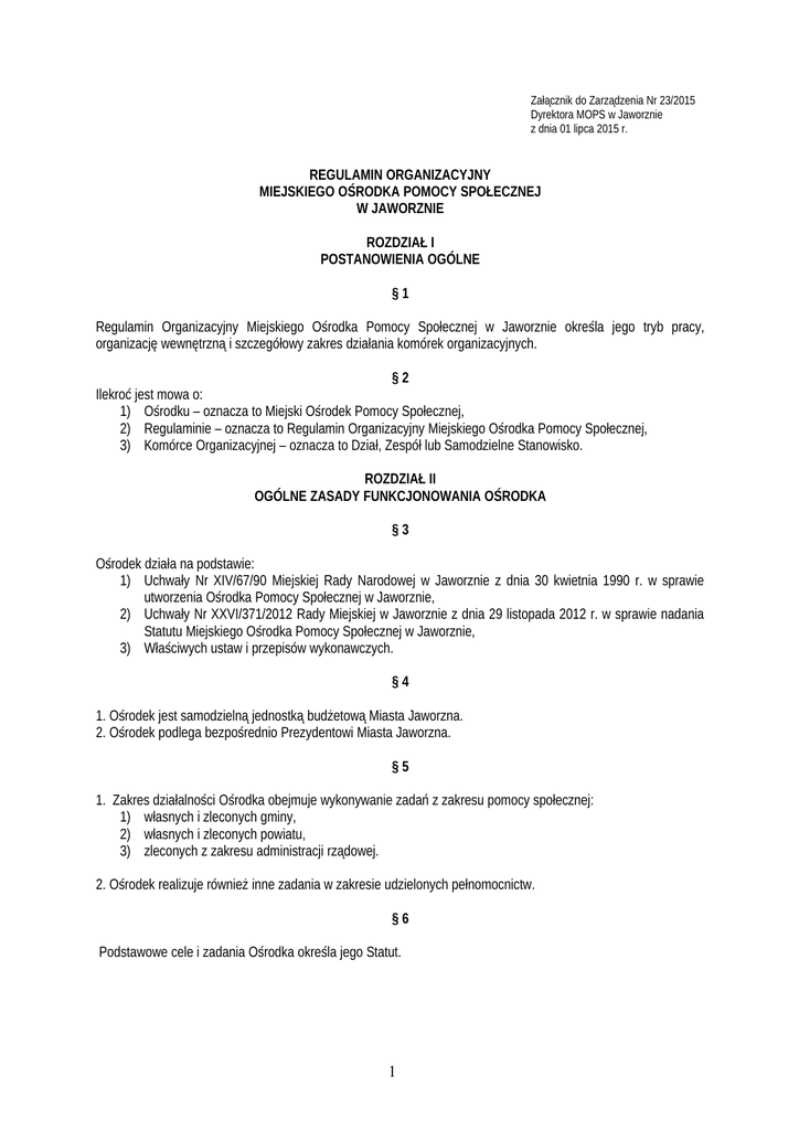 Załącznik do Zarządzenia Nr 23/2015 Dyrektora MOPS w Jaworznie z dnia 01 lipca 2015 r. REGULAMIN ORGANIZACYJNY MIEJSKIEGO OŚRODKA POMOCY SPOŁECZNEJ W JAWORZNIE ROZDZIAŁ I POSTANOWIENIA OGÓLNE §1 Regulamin Organizacyjny Miejskiego Ośrodka Pomocy Społecznej w Jaworznie określa jego tryb pracy, organizację wewnętrzną i szczegółowy zakres działania komórek organizacyjnych. §2 Ilekroć jest mowa o: 1) Ośrodku – oznacza to Miejski Ośrodek Pomocy Społecznej, 2) Regulaminie – oznacza to Regulamin Organizacyjny Miejskiego Ośrodka Pomocy Społecznej, 3) Komórce Organizacyjnej – oznacza to Dział, Zespół lub Samodzielne Stanowisko. ROZDZIAŁ II OGÓLNE ZASADY FUNKCJONOWANIA OŚRODKA §3 Ośrodek działa na podstawie: 1) Uchwały Nr XIV/67/90 Miejskiej Rady Narodowej w Jaworznie z dnia 30 kwietnia 1990 r. w sprawie utworzenia Ośrodka Pomocy Społecznej w Jaworznie, 2) Uchwały Nr XXVI/371/2012 Rady Miejskiej w Jaworznie z dnia 29 listopada 2012 r. w sprawie nadania Statutu Miejskiego Ośrodka Pomocy Społecznej w Jaworznie, 3) Właściwych ustaw i przepisów wykonawczych. §4 1. Ośrodek jest samodzielną jednostką budżetową Miasta Jaworzna. 2. Ośrodek podlega bezpośrednio Prezydentowi Miasta Jaworzna. §5 1. Zakres działalności Ośrodka obejmuje wykonywanie zadań z zakresu pomocy społecznej: 1) własnych i zleconych gminy, 2) własnych i zleconych powiatu, 3) zleconych z zakresu administracji rządowej. 2. Ośrodek realizuje również inne zadania w zakresie udzielonych pełnomocnictw. §6 Podstawowe cele i zadania Ośrodka określa jego Statut. 1 ROZDZIAŁ III ORGANIZACJA OŚRODKA §7 Schemat organizacyjny Ośrodka określa Załącznik do niniejszego Regulaminu. §8 Funkcjonowanie Ośrodka opiera się na zasadach jednoosobowego kierownictwa, służbowego podporządkowania, podziału czynności i indywidualnej odpowiedzialności za wykonanie powierzonych zadań. §9 Zadania Ośrodka realizują następujące komórki organizacyjne: 1) Dział Finansowy – DF 2) Dział Administracyjny – DA 3) Dział Świadczeń Społecznych – DSS 4) Dział Świadczeń Rodzinnych – DSR 5) Dział Świadczeń Alimentacyjnych – DSA 6) Dział Reintegracji Społecznej i Zawodowej – RSZ 7) Dział Pieczy Zastępczej – PZ 8) Dział Świadczeń Pieczy Zastępczej – SPZ 9) Dział Rehabilitacji Społecznej Osób Niepełnosprawnych – RSN 10) Dział Pomocy Środowiskowej – DPS a) Zespół Pracy Socjalnej Nr 1 – DPS1 b) Zespół Pracy Socjalnej Nr 2 – DPS2 c) Zespół Pracy Socjalnej Nr 3 – DPS3 d) Zespół Pracy Socjalnej Nr 4 – DPS4 e) Zespół Asysty Rodzinnej – DPSA f) Zespół Koordynatorów Pracy Socjalnej i Asysty Rodzinnej – DPSK g) Sekcja Obsługi Zespołu Interdyscyplinarnego ds. Przeciwdziałania Przemocy w Rodzinie - ZI 11) Dział ds. Bezdomności – DB 12) Dział Domów Pomocy Społecznej i Usług Opiekuńczych - stanowiska samodzielne – DU 13) Dział Strategii i Projektów Społecznych – SPS 14) Informatycy - stanowiska samodzielne – IT 15) Radcy Prawni - stanowiska samodzielne – RP 16) Specjalista ds. Osób Niepełnosprawnych i Organizacji Pozarządowych – stanowisko samodzielne – ON 17) Stanowisko ds. Sprawozdań, Statystyk i Analiz – stanowisko samodzielne – SA 18) Stanowisko ds. Komunikacji Społecznej – stanowisko samodzielne – KS § 10 W Ośrodku tworzy się następujące stanowiska kierownicze: 1) Dyrektor, 2) I Zastępca Dyrektora, 3) II Zastępca Dyrektora, 4) Główny Księgowy, 5) Kierownik Działu Administracyjnego, 6) Kierownik Działu Świadczeń Społecznych, 7) Kierownik Działu Świadczeń Rodzinnych, 8) Kierownik Działu Świadczeń Alimentacyjnych, 9) Kierownik Działu Reintegracji Społecznej i Zawodowej, 10) Kierownik Działu Pieczy Zastępczej, 11) Kierownik Działu Świadczeń Pieczy Zastępczej, 2 12) 13) 14) 15) Kierownik Działu Rehabilitacji Społecznej Osób Niepełnosprawnych, Kierownik Działu Pomocy Środowiskowej, Kierownik Działu ds. Bezdomności, Kierownik Działu Strategii i Projektów Społecznych. § 11 Kierownictwo Ośrodka stanowią: 1) Dyrektor – ND 2) I Zastępca Dyrektora – ZD1 3) II Zastępca Dyrektora – ZD2 4) Główny Księgowy – GK § 12 1. Dyrektor może powoływać zespoły i komisje tematyczne, złożone z pracowników Ośrodka. 2. Zasady pracy zespołów i komisji określonych w ust. 1 regulują zarządzenia i polecenia służbowe Dyrektora. § 13 1. Zadania dla poszczególnych stanowisk pracy określają szczegółowe zakresy czynności. 2. Szczegółowy wykaz stanowisk, wymaganych kwalifikacji oraz wynagrodzeń określa Regulamin Wynagradzania. § 14 Do zakresu działania Dyrektora Ośrodka należy w szczególności: 1) wykonywanie funkcji zwierzchnika służbowego i pracodawcy w rozumieniu przepisów prawa pracy w stosunku do pracowników zatrudnionych w Ośrodku, 2) sprawowanie ogólnego kierownictwa Ośrodka, 3) organizowanie pracy Ośrodka, 4) ustalanie wewnętrznej organizacji Ośrodka, 5) zatwierdzanie wewnętrznych zarządzeń, regulaminów i instrukcji, 6) ustalanie nadzoru nad: a) ochroną mienia Ośrodka, b) organizacją dyscypliny pracy, c) funkcjonowaniem kontroli komórek organizacyjnych, d) jakością świadczonych usług, e) rozpatrywaniem skarg i wniosków, 7) inicjowanie analiz umożliwiających wnioskowanie o umieszczanie zadań w zakresie pomocy społecznej w wieloletnich planach finansowych, 8) zatwierdzanie dowodów księgowych stwierdzających fakt dokonania operacji gospodarczych zgodnie z ich rzeczywistym przebiegiem, 9) dysponowanie środkami pieniężnymi Ośrodka w celu realizacji zadań statutowych, 10) wydawanie decyzji administracyjnych zgodnie z posiadanymi upoważnieniami, 11) przedstawianie Prezydentowi Miasta corocznej oceny zasobów pomocy społecznej, 12) składanie Radzie Miasta corocznych sprawozdań z działalności Ośrodka oraz przedstawianie wykazu potrzeb, 13) zapewnienie funkcjonowania skutecznej i efektywnej kontroli zarz