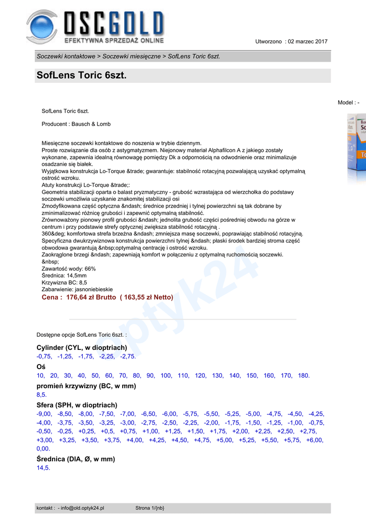 Utworzono : 02 marzec 2017 Soczewki kontaktowe > Soczewki miesięczne > SofLens Toric 6szt. SofLens Toric 6szt. Model : SofLens Toric 6szt. Producent : Bausch & Lomb Miesięczne soczewki kontaktowe do noszenia w trybie dziennym. Proste rozwiązanie dla osób z astygmatyzmem. Niejonowy materiał Alphafilcon A z jakiego zostały wykonane, zapewnia idealną równowagę pomiędzy Dk a odpornością na odwodnienie oraz minimalizuje osadzanie się białek. Wyjątkowa konstrukcja Lo-Torque ™ gwarantuje: stabilność rotacyjną pozwalającą uzyskać optymalną ostrość wzroku. Atuty konstrukcji Lo-Torque ™: Geometria stabilizacji oparta o balast pryzmatyczny - grubość wzrastająca od wierzchołka do podstawy soczewki umożliwia uzyskanie znakomitej stabilizacji osi Zmodyfikowana część optyczna – średnice przedniej i tylnej powierzchni są tak dobrane by zminimalizować różnicę grubości i zapewnić optymalną stabilność. Zrównoważony pionowy profil grubości – jednolita grubość części pośredniej obwodu na górze w centrum i przy podstawie strefy optycznej zwiększa stabilność rotacyjną . 360° komfortowa strefa brzeżna – zmniejsza masę soczewki, poprawiając stabilność rotacyjną. Specyficzna dwukrzywiznowa konstrukcja powierzchni tylnej – płaski środek bardziej stroma część obwodowa gwarantują optymalną centrację i ostrość wzroku. Zaokrąglone brzegi – zapewniają komfort w połączeniu z optymalną ruchomością soczewki. Zawartość wody: 66% Średnica: 14,5mm Krzywizna BC: 8,5 Zabarwienie: jasnoniebieskie 4 2 k y t p o Cena : 176,64 zł Brutto ( 163,55 zł Netto) Dostępne opcje SofLens Toric 6szt. : Cylinder (CYL, w dioptriach) -0,75, -1,25, -1,75, -2,25, -2,75. Oś 10, 20, 30, 40, 50, 60, 70, 80, 90, 100, 110, 120, 130, 140, 150, 160, 170, 180. promień krzywizny (BC, w mm) 8,5. Sfera (SPH, w dioptriach) -9,00, -4,00, -0,50, +3,00, 0,00. -8,50, -3,75, -0,25, +3,25, -8,00, -7,50, -7,00, -6,50, -6,00, -5,75, -5,50, -5,25, -5,00, -4,75, -4,50, -4,25, -3,50, -3,25, -3,00, -2,75, -2,50, -2,25, -2,00, -1,75, -1,50, -1,25, -1,00, -0,75, +0,25, +0,5, +0,75, +1,00, +1,25, +1,50, +1,75, +2,00, +2,25, +2,50, +2,75, +3,50, +3,75, +4,00, +4,25, +4,50, +4,75, +5,00, +5,25, +5,50, +5,75, +6,00, Średnica (DIA, Ø, w mm) 14,5. kontakt : - [email protected] Strona 1/{nb} Utworzono : 02 marzec 2017 Soczewki kontaktowe > Soczewki miesięczne > SofLens Toric 6szt. SofLens Toric 6szt. Dostępność: Produkt dostępny w naszym sklepie od 22 kwiecień 2007 4 2 k y t p o kontakt : - [email protected] Strona 2/{nb}