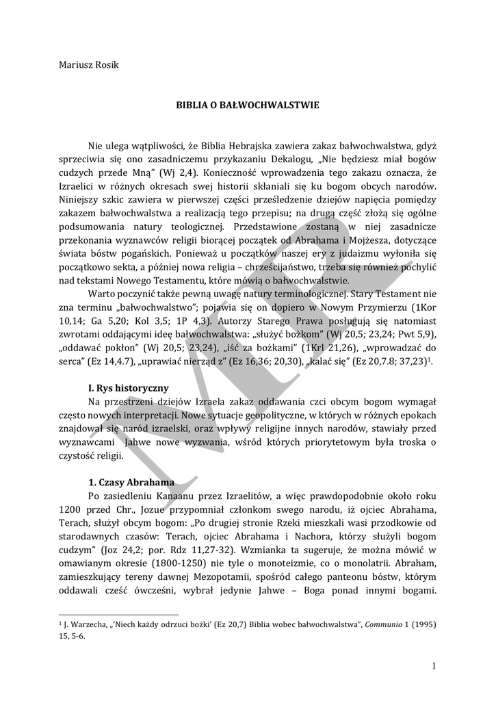 Mariusz Rosik BIBLIA O BAŁWOCHWALSTWIE Nie ulega wątpliwości, że Biblia Hebrajska zawiera zakaz bałwochwalstwa, gdyż sprzeciwia się ono zasadniczemu przykazaniu Dekalogu, „Nie będziesz miał bogów cudzych przede Mną” (Wj 2,4). Konieczność wprowadzenia tego zakazu oznacza, że Izraelici w różnych okresach swej historii skłaniali się ku bogom obcych narodów. Niniejszy szkic zawiera w pierwszej części prześledzenie dziejów napięcia pomiędzy zakazem bałwochwalstwa a realizacją tego przepisu; na drugą część złożą się ogólne podsumowania natury teologicznej. Przedstawione zostaną w niej zasadnicze przekonania wyznawców religii biorącej początek od Abrahama i Mojżesza, dotyczące świata bóstw pogańskich. Ponieważ u początków naszej ery z judaizmu wyłoniła się początkowo sekta, a później nowa religia – chrześcijaństwo, trzeba się również pochylić nad tekstami Nowego Testamentu, które mówią o bałwochwalstwie. Warto poczynić także pewną uwagę natury terminologicznej. Stary Testament nie zna terminu „bałwochwalstwo”; pojawia się on dopiero w Nowym Przymierzu (1Kor 10,14; Ga 5,20; Kol 3,5; 1P 4,3). Autorzy Starego Prawa posługują się natomiast zwrotami oddającymi ideę bałwochwalstwa: „służyć bożkom” (Wj 20,5; 23,24; Pwt 5,9), „oddawać pokłon” (Wj 20,5; 23,24), „iść za bożkami” (1Krl 21,26), „wprowadzać do serca” (Ez 14,4.7), „uprawiać nierząd z” (Ez 16,36; 20,30), „kalać się” (Ez 20,7.8; 37,23)1. I. Rys historyczny Na przestrzeni dziejów Izraela zakaz oddawania czci obcym bogom wymagał często nowych interpretacji. Nowe sytuacje geopolityczne, w których w różnych epokach znajdował się naród izraelski, oraz wpływy religijne innych narodów, stawiały przed wyznawcami Jahwe nowe wyzwania, wśród których priorytetowym była troska o czystość religii. 1. Czasy Abrahama Po zasiedleniu Kanaanu przez Izraelitów, a więc prawdopodobnie około roku 1200 przed Chr., Jozue przypomniał członkom swego narodu, iż ojciec Abrahama, Terach, służył obcym bogom: „Po drugiej stronie Rzeki mieszkali wasi przodkowie od starodawnych czasów: Terach, ojciec Abrahama i Nachora, którzy służyli bogom cudzym” (Joz 24,2; por. Rdz 11,27-‐32). Wzmianka ta sugeruje, że można mówić w omawianym okresie (1800-‐1250) nie tyle o monoteizmie, co o monolatrii. Abraham, zamieszkujący tereny dawnej Mezopotamii, spośród całego panteonu bóstw, którym oddawali cześć ówcześni, wybrał jedynie Jahwe – Boga ponad innymi bogami. 1 J. Warzecha, „‘Niech każdy odrzuci bożki’ (Ez 20,7) Biblia wobec bałwochwalstwa”, Communio 1 (1995) 15, 5-‐6. 1 Wyłączność kultu nie oznaczała jeszcze wtedy przekonania, że inni bogowie nie istnieją; była jednak pierwszym krokiem w kierunku późniejszego monoteizmu izraelskiego. 2. Niewola egipska i exodus Starożytni Egipcjanie oddawali cześć wielu bóstwom, gdyż – według ich przekonania -‐ każde z nich sprawowało pieczę nad inną dziedziną życia. Wydaje się, że naczelnymi bóstwami pozostawali zawsze Re i Amon. Re występował w kilku postaciach. W dzień był bogiem żywym (przychodził na świat o świcie jako małe dziecko), w południe stawał się mężczyzną w sile wieku, a w nocy umierał jako starzec. Imię Amona oznacza „niewidzialny”2. Kolejne bóstwa egipskie to Nut i Geb, którzy byli przedstawiani jako namiętni kochankowie. Ich dzieckiem miał być Ozyrys. W ciągu dnia kochanków rozdzielał Szu (bóstwo powietrza). Stosunkowo powszechnie czczony był także Horus, uważany początkowo za boga nieba, który jako sokół szybował nad Egiptem. Izraelici żyjący w Egipcie jako lud uciemiężony ciężkimi pracami, z pewnością doskonale znali przekonania religijne mieszkańców kraju nad Nilem. Za wszelką cenę starali się utrzymać monoteizm, co w zetknięciu z kulturą o wiele starszą, bogatszą i potężniejszą okazywało się zadaniem o dużym stopniu trudności. Tradycyjnie przyjmuje się, że Hebrajczycy opuścili Egipt za czasów Ramzesa II, choć teza ta coraz częściej poddawana jest w wątpliwość. Nie jest to jednak istotne dla ukazania styku religii żydowskiej z wielobóstwem Egipcjan. Znaczący dla ukazania wpływu wierzeń Egipcjan na wiarę Izraela jest epizod, który miał miejsce podczas exodusu. Chodzi o tzw. kult złotego cielca, którego ulali Izraelici niecierpliwiący się nieobecnością Mojżesza, który przez czterdzieści dni przebywał na Synaju. De facto nie był to kult obcego boga, lecz próba wyobrażenia sobie Jahwe, który nakazał Izraelitom opuszczenie Egiptu (Wj 32,4). Surowa reakcja Mojżesza wskazuje na troskę o to, by w kulcie Jahwe unikać wszelkich reprezentacji bóstwa, gdyż praktyka taka niwelowałaby novum mozaizmu3 wobec religii innych narodów czy grup etnicznych. Religioznawcy skłaniają się ku tezie, że sporządzenie wizerunku Boga było wynikiem wpływu egipskich reprezentacji bóstw na mentalność Izraelitów. Kolejny epizod, zapisany przez autora Księgi Liczb, poświadcza, że karą za przekroczenie zakazu bałwochwalstwa była śmierć: „Gdy przebywali w Szittim, zaczął lud uprawiać nierząd z Moabitkami. One to nakłaniały lud do brania udziału w ofiarach składanych ich bożkom. Lud spożywał dary ofiarne i oddawał pokłon ich bogom. [...] I rzekł Pan do Mojżesza: ‘Zbierz wszystkich winnych przywódców Izraela i powieś ich...’” (Lb 25,1-‐4). W tym samym czasie sławę zdobył sobie kapłan Pinchas, który stał się prototypem późniejszych zelotów, a który pałając gorliwością o czystość krwi Izraelitów – a tym samym o czystość ich wiary – przebił włócznią swego współrodaka i Madianitkę, którzy planowali małżeństwo (Lb 25,6-‐10). 2 W Tebach (obecnym Luksorze) czczono obydwa bóstwa pod jednym imieniem Amon-‐Re. 3 Pojęcia „mozaizm” używamy tu w odniesieniu do religii Izraeli