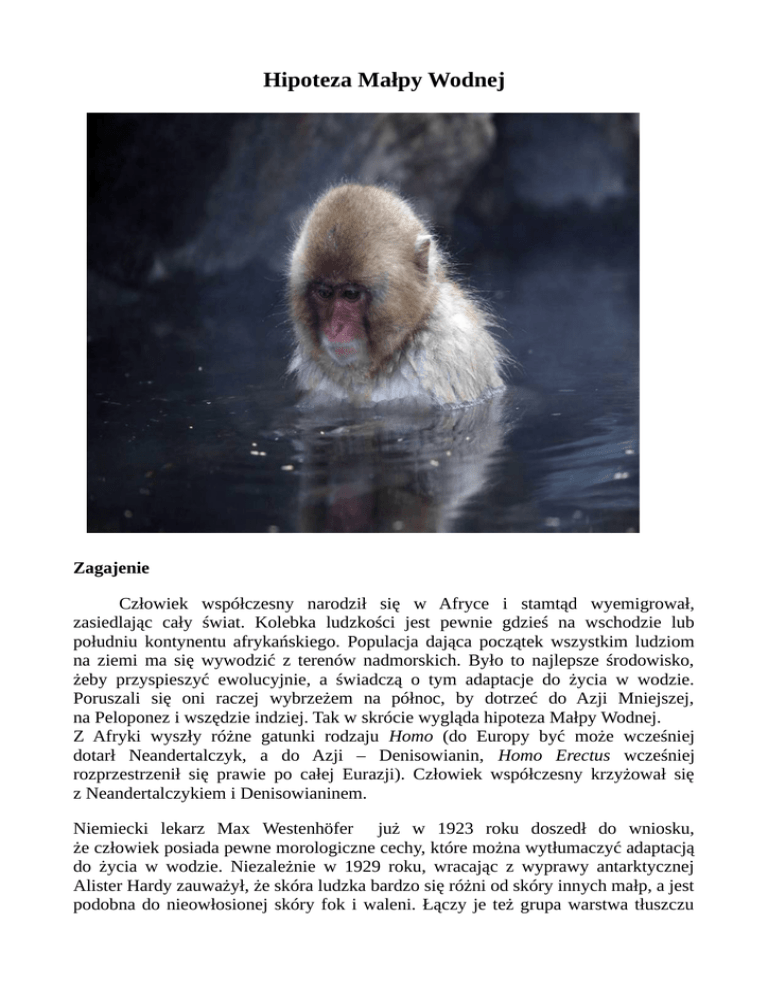 Hipoteza Małpy Wodnej Zagajenie Człowiek współczesny narodził się w Afryce i stamtąd wyemigrował, zasiedlając cały świat. Kolebka ludzkości jest pewnie gdzieś na wschodzie lub południu kontynentu afrykańskiego. Populacja dająca początek wszystkim ludziom na ziemi ma się wywodzić z terenów nadmorskich. Było to najlepsze środowisko, żeby przyspieszyć ewolucyjnie, a świadczą o tym adaptacje do życia w wodzie. Poruszali się oni raczej wybrzeżem na północ, by dotrzeć do Azji Mniejszej, na Peloponez i wszędzie indziej. Tak w skrócie wygląda hipoteza Małpy Wodnej. Z Afryki wyszły różne gatunki rodzaju Homo (do Europy być może wcześniej dotarł Neandertalczyk, a do Azji – Denisowianin, Homo Erectus wcześniej rozprzestrzenił się prawie po całej Eurazji). Człowiek współczesny krzyżował się z Neandertalczykiem i Denisowianinem. Niemiecki lekarz Max Westenhöfer już w 1923 roku doszedł do wniosku, że człowiek posiada pewne morologiczne cechy, które można wytłumaczyć adaptacją do życia w wodzie. Niezależnie w 1929 roku, wracając z wyprawy antarktycznej Alister Hardy zauważył, że skóra ludzka bardzo się różni od skóry innych małp, a jest podobna do nieowłosionej skóry fok i waleni. Łączy je też grupa warstwa tłuszczu podskórnego (uchatki i kotiki mają jednak sierść). Hardy czekał z publikacją swojej hipotezy wiele lat, bo bał się, że takie rewelacje mogą zaszkodzić jego naukowej karierze. Zdecydował się w 1960 roku. Wątek podjęła następnie brytyjka Elaine Morgan popularyzując tę koncepcję. Hipoteza ta jest wyśmiewana przez główny nurt naukowców, chociaż część tzw. poważnych badaczy przyznaje, że może być tutaj coś na rzeczy. W Każdym razie Elain Morgan wykonała dobrą pracę, zbierając i udostępniając wiele doniesień naukowych, mających związek z tą hipotezą. Napisała też kilka książek popularnonaukowych o ewolucji człowieka, w dodatku z perspektywy kobiety. Innym, ważnym badaczem i propagatorem idei „małpy wodnej” był guru swobodnych nurków Jacques Mayol. Swoje idee przybliża w książce pod tytułem Homo Delphinus. Mayol stara się udowodnić, iż człowiek ma wrodzony potencjał do nurkowania, który można stosunkowo łatwo uruchomić. Podróżując po świecie opisywał zachowania ludzi tradycyjnie zajmujących się od czasów prehistorycznych nurkowaniem i pływaniem (np. poławiaczki pereł na Dalekim Wschodzie). Argument behawioralny Ludzkie dzieci pozostawione na plaży idą w kierunku wody, uwielbiają zabawy na granicy woda – ląd. Większość wchodzi śmiało do wody. Mało dzieci się tego boi. Raczej jest problem odwrotny: trzeba uważać, żeby nie weszły za głęboko. Szympansy, orangutany i inne naczelne wody unikają, starają się ją obejść. Jeśli znajdą się w wodzie najczęściej toną. Pogranicze woda – ląd jest tak naprawdę najlepszym środowiskiem zabawy człowieka od najmłodszych lat. Ale nie u innych naczelnych. Zbieranie muszelek i kamyczków wydaje się być instynktowne i przygotowywać ma pewnie do późniejszego poszukiwania pożywienia w bogatych wodach przybrzeżnych. Jednak, żeby być uczciwym trzeba wspomnieć, że da się nauczyć szympansy i orangutany pływać i nurkować. Dowód to szympans o imieniu Cooper z RPA, który po stosownym treningu nauczył się ruchów naprzemiennych, przypominających kraula. Właściwie wielu ludzi pływa takim kraulem. W doniesieniach prasowych ruchy te mylnie opisywane są jako „żabkowe” i dotyczy to zarówno Coopera jak i znanego pływającego orangutana z Borneo. Wyjątek wśród naczelnych stanowią japońskie Makaki, które nie stronią od wody. Wręcz przeciwnie, zimą wyszukują ciepłe źródła i akweny, w których z upodobaniem spędzają czas. Wracajmy do ludzkich dzieci. Niemowlęta łatwo wstrzymują oddech i można wywołać u nich odruchowe pływanie. Obniżenie krtani, dzięki któremu mówimy, miało wyewoluować wg obrońców koncepcji, z wstrzymywania oddechu przy nurkowaniu. Matka z oseskiem (dzieckiem przy piersi) może brodzić w wodzie poszukując pożywienia między kamieniami (pod kamieniami), dziecko dobrze to znosi i jest to normalna praktyka ludów zamieszkujących tradycyjnie nadbrzeżne ciepłe wody na świecie. Zresztą kobiety lubią rodzić w wodzie, co ma zmniejszać ryzyko uszkodzenia stosunkowo dużej głowy dziecka podczas przejścia przez kanał rodny. Psychologicznie taka forma porodu jest uważana przez wiele kobiet za przyjemniejszą dla matki i dziecka. Wg zwolenników hipotezy małpy wodnej Wcześni przedstawiciele rodzaju Homo umieli i lubili pływać. Powołują się oni na fakt, że kości Homo Erectus zostały odnalezione na wyspie na Oceanie Indyjskim oddalonej od lądu o 19 km, mówiąc, że musieli ten odcinek przepłynąć wpław. Jednak wiemy, że zwierzęta jak i ludzie podróżują na kłodach, korzystając z prądów morskich. Słynny podróżnik Thor Heyerdahl udowodnił, że dryfując można przemierzyć nawet 8000 tysięcy kilometrów. W przeszłości mogły istnieć też mosty lądowe do dzisiejszych wysp. Jeszcze o skórze Skóra ludzkich niemowląt jest dużo grubsza, ma więcej tłuszczu podskórnego w porównaniu z innymi dziećmi naczelnych. Człowiek ma specyficzne rozmieszczenie gruczołów łojowych i potowych, a także wzorce wydzielania odpowiednich substancji, podobne do zwierząt przybrzeżnych. Bezwłosa skóra ludzka może co prawda źle reagować na wodę chlorowaną, za to większość ludzi odnosi korzyść pływając regularnie w wodzie morskiej. Alergie często wycofują się, skóra po kontakcie z algami wydaje się zdrowsza, co wykorzystuje się w przemyśle kosmetycznym. Po regularnym pływaniu skóra zyskuje dodatkowe napięcie, tłuszcz podskórny rozwija się, co może sprawić, że skóra wygląda młodziej. Ma tu znaczenie czynnik termiczny wody działającej na skórę. Ludzki odruch nurkowa