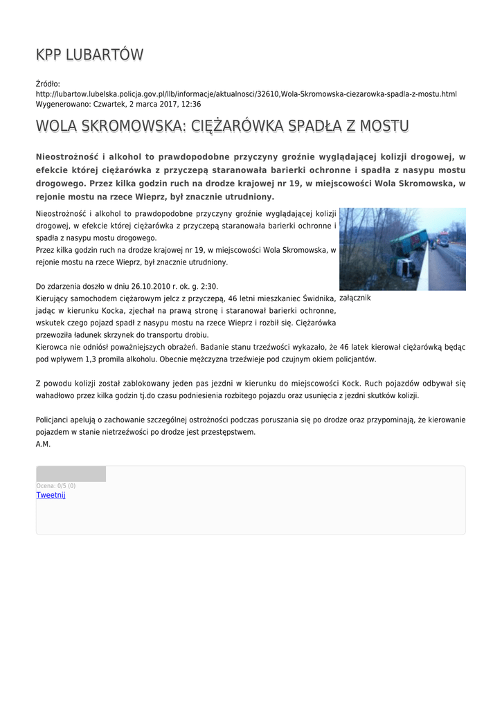 KPP LUBARTÓW Źródło: http://lubartow.lubelska.policja.gov.pl/llb/informacje/aktualnosci/32610,Wola-Skromowska-ciezarowka-spadla-z-mostu.html Wygenerowano: Czwartek, 2 marca 2017, 12:36 WOLA SKROMOWSKA: CIĘŻARÓWKA SPADŁA Z MOSTU Nieostrożność i alkohol to prawdopodobne przyczyny groźnie wyglądającej kolizji drogowej, w efekcie której ciężarówka z przyczepą staranowała barierki ochronne i spadła z nasypu mostu drogowego. Przez kilka godzin ruch na drodze krajowej nr 19, w miejscowości Wola Skromowska, w rejonie mostu na rzece Wieprz, był znacznie utrudniony. Nieostrożność i alkohol to prawdopodobne przyczyny groźnie wyglądającej kolizji drogowej, w efekcie której ciężarówka z przyczepą staranowała barierki ochronne i spadła z nasypu mostu drogowego. Przez kilka godzin ruch na drodze krajowej nr 19, w miejscowości Wola Skromowska, w rejonie mostu na rzece Wieprz, był znacznie utrudniony. Do zdarzenia doszło w dniu 26.10.2010 r. ok. g. 2:30. Kierujący samochodem ciężarowym jelcz z przyczepą, 46 letni mieszkaniec Świdnika, załącznik jadąc w kierunku Kocka, zjechał na prawą stronę i staranował barierki ochronne, wskutek czego pojazd spadł z nasypu mostu na rzece Wieprz i rozbił się. Ciężarówka przewoziła ładunek skrzynek do transportu drobiu. Kierowca nie odniósł poważniejszych obrażeń. Badanie stanu trzeźwości wykazało, że 46 latek kierował ciężarówką będąc pod wpływem 1,3 promila alkoholu. Obecnie mężczyzna trzeźwieje pod czujnym okiem policjantów. Z powodu kolizji został zablokowany jeden pas jezdni w kierunku do miejscowości Kock. Ruch pojazdów odbywał się wahadłowo przez kilka godzin tj.do czasu podniesienia rozbitego pojazdu oraz usunięcia z jezdni skutków kolizji. Policjanci apelują o zachowanie szczególnej ostrożności podczas poruszania się po drodze oraz przypominają, że kierowanie pojazdem w stanie nietrzeźwości po drodze jest przestępstwem. A.M. Ocena: 0/5 (0) Tweetnij