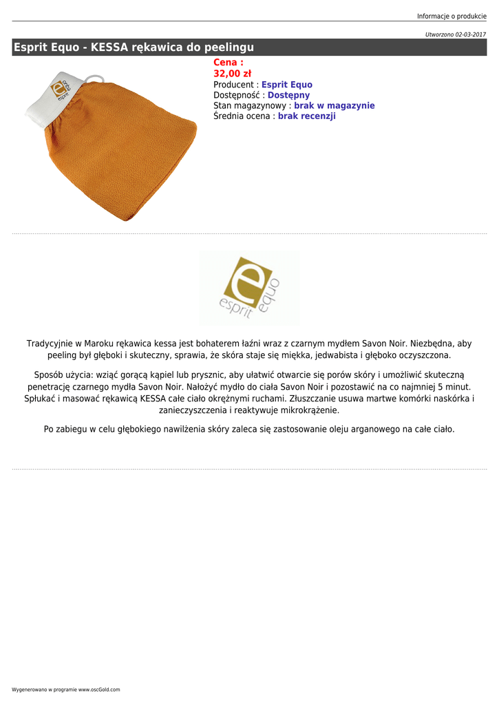 Informacje o produkcie Utworzono 02-03-2017 Esprit Equo - KESSA rękawica do peelingu Cena : 32,00 zł Producent : Esprit Equo Dostępność : Dostępny Stan magazynowy : brak w magazynie Średnia ocena : brak recenzji Tradycyjnie w Maroku rękawica kessa jest bohaterem łaźni wraz z czarnym mydłem Savon Noir. Niezbędna, aby peeling był głęboki i skuteczny, sprawia, że skóra staje się miękka, jedwabista i głęboko oczyszczona. Sposób użycia: wziąć gorącą kąpiel lub prysznic, aby ułatwić otwarcie się porów skóry i umożliwić skuteczną penetrację czarnego mydła Savon Noir. Nałożyć mydło do ciała Savon Noir i pozostawić na co najmniej 5 minut. Spłukać i masować rękawicą KESSA całe ciało okrężnymi ruchami. Złuszczanie usuwa martwe komórki naskórka i zanieczyszczenia i reaktywuje mikrokrążenie. Po zabiegu w celu głębokiego nawilżenia skóry zaleca się zastosowanie oleju arganowego na całe ciało. Wygenerowano w programie www.oscGold.com