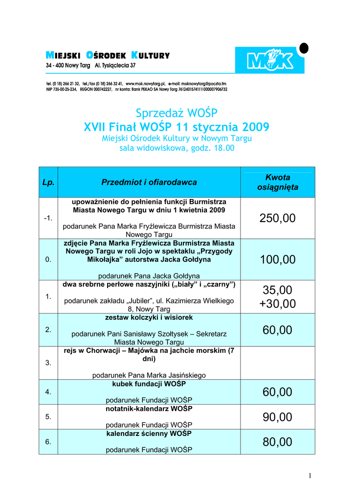 Sprzedaż WOŚP XVII Finał WOŚP 11 stycznia 2009 Miejski Ośrodek Kultury w Nowym Targu sala widowiskowa, godz. 18.00 Lp. Przedmiot i ofiarodawca upoważnienie do pełnienia funkcji Burmistrza Miasta Nowego Targu w dniu 1 kwietnia 2009 -1. 0. podarunek Pana Marka Fryźlewicza Burmistrza Miasta Nowego Targu zdjęcie Pana Marka Fryźlewicza Burmistrza Miasta Nowego Targu w roli Jojo w spektaklu „Przygody Mikołajka” autorstwa Jacka Gołdyna podarunek Pana Jacka Gołdyna dwa srebrne perłowe naszyjniki („biały” i „czarny”) 1. 2. 3. podarunek zakładu „Jubiler”, ul. Kazimierza Wielkiego 8, Nowy Targ zestaw kolczyki i wisiorek podarunek Pani Sanisławy Szołtysek – Sekretarz Miasta Nowego Targu rejs w Chorwacji – Majówka na jachcie morskim (7 dni) podarunek Pana Marka Jasińskiego kubek fundacji WOŚP 4. podarunek Fundacji WOŚP notatnik-kalendarz WOŚP 5. podarunek Fundacji WOŚP kalendarz ścienny WOŚP 6. podarunek Fundacji WOŚP Kwota osiągnięta 250,00 100,00 35,00 +30,00 60,00 60,00 90,00 80,00 1 t-shirt WOŚP (rozmiar M, czarny) 7. podarunek Fundacji WOŚP oryginalny jamajski bęben 30,00 8. podarunek Pani Ewy Pawlikowskiej zestaw kosmetyków dla pań Clarina (4 elementy) 9. 10. 11. 12. 13. podarunek Studio Urody Nefretete, ul. Królowej Jadwigi 38 (Ip), Nowy Targ dwa ręcznie haftowane obrusy podarunek Pani Danuty Maciaszek - babci Sabinki korzystającej z pomocy Fundacji WOŚP zestaw much wędkarskich do łowienia na postumencie podarunek Pana Janusza Masłowskiego komplet biżuterii ręcznie robionej (naszyjnik, kolczyki, bransoletka – wykonany ze szkła weneckiego oraz szkła malowanego, a przy kolczykach srebrne zapięcia) oraz szkatułka drewniana (ręcznie zdobiona technika decoupage) podarunek sklepu „Pati”, ul. Długa 60, Nowy Targ zestaw Starosty: pióro, długopis oraz 2 płyty cd „Gwiazdka z nieba” i „Śpiewnik – Patriotyczne szlify” podarunek Pana Krzysztofa Fabera – Starosty powiatu nowotarskiego zegarek szwajcarskiej marki Geneva 14. podarunek firmy „Marco” – Cecylia i Marek Gryga grafika „Nowy Targ nocą” 15. 16. 100,00 60,00 50,00 80,00 podarunek Polskiego Stowarzyszenia na Rzecz Osób z Upośledzeniem Umysłowym – Koło w Nowym Targu Środowiskowy Dom Samopomocy „Chatka”, ul. Podtatrzańska 47A, Nowy Targ malarstwo na szkle „Anioł Stróż” podarunek Polskiego Stowarzyszenia na Rzecz Osób z Upośledzeniem Umysłowym – Koło w Nowym Targu Środowiskowy Dom Samopomocy „Chatka”, ul. Podtatrzańska 47A, Nowy Targ tkanina „Kwiaty” 17. podarunek Polskiego Stowarzyszenia na Rzecz Osób z 140,00 100,00 2 Upośledzeniem Umysłowym – Koło w Nowym Targu Środowiskowy Dom Samopomocy „Chatka”, ul. Podtatrzańska 47A, Nowy Targ ceramika „Dzban i patera” (elementy dekoracyjne) 18. 19. podarunek Polskiego Stowarzyszenia na Rzecz Osób z Upośledzeniem Umysłowym – Koło w Nowym Targu Środowiskowy Dom Samopomocy „Chatka”, ul. Podtatrzańska 47A, Nowy Targ kalendarz sejmowy 2009 z podpisami ok. 100 parlamentarzystów z PiS – gratka dla sympatyków PiS podarunek Pana Tadeusza Skorupy – Senatora RP 12 fotografii z przedstawiania „Przygody Mikołajka” 20. 21. 22. podarunek od fotografików skupionych wokół warsztatów fotograficznych MOK album „Miejsca Papieskie” podarunek Pana Marka Fryźlewicza – Burmistrza miasta Nowego Targu książka-album „Akwarele i kościoły” podarunek Pana Marka Fryźlewicza – Burmistrza miasta Nowego Targu tomik poezji „Miastu w podzięce” Wandy Szado Kudasikowej + breloczek z herbem miasta 23, podarunek Pana Marka Fryźlewicza – Burmistrza miasta Nowego Targu grafiki „Nowy Targ” Marcina Ozorowskiego 24. 25. podarunek Pana Marka Fryźlewicza – Burmistrza miasta Nowego Targu film „Nowy Targ – Nasze Miasto” + kubek promocyjny miasta + kalendarz miejski 2009 + breloczek z herbem miasta 50,00 + 25,00 80,00 30,00 30,00 50,00 40,00 podarunek Pana Marka Fryźlewicza – Burmistrza miasta Nowego Targu komplet pierścionek i kolczyki - srebro + malachit 26. 27. podarunek Pani Teresy Ludzia – Radca prawny Urzędu Miasta Nowy Targ korale – agaty + srebro z wyjątkiem kulek podarunek Pani Teresy Ludzia – Radca prawny Urzędu Miasta Nowy Targ 40,00 50,00 3 korale – kozal, kwarc dymny, kryształ + srebro 28. 29. 30. 31, 32. podarunek Pani Teresy Ludzia – Radca prawny Urzędu Miasta Nowy Targ korale – cytryn + srebro podarunek Pani Teresy Ludzia – Radca prawny Urzędu Miasta Nowy Targ korale – kwarc + srebro podarunek Pani Teresy Ludzia – Radca prawny Urzędu Miasta Nowy Targ korale – kwarc + srebro podarunek Pani Teresy Ludzia – Radca prawny Urzędu Miasta Nowy Targ chustka włoskiego projektanta Marc Aurel podarunek Pani Teresy Ludzia - – Radca prawny Urzędu Miasta Nowy Targ tomik poezji Krzysztofa Kokota 60,00 50,00 40,00 30,00 20,00 33. podarunek autora Pana Krzysztofa Kokota puszka pamiątka WOŚP 34. podarunek Fundacji WOŚP 35. koszulka Jarosława Różańskiego kapitana drużyny Wojas-Podhale Nowy Targ podarunek hokeistów drużyny Wojas-Podhale RAZEM 20,00 500,00 (sprzedaż 9/01) 2380,00 4