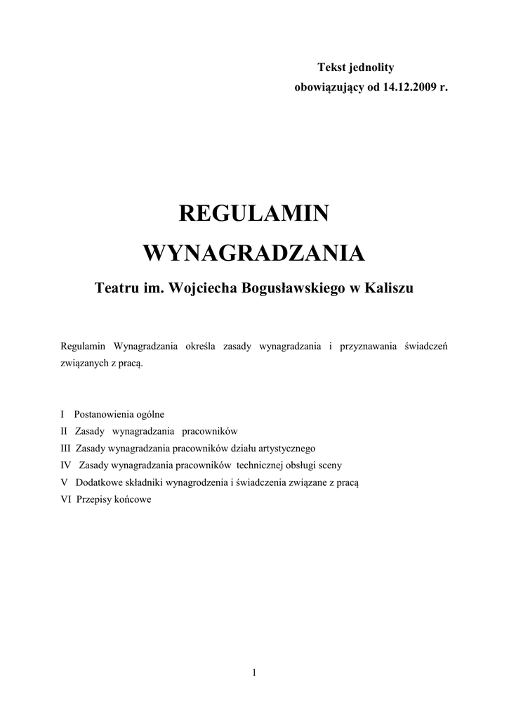 Tekst jednolity obowiązujący od 14.12.2009 r. REGULAMIN WYNAGRADZANIA Teatru im. Wojciecha Bogusławskiego w Kaliszu Regulamin Wynagradzania określa zasady wynagradzania i przyznawania świadczeń związanych z pracą. I Postanowienia ogólne II Zasady wynagradzania pracowników III Zasady wynagradzania pracowników działu artystycznego IV Zasady wynagradzania pracowników technicznej obsługi sceny V Dodatkowe składniki wynagrodzenia i świadczenia związane z pracą VI Przepisy końcowe 1 I POSTANOWIENIA OGÓLNE Podstawę prawną Regulaminu Wynagradzania Teatru im. Wojciecha Bogusławskiego w Kaliszu stanowią; 1. Ustawa z dnia 25 października 1991 roku o organizowaniu i prowadzeniu działalności kulturalnej (Dz. U. z 1997r. Nr 110, poz. 721 z późn. zm.), 2. Rozporządzenie Ministra Kultury i Sztuki z dnia 31 marca 1992 roku w sprawie zasad wynagradzania pracowników niektórych instytucji kultury ( Dz. U. z 1992r. Nr 35, poz. 151 z późn. zm.). 3. Ustawa z dnia 26 czerwca 1974r. Kodeks pracy (tekst jedn.: Dz. U z 1998r. Nr 21, poz. 94 ze zm.). §1 Postanowienia Regulaminu Wynagradzania, zwanego dalej Regulaminem, obowiązują wszystkich pracowników Teatru bez względu na rodzaj wykonywanej pracy, wymiar czasu pracy i zajmowane stanowisko. Ilekroć w Regulaminie jest mowa o: pracowniku – oznacza to osobę zatrudnioną na podstawie umowy o pracę, pracodawcy – oznacza to Teatr im. W. Bogusławskiego w Kaliszu, przełożonym – oznacza to osobę bezpośrednio przełożoną w stosunku do pracownika. §2 1. Pracownikowi przysługuje wynagrodzenie określone w umowie o pracę, jednak nie niższe od minimalnego wynagrodzenia ustalonego na podstawie ustawy z dnia 10.10.2002 r. o minimalnym wynagrodzeniu za pracę (Dz.U. Nr 200 poz. 1679 ) i obwieszczonego przez Prezesa Rady Ministrów. 2. Ustala się: a) Tabelę zaszeregowania stanowisk pracy i dodatków funkcyjnych – Załącznik nr 1 b) Tabelę miesięcznych stawek wynagrodzeń zasadniczych – Załącznik nr 2 c) Tabelę kwotowych stawek (ryczałtu / honorarium) za granie ról i obsługę sceny – Załącznik nr 3 d) Regulamin premiowania – Załącznik nr 4 2 §3 Wynagrodzenie Dyrektora Teatru ustala organizator. II ZASADY WYNAGRADZANIA PRACOWNIKÓW §4 Wynagrodzenia pracowników oparte są na miesięcznym systemie wynagradzania. §5 1. Postanowienia Regulaminu określają zasady wynagradzania, przyznawania i wypłacania składników wynagradzania, dodatków i innych świadczeń, którymi są: 1) wynagrodzenie zasadnicze 2) dodatek za wysługę lat 3) dodatek funkcyjny 4) stawki za: a) przedstawienia b) prowadzenie przedstawień c) za nagłe zastępstwo aktora i inspicjenta d) obsługę przedstawień 5) premię regulaminową i uznaniową 6) dodatkowe wynagrodzenie za pracę w porze nocnej 7) dodatek za pracę w warunkach szkodliwych 8) nagrody 9) wynagrodzenie za czas choroby 10) świadczenia urlopowe 11) diety i inne należności z tytułu podróży służbowej 12) odprawa emerytalna 13) dodatek za upowszechnianie kultury w terenie 14) dodatek dla kierowcy 2. Składniki wynagrodzenia zależne są od wymiaru czasu pracy. 3 §6 1. Struktura wynagradzania oparta jest na Regulaminie Organizacyjnym. 2. Z przyjętej w ust. 1 struktury wynagrodzeń wynika konstrukcja zasad wynagradzania oparta na następujących systemach płac: a) czasowo-premiowym b) czasowo-ryczałtowym c) czasowo-premiowo-ryczałtowym 3. Za pracę wykonaną na rzecz Teatru, po spełnieniu wymogów określonych Regulaminem pracownikowi przysługują następujące składniki wynagrodzenia: a/ zespół artystyczny: składniki wymienione w § 5 ust. 1 pkt. 1, 2, 4, 6 - 13 b/ zespół techniczny i obsługi sceny: składniki wymienione w § 5 ust. 1 pkt. 1–3 , 4 „a” i „d”, 5 -13 c/ pracownicy administracyjno-ekonomiczni i pozostała obsługa: składniki wymienione w § 5 ust. 1 pkt. 1-3 i 5 - 14 4. Aktor za czas pracy faktycznie wykonanej otrzymuje wynagrodzenie wymienione w § 5 ust. 1 pkt 1 i 4 z tytułu działalności twórczej, które podlega przepisom ustawy o prawie autorskim i prawach pokrewnych z dnia 4.02.1994 r. o prawie autorskim i prawach pokrewnych (tj. Dz.U. Nr 80 z 2000 r. z póź. zmianami) tylko za czas pracy faktycznie wykonywanej. Wynagrodzenie wypłacane za czas nieświadczenia pracy z tytułu usprawiedliwionej nieobecności podlega zasadom ogólnym w zakresie przepisów podatkowych. 5. Dyrektor, w formie zarządzenia, określa podział zadań pracownika wynikający z zakresu zadań, obowiązków i uprawnień na te, które mają charakter twórczy stosownie do przepisów ustawy o prawie autorskim i prawach pokrewnych (tj. Dz.U. Nr 80 z 2000 r. z póź. zmianami) i na pozostałe. §7 Wynagrodzenie przysługuje za pracę wykonaną, odpowiednio do rodzaju wykonywanej pracy i kwalifikacji wymaganych przy jej wykonywaniu oraz ilości i jakości świadczonej pracy. Za czas niewykonywania pracy pracownik zachowuje prawo do wynagrodzenia, jeżeli przepisy prawa pracy tak stanowią. §8 Za czas pracy w niedzielę i święta pracownikowi przysługuje jeden dzień wolny od pracy. 4 §9 1. Pracownikom zatrudnionym na stanowiskach związanych z kierowaniem zespołem pracowników przysługuje dodatek funkcyjny. Wysokość dodatku zgodnie z tabelą zaszeregowania stanowisk pracy ustala Dyrektor. 2. Dodatek o którym mowa w pkt. 1 może być przyznany pracownikowi zatrudnionemu na stanowisku nie związanym z kierowaniem zespołem, koordynującemu wykonanie określonych zadań. § 10 1. W ramach posiadanych środków można tworzyć fundusz nagród w wysokości do 5 % środków na wynagrodzenia osobowe. 2. Fundusz przeznacza się na nagrody dla pracowników Teatru, za szczególne osiągnięcia w pracy zawodowej. 3. Nagrody winny być przyznane na podstawie wniosków składanych przez kierowników działów. 4. Nagrody przyznaje i ustala ich wysokość Dyrektor Teatru. III ZASADY WYNAGRADZANIA PRACOWNIKÓW DZIAŁU ARTYSTYCZNEGO § 11 1. Aktorzy i in