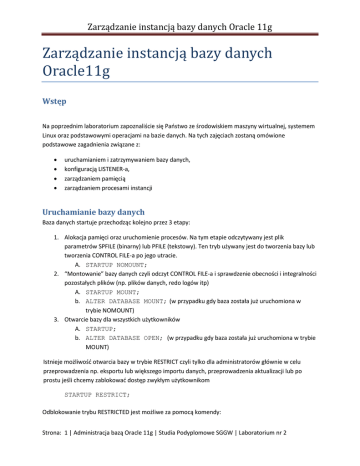 Zarządzanie instancją bazy danych Oracle 11g Zarządzanie instancją bazy danych Oracle11g Wstęp Na poprzednim laboratorium zapoznaliście się Państwo ze środowiskiem maszyny wirtualnej, systemem Linux oraz podstawowymi operacjami na bazie danych. Na tych zajęciach zostaną omówione podstawowe zagadnienia związane z: uruchamianiem i zatrzymywaniem bazy danych, konfiguracją LISTENER-a, zarządzaniem pamięcią zarządzaniem procesami instancji Uruchamianie bazy danych Baza danych startuje przechodząc kolejno przez 3 etapy: 1. Alokacja pamięci oraz uruchomienie procesów. Na tym etapie odczytywany jest plik parametrów SPFILE (binarny) lub PFILE (tekstowy). Ten tryb używany jest do tworzenia bazy lub tworzenia CONTROL FILE-a po jego utracie. A. STARTUP NOMOUNT; 2. “Montowanie” bazy danych czyli odczyt CONTROL FILE-a i sprawdzenie obecności i integralności pozostałych plików (np. plików danych, redo logów itp) A. STARTUP MOUNT; b. ALTER DATABASE MOUNT; (w przypadku gdy baza została już uruchomiona w trybie NOMOUNT) 3. Otwarcie bazy dla wszystkich użytkowników A. STARTUP; b. ALTER DATABASE OPEN; (w przypadku gdy baza została już uruchomiona w trybie MOUNT) Istnieje możliwość otwarcia bazy w trybie RESTRICT czyli tylko dla administratorów głównie w celu przeprowadzenia np. eksportu lub większego importu danych, przeprowadzenia aktualizacji lub po prostu jeśli chcemy zablokować dostęp zwykłym użytkownikom STARTUP RESTRICT; Odblokowanie trybu RESTRICTED jest możliwe za pomocą komendy: Strona: 1 | Administracja bazą Oracle 11g | Studia Podyplomowe SGGW | Laboratorium nr 2 Zarządzanie instancją bazy danych Oracle 11g ALTER SYSTEM DISABLE RESTRICTED SESSION; Zatrzymywanie bazy danych Bazę danych można zamykać na kilka różnych sposobów: Zatrzymanie normalne (domyślne). Baza danych czeka aż wszyscy użytkownicy sami rozłączą się. Ponowny start bazy nie wymaga odtwarzania o SHUTDOWN NORMAL; (lub po prostu SHUTDOWN) Zatrzymanie po zakończeniu wszystkich rozpoczętych transakcji. Ponowne uruchomienie bazy nie wymaga odtwarzania O SHUTDOWN TRANSACTIONAL; Zatrzymanie natychmiastowe. Wszystkie działające transakcje są wycofywane, a użytkownicy rozłączani. Ponowne uruchomienie bazy nie wymaga odtwarzania O SHUTDOWN IMMEDIATE; Zatrzymanie awaryjne. Instancja przestaje działać bez wcześniejszych ostrzeżeń i oczekiwania na normalne zakończenie transakcji. Należy stosować ten typ zatrzymywania jeśli żaden z powyższych nie działa, baza działa w sposób nieprzewidywalny lub są problemy z jej uruchomieniem. Ponowne uruchomienie bazy wymaga odtwarzania (najczęściej wykonywane automatycznie) O SHUTDOWN ABORT; Konfiguracja LISTENER-a LISTENER jest procesem nasłuchującym na konkretnym porcie (domyślnie 1521) i adresie IP. Umożliwia zdalne łączenie się do bazy danych przez sieć. Najprostsza konfiguracja wymaga określenia nazwy serwera lub adresu IP oraz portu na którym ma nasłuchiwać. Odpowiednich wpisów dokonujemy w pliku listener.ora znajdującym się w katalogu $ORACLE_HOME/network/admin: LISTENER = (DESCRIPTION = (ADDRESS = (PROTOCOL = TCP)(HOST = oracle1.localdomain)(PORT = 1521)) ) LISTENER bez dodatkowej konfiguracji może uzyskać informacje o działających na tym samym serwerze instancjach bazy Oracle i serwować usługę dostępu do nich z zewnątrz. Procesem, który automatycznie rejestruje instancję bazy w LISTENER jest PMON. Niemniej jednak warto na stałe skonfigurować LISTENER-a aby wiedział, że ma serwować usługi do danej instancji bazy. Robi się to poprzez ręczną edycję pliku listener.ora lub za pomocą narzędzia graficznego Oracle Net Manager uruchamianego komendą Strona: 2 | Administracja bazą Oracle 11g | Studia Podyplomowe SGGW | Laboratorium nr 2 Zarządzanie instancją bazy danych Oracle 11g netmgr Narzędzie umożliwia konfigurację LISTENER-a Aby na stałe wpisać w konfigurację serwowanie usług sieciowych do konkretnej instancji bazy należy wybrać opcję Database Services jak na rysunku poniżej: Należy wypełnić 3 pola zaznaczone w czerwonym prostokącie, a więc: Strona: 3 | Administracja bazą Oracle 11g | Studia Podyplomowe SGGW | Laboratorium nr 2 Zarządzanie instancją bazy danych Oracle 11g Global Database Name – pełna nazwa instancji (orcl) Oracle Home Directory – czyli $ORACLE_HOME SID – skrócona nazwa instancji czyli orcl Po zapisaniu zmian (File -> Save Network Configuration) i ponownym uruchomieniu LISTENER-a zmiany zostaną wprowadzone. Kod wygenerowany przez narzędzie graficzne można zobaczyć otwierając plik listener.ora SID_LIST_LISTENER = (SID_LIST = (SID_DESC = (GLOBAL_DBNAME = orcl) (ORACLE_HOME = /u01/app/oracle/product/11.2.0/dbhome_1) (SID_NAME = orcl))) Najprostsze zarządzanie LISTENER-em sprowadza się do jego uruchomienia, sprawdzania statusu oraz zatrzymywania: lsnrctl start lsnrctl status lsnrctl stop Oracle Net Manager umożliwia również: dodawanie nowego adresu i portu nasłuchu w przypadku jeśli konieczne jest nasłuchiwanie na kilku interfejsach sieciowych (w przypadku maszyny z kilkoma kartami sieciowymi) zmianę portu nasłuchu rejestrację instancji bazy do obsługi konfigurację aliasów sieciowych po stronie klienta konfigurację uwierzytelnienia z katalogów LDAP Zaawansowanej obsługi sieciowej z szyfrowaniem, load balancing itp. Zarządzanie pamięcią Strona: 4 | Administracja bazą Oracle 11g | Studia Podyplomowe SGGW | Laboratorium nr 2 Zarządzanie instancją bazy danych Oracle 11g Jednym z kluczowych zadań administracyjnych jest konfiguracja i zarządzanie pamięcią SGA i PGA w instancji bazy danych. Najprostszym sposobem na konfigurację pamięci jest włączenie automatycznego zarządzania pamięcią. Wykonuje się to ustawiając parametr MEMORY_TARGER = nM gdzie n oznacza ilość megabajtów przydzielonych wspólnie na SGA i PGA Powyższy parametr ustawić można poniższą komendą: ALTER SYSTEM SET MEMORY_TARGET = 