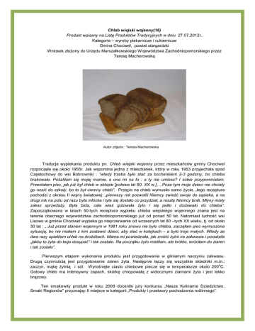 Chleb wiejski wojenny(16) Produkt wpisany na Listę Produktów Tradycyjnych w dniu 27.07.2012r. Kategoria – wyroby piekarnicze i cukiernicze Gmina Chociwel, powiat stargardzki Wniosek złoŜony do Urzędu Marszałkowskiego Województwa Zachodniopomorskiego przez Teresę Macherowską Autor zdjęcia : Teresa Macherowska Tradycja wypiekania produktu pn. Chleb wiejski wojenny przez mieszkańców gminy Chociwel rozpoczęła się około 1955r. Jak wspomina jedna z mieszkanek, która w roku 1953 przyjechała spod Częstochowy do wsi Bobrowniki : ”wtedy trzeba było stać za bochenkiem 2-3 godziny, bo chleba brakowało. PoŜaliłam się mojej mamie, a ona mi na to : a ty nie umiesz? I sobie przypomniałam. Przestałam piec, jak juŜ był chleb w sklepie [połowa lat 60. XX w.]….Poza tym moje dzieci nie chciały go nosić do szkoły, bo to był ciemny chleb”. Przepis na chleb wymusiło samo Ŝycie. Jego receptura pochodzi z okresu II wojny światowej: „pierwszy rok pozwolili Niemcy zwieźć swoje do sąsieka, a na drugi rok na polu od razu była młócka i tyle się dostało co przydział, a resztę Niemcy brali. Młyny miały zakaz sprzedaŜy. Była bida, cała wieś gotowała Ŝyto i się jadło i dodawało do chleba”. Zapoczątkowana w latach 50-tych receptura wypieku chleba wiejskiego wojennego znana jest na terenie obecnego województwa zachodniopomorskiego juŜ od ponad 50 lat. Natomiast ludność wsi Lisowo w gminie Chociwel wypieka go nieprzerwanie od wczesnych lat 80 –tych XX wieku, tj. od około 30 lat : „ JuŜ przed stanem wojennym w 1981 roku znowu nie było chleba, zaczęłam piec wymuszona sytuacją, bo nie miałam z kim zostawić dzieci, aby stać w kolejkach – a było troje małych. Wtedy ze dwa razy upiekłam chleb na droŜdŜach. Mama mi powiedziała, jak zrobić Ŝytni na zakwasie i poradziła „jakby to Ŝyta do tego dosypać” i tak zostało. Na początku Ŝyto mieliłam, ale krótko, wróciłam do ziaren i tak zostało”. Pierwszym etapem wykonania produktu jest przygotowanie w glinianym naczyniu zakwasu. Drugą czynnością jest przygotowanie ziaren Ŝyta. Następnie łączy się wszystkie składniki m.in.: o zaczyn, mąkę Ŝytnią i sól. Wyrośnięte ciasto chlebowe piecze się w temperaturze około 200 C. Gotowy chleb ma intensywny zapach, skórkę chropowatą z widocznymi ziarnami Ŝyta i jest lekko brązowy. Ten smakowity produkt w roku 2009 doceniło jury konkursu „Nasze Kulinarne Dziedzictwo. Smaki Regionów” przyznając II miejsce w kategorii „Produkty i przetwory pochodzenia roślinnego”.