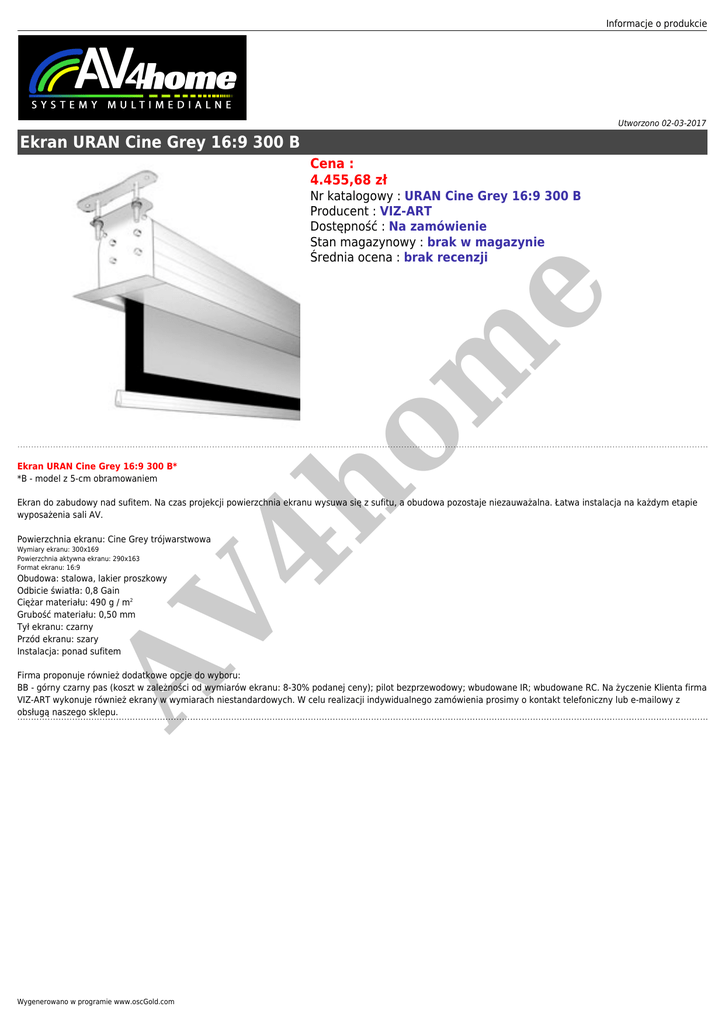 Informacje o produkcie Utworzono 02-03-2017 Ekran URAN Cine Grey 16:9 300 B Cena : 4.455,68 zł 4h Ekran URAN Cine Grey 16:9 300 B* *B - model z 5-cm obramowaniem om e Nr katalogowy : URAN Cine Grey 16:9 300 B Producent : VIZ-ART Dostępność : Na zamówienie Stan magazynowy : brak w magazynie Średnia ocena : brak recenzji Ekran do zabudowy nad sufitem. Na czas projekcji powierzchnia ekranu wysuwa się z sufitu, a obudowa pozostaje niezauważalna. Łatwa instalacja na każdym etapie wyposażenia sali AV. Powierzchnia ekranu: Cine Grey trójwarstwowa Wymiary ekranu: 300x169 Powierzchnia aktywna ekranu: 290x163 Format ekranu: 16:9 AV Obudowa: stalowa, lakier proszkowy Odbicie światła: 0,8 Gain Ciężar materiału: 490 g / m2 Grubość materiału: 0,50 mm Tył ekranu: czarny Przód ekranu: szary Instalacja: ponad sufitem Firma proponuje również dodatkowe opcje do wyboru: BB - górny czarny pas (koszt w zależności od wymiarów ekranu: 8-30% podanej ceny); pilot bezprzewodowy; wbudowane IR; wbudowane RC. Na życzenie Klienta firma VIZ-ART wykonuje również ekrany w wymiarach niestandardowych. W celu realizacji indywidualnego zamówienia prosimy o kontakt telefoniczny lub e-mailowy z obsługą naszego sklepu. Wygenerowano w programie www.oscGold.com