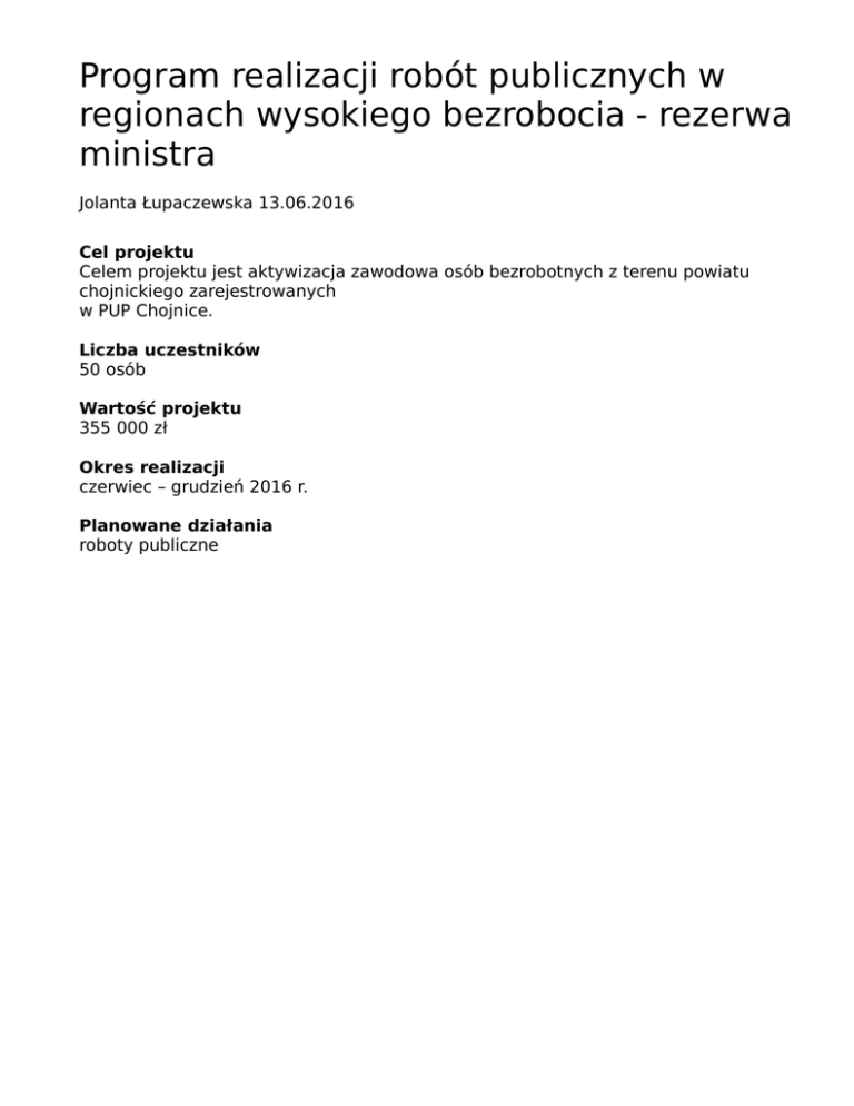 Program realizacji robót publicznych w regionach wysokiego bezrobocia - rezerwa ministra Jolanta Łupaczewska 13.06.2016 Cel projektu Celem projektu jest aktywizacja zawodowa osób bezrobotnych z terenu powiatu chojnickiego zarejestrowanych w PUP Chojnice. Liczba uczestników 50 osób Wartość projektu 355 000 zł Okres realizacji czerwiec – grudzień 2016 r. Planowane działania roboty publiczne