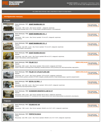 MACHINERY EUROPE s.r.o., Hněvkovská 42, 148 00 Praha 4, Czechy tel./fax: +420 272 935 288, e-mail: [email protected] Aby uzyskać więcej informacji i zdjęć, proszę kliknąć na zdjęcie lub nazwę maszyny. Introligatorskie maszyny Krajarki Numer referencyjny: 11617 ADAST MAXIMA MS 115 Aby uzyskać więcej informacji, kliknij tutaj. Krajarka Rok produkcji : 1988 ; Licznik: - ;Max. Format / szerokość: - ; dostępność: natychmiast ; maksymalna szerokość cięcia 115 cm, Thinkcut program, poduszka powietrzna, 5 noży zapasowych Numer referencyjny: 17502 ADAST MAXIMA MS 115 - 1 Aby uzyskać więcej informacji, kliknij tutaj. Krajarka Rok produkcji : 1983 ; Licznik: - ;Max. Format / szerokość: 115 mm (4,5") ; dostępność: natychmiast ; stół powietrzny Numer referencyjny: 15524 ADAST MAXIMA MS 115 - 2 Aby uzyskać więcej informacji, kliknij tutaj. Krajarka Rok produkcji : około 1981 ; Licznik: - ;Max. Format / szerokość: 115 mm (4,5") ; dostępność: natychmiast ; originalny program, stół powietrzny Numer referencyjny: 16646 ADAST MAXIMA MS 80 E Aby uzyskać więcej informacji, kliknij tutaj. Krajarka Rok produkcji : około 1989 ; Licznik: - ;Max. Format / szerokość: 800 mm (31,5") ; dostępność: natychmiast ; program, stół powietrzny, zasłony bezpieczeństwa Numer referencyjny: 16558 POLAR 115 X OFERTA SPECJALNA Aby uzyskać więcej informacji, kliknij tutaj. Krajarka Rok produkcji : 2004 ; Licznik: - ;Max. Format / szerokość: 1150 mm (45,3") ; dostępność: 2017-04-28 ; program, sterowanie z kolorowego ekranu dotykowego, poduszka powietrzna, boczny powietrzny stół, strefy bezpieczeństwa, waga papieru,... Numer referencyjny: 16630 POLAR 137 X PLUS FLOW LINE OFERTA SPECJALNA Aby uzyskać więcej informacji, kliknij tutaj. Krajarka Rok produkcji : 2011 ; Licznik: - ;Max. Format / szerokość: 1370 mm (53,9") ; dostępność: natychmiast ; gilotyna centralna, gilotyna, podnośnik LW 1200-6, utrząsarka, poduszka powietrzna, funkcje zabezpieczające, oryginalne oprogramowanie Numer referencyjny: 16629 SEYPA 132 PMC - 1 Aby uzyskać więcej informacji, kliknij tutaj. Krajarka Rok produkcji : około 1982 ; Licznik: - ;Max. Format / szerokość: 1320 mm (52,0") ; dostępność: natychmiast ; stół powietrzny, kryty bezpieczeństwa, program Numer referencyjny: 14564 SCHNEIDER SENATOR E-LINE 92 CT Krajarka Aby uzyskać więcej informacji, kliknij tutaj. Rok produkcji : 2008 ; Licznik: - ;Max. Format / szerokość: 920 mm (36,2") ; dostępność: natychmiast ; komputerowy panel sterowania TFT, zamknięty tylni stół, masywne żeliwne ramy, zawora bezpieczeństwa na podczerwień, pneumatyczne... Trójnoże Numer referencyjny: 16612 KOLBUS HD 140 Aby uzyskać więcej informacji, kliknij tutaj. Trójnóż Rok produkcji : 1990 ; Licznik: - ;Max. Format / szerokość: 305x420 x mm (12,0 "x 16,5") ; dostępność: natychmiast ; Numer referencyjny: 13537 PERFECTA D30/42 Aby uzyskać więcej informacji, kliknij tutaj. Trójnóż Rok produkcji : około 1980 ; Licznik: - ;Max. Format / szerokość: 300x420 x mm (11,8 "x 16,5") ; dostępność: natychmiast ; 1 MACHINERY EUROPE s.r.o., Hněvkovská 42, 148 00 Praha 4, Czechy tel./fax: +420 272 935 288, e-mail: [email protected] Numer referencyjny: 12584 STRATI QS 70 Aby uzyskać więcej informacji, kliknij tutaj. Trójnóż Rok produkcji : 2007 ; Licznik: - ;Max. Format / szerokość: 260x380 x mm (10,2 "x 15,0") ; dostępność: natychmiast ; 3 zestawy noży ze stali utwardzanej, maks. prędkość 23 cyklu/ min. Falcerki Numer referencyjny: 16648 GUK K 49 / 4 / 1 Aby uzyskać więcej informacji, kliknij tutaj. Falcerka Rok produkcji : 1990 ; Licznik: - ;Max. Format / szerokość: 490x700 x mm (19,3 "x 27,6") ; dostępność: natychmiast ; 4 kieszenie składające, 1 nóż krzyżowy, próżniowe koło ładujące, mobilny wykładacz, pokrywa wygłuszająca Numer referencyjny: 16508 GUK ZK 500 Aby uzyskać więcej informacji, kliknij tutaj. Falcerka Rok produkcji : 2012 ; Licznik: - ;Max. Format / szerokość: 300x420 x mm (11,8 "x 16,5") ; dostępność: natychmiast ; agregat nożowy ZK 500, max. wymiary po złożeniu 300 x 210 mm, min. wymiary po złożeniu 150 x 210 mm, obróbka od 4 do 40 stron, regulacja... Numer referencyjny: 16662 HERZOG HEYMANN S 19 Aby uzyskać więcej informacji, kliknij tutaj. Falcerka Rok produkcji : 1983 ; Licznik: - ;Max. Format / szerokość: 500x700 x mm (19,7 "x 27,6") ; dostępność: natychmiast ; nakładanie strumieniowe, kółka podciśnieniowe, jedno głowicowy system nakadania, 4 kieszenie składające, 1 nóż krzyżowy, 4 kieszenie... Numer referencyjny: 16575 MULTIMASTER CAS 52/4 OFERTA SPECJALNA Aby uzyskać więcej informacji, kliknij tutaj. Falcerka Rok produkcji : 2015 ; Licznik: - ;Max. Format / szerokość: 520x850 x mm (20,5 "x 33,5") ; dostępność: natychmiast ; 4 kasety falcujące, kontrola podwójnego nałożenia, min. długość składania 350 mm, pamięć programowania do 60 powtarzających się cykli,... Numer referencyjny: 15515 MULTIPLI CAS 52 Aby uzyskać więcej informacji, kliknij tutaj. Falcerka Rok produkcji : 2001 ; Licznik: - ;Max. Format / szerokość: 520x850 x mm (20,5 "x 33,5") ; dostępność: natychmiast ; 4 kieszenie, 2 noże krzyżowe, prędkość pracy 200 arkuszy na minutę, gramatura papieru 40- 250g/m2, max. długość składanego arkusza 465 mm Numer referencyjny: 13539 STAHL 78 6/4/4 Aby uzyskać więcej informacji, kliknij tutaj. Falcerka Rok produkcji : 1995 ; Licznik: - ;Max. Format / szerokość: - ; dostępność: natychmiast ; podajnik strumieniowy RD 78T, 3+3 kasety TD 78/6, 2+2 kasety TD 66/4, 2+2 kasety TD 56/4, SBP 46 Numer referencyjny: 16550 STAHL K 56/4 KTL - FB2 OFERTA SPECJALNA Aby uzyskać więcej informacji, kliknij tutaj. Falcerka Rok produkcji : 1982 ; Licznik: - ;Max. Format / szerokość: 560x900 x mm (22,0 "x 35,4") ; dostępność: natychmiast ; stosowy nakładacz FK 56B2, głowica nakładająca Tremat, ciśnieniowe kółka, 4