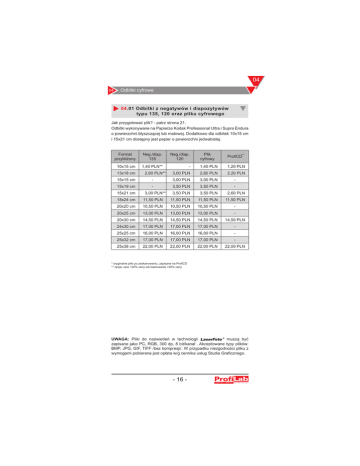 04 04 Odbitki cyfrowe 04.01 Odbitki z negatywów i diapozytywów typu 135, 120 oraz pliku cyfrowego Jak przygotować plik? - patrz strona 21. Odbitki wykonywane na Papierze Kodak Professional Ultra i Supra Endura o powierzchni błyszczącej lub matowej. Dodatkowo dla odbitek 10x15 cm i 15x21 cm dostępny jest papier o powierzchni jedwabistej. Format przybliżony Neg./diap. 135 10x15 cm 1,40 PLN** 15x15 cm - 13x18 cm 15x19 cm 15x21 cm 18x24 cm 2,60 PLN** - 3,00 PLN** 11,50 PLN Neg./diap. 120 Plik cyfrowy ProfiCD* - 1,40 PLN 1,20 PLN 3,00 PLN 3,00 PLN 3,00 PLN 3,50 PLN 3,50 PLN 11,50 PLN 2,60 PLN 3,50 PLN 3,50 PLN 11,50 PLN 2,20 PLN - 2,60 PLN 11,50 PLN 20x20 cm 10,50 PLN 10,50 PLN 10,50 PLN 20x30 cm 14,50 PLN 14,50 PLN 14,50 PLN 14,50 PLN 25x25 cm 16,00 PLN 16,00 PLN 16,00 PLN - 20x25 cm 24x30 cm 25x32 cm 25x38 cm 13,00 PLN 17,00 PLN 17,00 PLN 22,00 PLN 13,00 PLN 17,00 PLN 17,00 PLN 22,00 PLN 13,00 PLN 17,00 PLN 17,00 PLN 22,00 PLN - 22,00 PLN * oryginalne pliki po zeskanowaniu, zapisane na ProfiCD ** opcja: opis +20% ceny lub kadrowanie +50% ceny UWAGA: Pliki do naświetleń w technologii muszą być zapisane jako PC, RGB, 300 dp, 8 bit/kanał . Akceptowane typy plików: BMP, JPG, GIF, TIFF /bez kompresji/. W przypadku niezgodności pliku z wymogami pobierana jest opłata w/g cennika usług Studia Graficznego. - 16 - 04 04 Odbitki cyfrowe 04.02 Odbitki na papierze metallic z negatywów, diapozytywów typu 135, 120 i plików cyfrowych Jak przygotować plik? - patrz strona 21. Papier fotograficzny Color Metallic Paper jest określany jako materiał o niespotykanych walorach wizualnych doskonale sprawdzający się w fotografii portretowej. Osiąga to między innymi dzięki metalicznemu połyskowi, tworzącemu atrakcyjny efekt wizualny. Format przybliżony* Negatyw, diapozytyw, plik cyfrowy 10x15 cm 13x18 cm 15x15 cm 15x19 cm 15x21 cm 20x20 cm 20x25 cm 20x30 cm 2,20 PLN** 3,10 PLN 4,50 PLN 4,50 PLN 4,50 PLN 15,00 PLN 16,00 PLN 18,00 PLN * do formatu 15x21 cm zdjęcia z opisu + 20% ceny lub kadrowanie + 50% ceny ** Usługa nie wykonywana z materiałów typu 120 04.03 Odbitki z filmów APS Usługa Wywołanie filmu APS + Indeks Print Odbitka 10x15 cm z filmu APS Odbitka 10x18 cm z filmu APS Odbitka 10x25 cm z filmu APS Zdjęcia z opisu - 17 - Cena 15,00 PLN 1,60 PLN 2,20 PLN 3,20 PLN +20% ceny 04 04 Odbitki cyfrowe 04.04 Odbitki z plików cyfrowych - samodzielne składanie zleceń "Foto Kiosk". Foto Kiosk - urządzenie pozwalające na szybką realizację usługi. Kiosk pozwala dobrać format, ilość i inne opcje fotograficzne dla wybranych zdjęć. Obsługiwane nośniki: CD standard, Compact Flash I i II, Smart Media, XD-Picture Card, Memory Stick, SD, Duo Memory Stick. Format przybliżony 9x13 cm 10x15 cm 13x18 cm 15x21 cm 20x25 cm 20x30 cm 15 min.* 1 godzina 1,20 PLN 1,40 PLN 2,60 PLN 3,50 PLN - 1,20 PLN 1,40 PLN 2,60 PLN 3,50 PLN - 6 godzin 1,10 PLN 1,20 PLN 2,30 PLN 3,20 PLN 13,00 PLN 14,50 PLN * dostępne tylko dla papieru błyszczącego 04.05 Druk natychmiastowy - wydruki z plików cyfrowych - samodzielne składanie zleceń Urządzenie fotokiosk dzięki zainstalowaniu w nim drukarki termosublimacyjnej, umożliwia natychmiastowe wykonanie zdjęć w dowolnej konfiguracji. Rodzaj Format przybliżony odbitka miniatury odbitka specjalna: kalendarz, index, 10x15 cm 13x18 cm 15x20 cm 1,50 PLN 2,70 PLN 3,60 PLN 2,49 PLN 3,20 PLN 4,20 PLN Cechy: - Błyskawiczne otrzymanie odbitek w wybranym formacie. - Możliwość kreacji zdjęcia według własnego upodobania. - Dostępne opcje kadrowania i zmiany kolorystyki. - Trzy formaty zdjęć do wyboru. Zastosowanie: - Dla osób ceniących szybkość i prywatność. - Wprowadzanie w prosty sposób napisów, ramek, kalendarzy do wybranych zdjęć. - idealne rozwiązanie dla osób, które same chcą decydować o końcowym efekcie odbitek. - 18 - 04 04 Odbitki cyfrowe 04.06 Odbitki cyfrowe specjalne - fotoksiążka. Fotoksiążka wykonana jest na klasycznym papierze fotograficznym o wybranej strukturze. Projekt fotoksiążki możliwy jest do stworzenia w łatwy sposób dzięki specjalnie do tego stworzonej aplikacji dostępnej bezpłatnie (do pobrania na stronie www.profitransfer.pl). Sam decydujesz, ile zdjęć i w jakim formacie chcesz umieścić w swoim albumie. Wiele dostępnych opcji kreacji zdjęć, zapewnia stworzenie niepowtarzalnego wyglądu Twojego albumu. 12 stronicowa Błysk / Mat 22 stronicowa Błysk / Mat 12 stronicowa Metalic / Jedwab 22 stronicowa Metalic / Jedwab 32 stronicowa Błysk / Mat 15 x 14 cm 20 x 14 cm 25 x 18 cm 29,99 PLN 39,99 PLN 49,99 PLN 45.99 PLN 59.99 PLN 79.99 PLN 37,49 PLN 49,99 PLN - 57,49 PLN 74,99 PLN - - - 109.99 PLN 04.07 Odbitki cyfrowe specjalne - odbitki w formacie legitymacyjnym, dyplomowym i paszportowym Usługa Komplet zdjęć legitymacyjnych lub dyplomowych (4szt.) Cena 20,00 PLN Wykonywane są z negatywów, diapozytywów 135 oraz 120 i plików cyfrowych. 04.08 Zdjęcia do dokumentów Cena za wykonanie zdjęcia i odbitki (4 szt.) Legitymacja, dowód osobisty 30,00 PLN Dyplom, paszport, wiza 40,00 PLN - 19 - 04 04 Odbitki cyfrowe 04.09 Odbitki cyfrowe specjalne. Zdjęcia albumowe Ilość sztuk Układ z 3 lub 6 zdjęciami 17,00 PLN Jedna sztuka Powyżej 3 sztuk (cena za sztukę*) Powyżej 5 sztuk (cena za sztukę*) 14,50 PLN 10,50 PLN Cena Układ z 9 lub 15 zdjęciami 20,50 PLN 17,50 PLN 16,00 PLN * dotyczy tego samego tematu w większej liczbie kopii. 04.10 Odbitki cyfrowe specjalne. Karty z życzeniami (wg. wzorów) Liczba Jedna sztuka Powyżej 20 sztuk (cena za sztukę*) Powyżej 50 sztuk (cena za sztukę*) * dotyczy tego samego tematu w większej liczbie kopii. Cena 3,60 PLN 3,20 PLN 2,80 PLN 04.11 Odbitki cyfrowe - informacje. Praca z laborantem Rodzaj Minimalka do 15 min. 1 godzina Cena 20,00 PLN 70,00 PLN - 20 - 04 04 Odbitki cyfrowe 04.12 Odbitki cfrowe - informacje. - opcje kadrowania Opcje kadrowania mają duże znaczenie, gdy plik graficzny, z którego zamawiamy zdjęcia ma inne proporcje niż odbitka /
