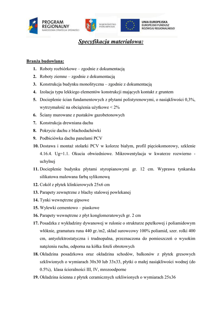 Specyfikacja materiałowa: Branża budowlana: 1. Roboty rozbiórkowe – zgodnie z dokumentacją 2. Roboty ziemne – zgodnie z dokumentacją 3. Konstrukcja budynku monolityczna – zgodnie z dokumentacją 4. Izolacja typu lekkiego elementów konstrukcji mających kontakt z gruntem 5. Docieplenie ścian fundamentowych z płytami polistyrenowymi, o nasiąkliwości 0,3%, wytrzymałość na obciążenia użytkowe < 2% 6. Ściany murowane z pustaków gazobetonowych 7. Konstrukcja drewniana dachu 8. Pokrycie dachu z blachodachówki 9. Podbiciówka dachu panelami PCV 10. Dostawa i montaż stolarki PCV w kolorze białym, profil pięciokomorowy, szklenie 4.16.4. Ug=1.1. Okucia obwiedniowe. Mikrowentylacja w kwaterze rozwierno uchylnej 11. Docieplenie budynku płytami styropianowymi gr. 12 cm. Wyprawa tynkarska silikatowa malowana farbą sylikonową 12. Cokół z płytek klinkierowych 25x6 cm 13. Parapety zewnętrzne z blachy stalowej powlekanej 14. Tynki wewnętrzne gipsowe 15. Wylewki cementowo – piaskowe 16. Parapety wewnętrzne z płyt konglomeratowych gr. 2 cm 17. Posadzka z wykładziny dywanowej w rulonie o strukturze pętelkowej i poliamidowym włóknie, gramatura runa 440 gr./m2, skład surowcowy 100% poliamid, szer. rolki 400 cm, antyelektrostatyczna i trudnopalna, przeznaczona do pomieszczeń o wysokim natężeniu ruchu, odporna na kółka foteli obrotowych 18. Okładzina posadzkowa oraz okładzina schodów, balkonów z płytek gresowych szkliwionych o wymiarach 30x30 lub 33x33, płytki o małej nasiąkliwości wodnej (do 0.5%), klasa ścieralności III, IV, mrozoodporne 19. Okładzina ścienna z płytek ceramicznych szkliwionych o wymiarach 25x36 20. Sufit podwieszany na konstrukcji systemowej kolor biały T15, wypełnienie płytami z włókien mineralnych 600x600x15 mm, krawędź fazowana, powierzchnia z mikroperforacją, współczynnik pochłaniania dźwięku &w = 0,6 – zastosować w pomieszczeniach komunikacji ( pom. 1/1; 1/2; 1/3; 1/17; 2/3; 2/4; 2/14) oraz salach wielofunkcyjnych i multimedialnych ( pom. 1/8; 1/12.1; 1/12.2; 2/1; 2/5.1; 2/5.2) 21. Sufit podwieszany gipsowo – kartonowy jednowarstwowy z poszyciem płytami GKBI – zastosować w sanitariatach ogólnodostępnych i łazienkach. W pozostałych pomieszczeniach sufit tynkowany 22. Dostawa i montaż balustrad stalowych ocynkowanych malowanych proszkowo 23. Dostawa i montaż stolarki płycinowej: a) Sanitariaty ogólnodostępne i łazienki w pokojach – Skrzydło pełne, wypełnienie „plaster miodu”, okleina CPL, ościeżnica stała drewniana, klamka ze stali nierdzewnej, wkładka, kratka wentylacyjna b) Pozostałe pomieszczenia – Skrzydło pełne, wypełnienie płyta wiórowa okleina CPL, ościeżnica stała drewniana, klamka ze stali nierdzewnej, wkładka 24. Malowanie ścian i sufitów farbami emulsyjnymi 25. Dostawa i montaż windy osobowej – dźwig o napędzie hydraulicznym z płynna regulacją, udźwig 630 kg/8 osób, prędkość podnoszenia 0,6 m/s, wykończenia drzwi – stal szlachetna szlifowana, wykończenie kabiny – laminat w kolorze szarym 26. Korytowanie, ułożenie krawężników drogowych na ławie betonowej, wykonanie podbudowy z kruszywa naturalnego i nawierzchni utwardzonej z kruszywa łamanego (grubość warstw dostosować do wymagań normy) 27. Korytowanie, ułożenie obrzezy betonowych, wykonanie podbudowy z kruszywa naturalnego i nawierzchni utwardzonej z kruszywa łamanego (grubość warstw dostosować do wymagań normy) Branża sanitarna: 28. Sieć wodociągowa 29. Sieć kanalizacji sanitarnej 30. Instalacja wodociągowa. Instalacja wodociągowa zostanie wykonana z rur stalowych OC i tworzywowych zgodnie z projektem budowlanym. Wszystkie rurociągi zostaną zaizolowane. Instalacja zostanie wyposażona w armaturę odcinającą i armaturę przy przyborach sanitarnych. Za głównym zaworem odcinającym zostanie załadowany układ pomiarowy. 31. Instalacja kanalizacji wewnętrznej Kanalizacja sanitarna (poziomy, piony i podejścia kanalizacyjne) zostaną wykonane z rur kanalizacyjnych kielichowych PCV łączonych na wcisk. Przybory sanitarne montowane na systemach instalacyjnych lub przegrodach budowlanych stosownie do warunków. Ścieki z kuchni przez łapacz tłuszczów będą odprowadzone do kanalizacji sanitarnej. 32. Instalacja hydrantowa. Instalacja hydrantowa zostanie wykonana z rur stalowych OC i uzbrojona w szafki hydrantowe z wyposażeniem. 33. Technologia kotłowni W kotłowni zostaną zainstalowane 3 jednostki grzewcze wraz z wyposażeniem zgodnym z założeniami projektu. 34. Instalacja c.o. Instalacja c.o. zostanie wykonana z rur stalowych czarnych i tworzywowych zgodnie z projektem budowlanym. Wszystkie rurociągi zostaną zaizolowane. Instalacja zostanie wyposażona w armaturę odcinającą i grzejnikową. Jako elementy grzejne zostaną zainstalowane grzejniki płytowe oraz grzejniki łazienkowe jak w projekcie. 35. Instalacja wentylacji Zostanie zastosowana wentylacja mechaniczna ogólna zgodnie z projektem, przewody z blachy ocynkowanej, izolowane z elementami zakańczającymi 36. Instalacja klimatyzacji Urządzenia klimatyzacyjne zostaną zainstalowane zgodne z projektem Branża elektryczna: 37. Instalacja oświetleniowa a) Układanie przewodów typu YDY 3 i 4x1,5 w korytkach i rurach elektroinstalacyjnych b) Montaż osprzętu elektroinstalacyjnego p.t. c) Montaż opraw oświetleniowych – typ zgodnie z dokumentacją 38. Instalacja gniazd wtykowych i zasilania urządzeń a) Układanie przewodów YDY 3 i 5x2,5 n.t. i w rurach elektroinstalacyjnych b) Montaż osprzętu elektroinstalacyjnego – typ zgodnie z dokumentacją 39. Rozdzielnice elektryczne i WLZ a) Dostarczenie i montaż rozdzielnic elektrycznych R-12, RGNN, RO-1, RO-2, RP-1, RPO b) Wykonanie wlz przewodami YDY ułożonymi w rurach 40. Instalacja logiczna a) Układanie skrętki komputerowej w rurach b) Montaż PEL (zestaw gniazd) c) Montaż puszek podłogowych wyposażonych zgodnie z dokumentacją d) Dostarc