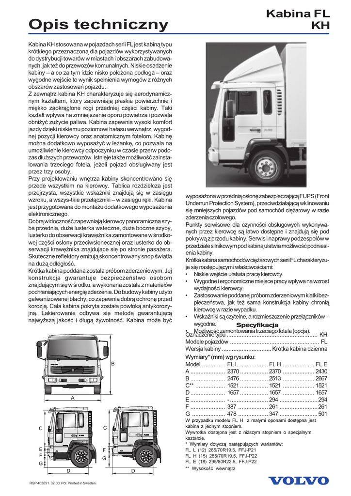 Opis techniczny Kabina KH stosowana w pojazdach serii FL jest kabiną typu krótkiego przeznaczoną dla pojazdów wykorzystywanych do dystrybucji towarów w miastach i obszarach zabudowanych, jak też do przewozów komunalnych. Niskie osadzenie kabiny – a co za tym idzie nisko położona podłoga – oraz wygodne wejście to wynik spełnienia wymogów z różnych obszarów zastosowań pojazdu. Z zewnątrz kabina KH charakteryzuje się aerodynamicznym kształtem, który zapewniają płaskie powierzchnie i miękko zaokrąglone rogi przedniej części kabiny. Taki kształt wpływa na zmniejszenie oporu powietrza i pozwala obniżyć zużycie paliwa. Kabina zapewnia wysoki komfort jazdy dzięki niskiemu poziomowi hałasu wewnątrz, wygodnej pozycji kierowcy oraz anatomicznym fotelom. Kabinę można dodatkowo wyposażyć w leżankę, co pozwala na umożliwienie kierowcy odpoczynku w czasie przerw podczas dłuższych przewozów. Istnieje także możliwość zainstalowania trzeciego fotela, jeżeli pojazd obsługiwany jest przez trzy osoby. Przy projektowaniu wnętrza kabiny skoncentrowano się przede wszystkim na kierowcy. Tablica rozdzielcza jest przejrzysta, wszystkie wskaźniki znajdują się w zasięgu wzroku, a wszys-tkie przełączniki – w zasięgu ręki. Kabina jest przygotowana do montażu dodatkowego wyposażenia elektronicznego. Dobrą widoczność zapewniają kierowcy panoramiczna szyba przednia, duże lusterka wsteczne, duże boczne szyby, lusterko do obserwacji krawężnika zamontowane w środkowej części osłony przeciwsłonecznej oraz lusterko do obserwacji krawężnika znajdujące się po stronie pasażera. Skuteczne reflektory emitują skoncentrowany snop światła na dużą odległość. Krótka kabina poddana została próbom zderzeniowym. Jej konstrukcja gwarantuje bezpieczeństwo osobom znajdującym się w środku, a wykonana została z materiałów pochłaniających energię zderzenia. Do budowy kabiny użyto galwanizowanej blachy, co zapewnia dobrą ochronę przed korozją. Cała kabina pokryta została powłoką antykorozyjną. Lakierowanie odbywa się metodą gwarantującą najwyższą jakość i długą żywotność. Kabina może być B A C C E F F G G D RSP 403691. 02.00. Pol. Printed in Sweden. D Kabina FL KH wyposażona w przednią osłonę zabezpieczającą FUPS (Front Underrun Protection System), przeciwdziałającą wklinowaniu się mniejszych pojazdów pod samochód ciężarowy w razie zderzenia czołowego. Punkty serwisowe dla czynności obsługowych wykonywanych przez kierowcę są łatwo dostępne i znajdują się pod pokrywą z przodu kabiny. Serwis i naprawy podzespołów w przedziale silnikowym pod kabiną ułatwia możliwość podniesienia kabiny. Krótka kabina samochodów ciężarowych serii FL charakteryzuje się następującymi właściwościami: • Niskie wejście ułatwia pracę kierowcy. • Wygodne i ergonomiczne miejsce pracy wpływa na wzrost wydajności kierowcy. • Zastosowanie poddanej próbom zderzeniowym klatki bezpieczeństwa, jak też sama konstrukcja kabiny chronią kierowcę w razie wypadku. • Wskaźniki są czytelne, a rozmieszczenie przełączników – wygodne. Specyfikacja • Możliwość zamontowania trzeciego fotela (opcja). Oznaczenie typu ....................................................... KH Modele pojazdów ...................................................... FL Wersja kabiny .............................. Krótka kabina dzienna Wymiary* (mm) wg rysunku: Model .............. FL L ................. FL H ................... FL E A ..................... 2370 ................. 2370 ................... 2430 B ..................... 2476 ................. 2513 ................... 2667 C** .................. 1521 ................. 1521 ................... 1521 D ..................... 1657 ................. 1657 ................... 1657 E ..................... - ....................... 294 ....................... 294 F ..................... 387 .................. 261 ....................... 261 G .................... 478 .................. 347 ....................... 501 W przypadku modelu FL H z małymi oponami dostępna jest kabina z jednym stopniem. Wywrotka dostępna jest z niższym stopniem o specjalnym kształcie. * Wymiary dotyczą następujących wariantów: FL L (12) 265/70R19.5, FFJ-P21 FL H (15) 285/70R19.5, FFJ-P22 FL E (18) 295/80R22.5, FFJ-P22 ** Wysokość wewnątrz Opis techniczny Przyjemne miejsce pracy Zastosowany w kabinie układ klimatyzacji cechuje duża wydajność. Przefiltrowane powietrze nadmuchiwane jest do kabiny przez umieszczone wokół wloty. Ciche wentylatory zapewniają bezprze-ciągową wentylację i zapobiegają zaparowaniu szyb. Kabina posiada doskonałą izolację akustyczną i zapewnia kierowcy komfort najwyższej klasy. Nowoczesne wnę-trze kabiny jest jasne i przestronne. Tablica rozdzielcza z czytelnymi wskaźnikami Wszystkie przełączniki i wskaźniki są logicznie rozmieszczone na lekko wyprofilowanej tablicy rozdzielczej. Zapewnia to kierowcy doskonałą widoczność wszystkich wskaźników i wygodny dostęp do przełączników. Tablica rozdzielcza jest przystosowana do montażu dodatkowego wyposażenia elektronicznego. Przede wszystkim wygoda kierowcy Wydajność pracy kierowcy w dużym stopniu zależy od ukształtowania miejsca pracy i wygody. Ergonomiczny fotel kierowcy dostępny jest w czterech wa-riantach: może być zamocowany sztywno, resorowany mechanicznie lub oferowany jest w jednym z dwóch warian-tów resorowania pneumatycznego. Fotel posiada szerokie możliwości regulacji, a wszystkie regulatory umieszczono w fotelu od strony drzwi. Dla wszystkich wariantów wspólną cechą jest głębokie siedzenie o anatomicznym kształcie, sprawiające, że kierowca siedzi stabilnie i wygodnie. W kabinie znajduje się duża ilość schowków. W półce na radio, będącej częścią profilowanej podsufitki, znajduje się miejsce na radioodbiornik, głośniki, rejestrator jaz