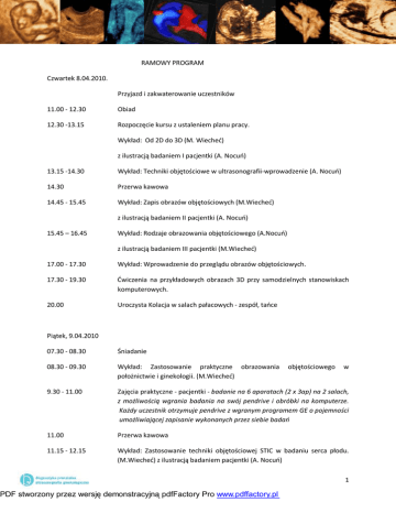 RAMOWY PROGRAM Czwartek 8.04.2010. Przyjazd i zakwaterowanie uczestników 11.00 - 12.30 Obiad 12.30 -13.15 Rozpoczęcie kursu z ustaleniem planu pracy. Wykład: Od 2D do 3D (M. Wiecheć) z ilustracją badaniem I pacjentki (A. Nocuń) 13.15 -14.30 Wykład: Techniki objętościowe w ultrasonografii-wprowadzenie (A. Nocuń) 14.30 Przerwa kawowa 14.45 - 15.45 Wykład: Zapis obrazów objętościowych (M.Wiecheć) z ilustracją badaniem II pacjentki (A. Nocuń) 15.45 – 16.45 Wykład: Rodzaje obrazowania objętościowego (A.Nocuń) z ilustracją badaniem III pacjentki (M.Wiecheć) 17.00 - 17.30 Wykład: Wprowadzenie do przeglądu obrazów objętościowych. 17.30 - 19.30 Ćwiczenia na przykładowych obrazach 3D przy samodzielnych stanowiskach komputerowych. 20.00 Uroczysta Kolacja w salach pałacowych - zespół, tańce Piątek, 9.04.2010 07.30 - 08.30 Śniadanie 08.30 - 09.30 Wykład: Zastosowanie praktyczne obrazowania położnictwie i ginekologii. (M.Wiecheć) 9.30 - 11.00 Zajęcia praktyczne - pacjentki - badanie na 6 aparatach (2 x 3ap) na 2 salach, z możliwością wgrania badania na swój pendrive i obróbki na komputerze. Każdy uczestnik otrzymuje pendrive z wgranym programem GE o pojemności umożliwiającej zapisanie wykonanych przez siebie badań 11.00 Przerwa kawowa 11.15 - 12.15 Wykład: Zastosowanie techniki objętościowej STIC w badaniu serca płodu. (M.Wiecheć) z ilustracją badaniem pacjentki (A. Nocuń) PDF stworzony przez wersję demonstracyjną pdfFactory Pro www.pdffactory.pl objętościowego w 1 13.00 - 14.00 Obiad 14.00 - 16.00 Zajęcia praktyczne (j.w.) 16.00 - 17.00 Wykład: Obrazowanie objętościowe w badaniu płodu w 11+0-13+6 tygodniu ciąży. (M.Wiecheć, A. Nocuń) 17.00 – 19.00 Ćwiczenia przy samodzielnych stanowiskach komputerowych, analiza błędów i pytania od uczestników kursu 19.00 Zakończenie części 3D 19.30 Wieczór grillowy - altana w Parku Pałacowym Sobota, 10.04.2010 07.30 - 08.30 Śniadanie 08.30 T. Roszkowski: Wykłady dotyczące diagnostyki prenatalnej z prezentacją przypadków nieprawidłowości u płodu. PDF stworzony przez wersję demonstracyjną pdfFactory Pro www.pdffactory.pl 2