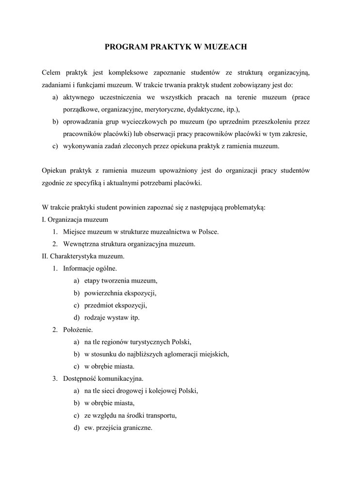 PROGRAM PRAKTYK W MUZEACH Celem praktyk jest kompleksowe zapoznanie studentów ze strukturą organizacyjną, zadaniami i funkcjami muzeum. W trakcie trwania praktyk student zobowiązany jest do: a) aktywnego uczestniczenia we wszystkich pracach na terenie muzeum (prace porządkowe, organizacyjne, merytoryczne, dydaktyczne, itp.), b) oprowadzania grup wycieczkowych po muzeum (po uprzednim przeszkoleniu przez pracowników placówki) lub obserwacji pracy pracowników placówki w tym zakresie, c) wykonywania zadań zleconych przez opiekuna praktyk z ramienia muzeum. Opiekun praktyk z ramienia muzeum upoważniony jest do organizacji pracy studentów zgodnie ze specyfiką i aktualnymi potrzebami placówki. W trakcie praktyki student powinien zapoznać się z następującą problematyką: I. Organizacja muzeum 1. Miejsce muzeum w strukturze muzealnictwa w Polsce. 2. Wewnętrzna struktura organizacyjna muzeum. II. Charakterystyka muzeum. 1. Informacje ogólne. a) etapy tworzenia muzeum, b) powierzchnia ekspozycji, c) przedmiot ekspozycji, d) rodzaje wystaw itp. 2. Położenie. a) na tle regionów turystycznych Polski, b) w stosunku do najbliższych aglomeracji miejskich, c) w obrębie miasta. 3. Dostępność komunikacyjna. a) na tle sieci drogowej i kolejowej Polski, b) w obrębie miasta, c) ze względu na środki transportu, d) ew. przejścia graniczne. III. Ruch turystyczny. 1. Wielkość ruchu turystycznego (na podstawie archiwum, liczby sprzedanych biletów, innych jednostek organizacyjnych), 2. Rodzaj ruchu turystycznego (turystyka indywidualna, grupowa, wycieczkowa), 3. Sezonowość ruchu turystycznego (w cyklu rocznym, miesięcznym, tygodniowym). IV. Promocja placówki i organizowanych wystaw. 1. Imprezy organizowane przez muzeum. a) terminarz organizowanych imprez, b) rodzaj imprez (festiwale, konkursy, imprezy plenerowe, itp.), 2. Wydawnictwa dotyczące muzeum. a) książki, przewodniki, foldery, b) prace naukowe o muzeum lub przez nie wydawane (czasopisma naukowe, prace magisterskie, doktorskie, habilitacyjne), c) pozostałe (np. widokówki, slajdy). 3. Oferta edukacyjna. 4. Pozostałe, np. strona internetowa, zamieszczane reklamy, sprzedaż pamiątek. V. Sporządzanie dokumentacji muzealnej. 1. Metody dokumentacji obiektów ( w miarę możliwości praktyczne przećwiczenie), 2. Archiwizowanie danych dotyczących wystaw, wydarzeń i natężenia ruchu turystycznego. VI. Obsługa ruchu turystycznego.
