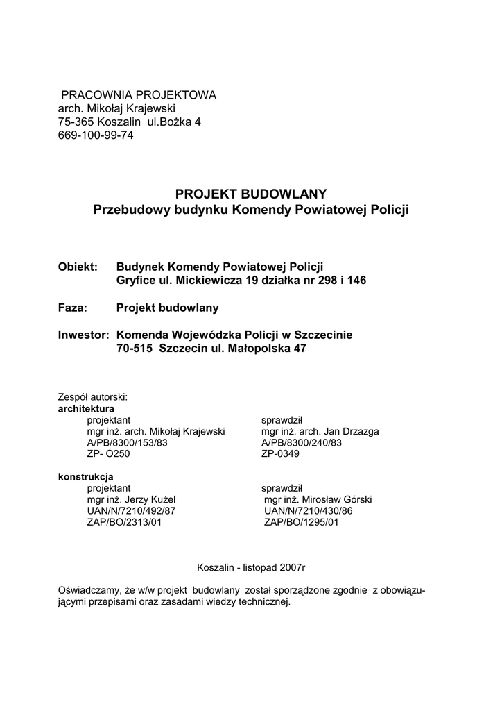 PROJEKT BUDOWLANY Przebudowy budynku Komendy