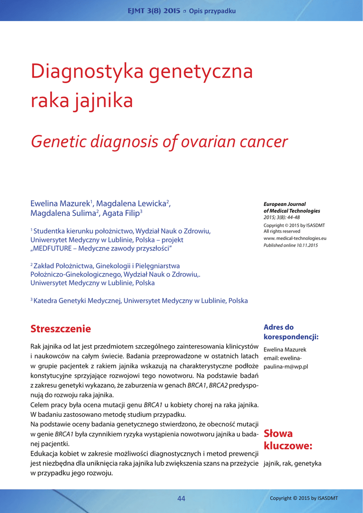EJMT 3(8) 2015 • Opis przypadku Diagnostyka genetyczna raka jajnika Genetic diagnosis of ovarian cancer Ewelina Mazurek1, Magdalena Lewicka2, Magdalena Sulima2, Agata Filip3 European Journal of Medical Technologies 2015; 3(8): 44-48 Studentka kierunku położnictwo, Wydział Nauk o Zdrowiu, Uniwersytet Medyczny w Lublinie, Polska – projekt „MEDFUTURE – Medyczne zawody przyszłości” 1 Copyright © 2015 by ISASDMT All rights reserved www. medical-technologies.eu Published online 10.11.2015 Zakład Położnictwa, Ginekologii i Pielęgniarstwa Położniczo-Ginekologicznego, Wydział Nauk o Zdrowiu,. Uniwersytet Medyczny w Lublinie, Polska 2 3 Katedra Genetyki Medycznej, Uniwersytet Medyczny w Lublinie, Polska Streszczenie Adres do korespondencji: Rak jajnika od lat jest przedmiotem szczególnego zainteresowania klinicystów i naukowców na całym świecie. Badania przeprowadzone w ostatnich latach w grupie pacjentek z rakiem jajnika wskazują na charakterystyczne podłoże konstytucyjne sprzyjające rozwojowi tego nowotworu. Na podstawie badań z zakresu genetyki wykazano, że zaburzenia w genach BRCA1, BRCA2 predysponują do rozwoju raka jajnika. Celem pracy była ocena mutacji genu BRCA1 u kobiety chorej na raka jajnika. W badaniu zastosowano metodę studium przypadku. Na podstawie oceny badania genetycznego stwierdzono, że obecność mutacji w genie BRCA1 była czynnikiem ryzyka wystąpienia nowotworu jajnika u badanej pacjentki. Edukacja kobiet w zakresie możliwości diagnostycznych i metod prewencji jest niezbędna dla uniknięcia raka jajnika lub zwiększenia szans na przeżycie w przypadku jego rozwoju. 44 Ewelina Mazurek email: [email protected] Słowa kluczowe: jajnik, rak, genetyka Copyright © 2015 by ISASDMT EJMT 3(8) 2015 • Opis przypadku Summary Ovarian cancer has been a subject of particular interest to clinicians and scientists around the world. Research carried out in recent years in the group of patients with ovarian cancer, indicate a specific substrate constitutional promoting the development of cancer. Based on studies of genetics showed that disturbances in BRCA1, BRCA2, predispose to the development of ovarian cancer. The aim of the study was to evaluate the BRCA1 gene mutation in women suffering from ovarian cancer. The study used the case study method. On the basis of the assessment of genetic testing, it was found that the presence of BRCA1 mutations was a risk factor for ovarian cancer patients studied. Key words: Education of women in the field of diagnostic possibilities and methods of prevention is necessary to prevent ovarian cancer or increase the chances of ovarian, cancer, survival in case of its development. genetics Wstęp Rak jajnika od lat jest przedmiotem szczególnego zainteresowania klinicystów i naukowców na całym świecie, ponieważ jest jedną z najczęstszych przyczyn zgonów kobiet, wykazującą tendencję wzrostową, zwłaszcza w krajach wysoko uprzemysłowionych. Jest to schorzenie polegające na obecności komórek nowotworowych w jednym lub dwu jajnikach. Niekontrolowane i nieprawidłowe rozmnażanie się tych komórek prowadzi do powstania guza nowotworowego, którego dalszy rozwój może zagrażać innym tkankom i prowadzić do przerzutów [1,2]. W Polsce rak jajnika zajmuje drugie miejsce pod względem częstości występowania wśród nowotworów narządu rodnego. Statystycznie częściej występuje tylko rak szyjki macicy. Rak jajnika jest piątym co do częstości nowotworem złośliwym u kobiet. Rak jajnika może ujawniać się w każdym wieku, występuje nawet u małych dziewczynek, ale najczęściej wzrost zachorowalności rośnie gwałtownie w piątej dekadzie życia i sukcesywnie wzrasta do ósmej dekady życia [3,4]. Z badań wynika, że objawy choroby nowotworowej jajnika występują aż u 95% badanych na rok przed rozpoznaniem choroby. U 72% objawy te mają charakter nawracający. Mylone są najczęściej z dolegliwościami układu pokarmowego lub moczowego. Brak charakterystycznych objawów raka jajnika we wczesnym stadium choroby powoduje, że tylko u 20% pacjentek schorzenie jest diagnozowane w początkowym etapie jego rozwoju klinicznego [5,6]. Czynnikiem ryzyka rozwoju raka jajnika jest między innymi mała liczba ciąż i przebytych porodów oraz nierództwo. Czynnikiem ochronnym dla kobiet jest ciąża oraz antykoncepcja hormonalna. Obydwa te czynniki mają wpływ na częstość owulacji w życiu kobiety. W odniesieniu do raka jajnika prawdopodobieństwo jego rozwoju jest wprost proporcjonalne do liczby owulacji – im jest ich mniej, tym mniejsze ryzyko wystąpienia choroby. Istnieje korelacja pomiędzy rozwojem choroby nowotworowej jajnika a narażeniem na napromieniowanie miednicy mniejszej w wyniku wcześniej przebytych chorób nowotworowych. Istotne znaczenie ma dziedziczne występowanie raka jajnika [6]. W przypadku gdy kobieta jest nosicielką zmutowanego genu BRCA1 i BRCA2 ryzyko pojawienia się guza staje się znaczne [7]. W ostatnich latach obserwuje się stały rozwój nauk medycznych. Intensywne badania w dziedzinie genetyki pozwoliły na identyfikację w ludzkim genomie, których mutacje korelują z wysokim prawdopodobieństwem rozwoju nowotworu na podłożu genetycznym. Aby wykryć mutacje w genomie, wykonuje się analizę kodu genetycznego, m.in. na drodze izolacji DNA, z komórek krwi (leukocyty) bądź z bioptatów tkanek [8]. Badania przeprowadzone w ostatnich latach w grupie pacjentek z rakiem jajnika wskazują na 45 Copyright © 2015 by ISASDMT EJMT 3(8) 2015 • Opis przypadku charakterystyczne podłoże konstytucyjne sprzyjające rozwojowi tego nowotworu. Na podstawie badań z zakresu genetyki wykazano, że zaburzenia w genach BRCA1, BRCA2, NOD2, CHEK2, DHCR7 predysponują do rozwoju raka jajnika. W niektórych przypadkach zmiany genetyczne mają związek z bardzo wysokim ryzykiem nowotworowym, w innych predysponują do rozwoju raka w mniejszym stopniu [6,10]. Rozpoznanie zespołu d