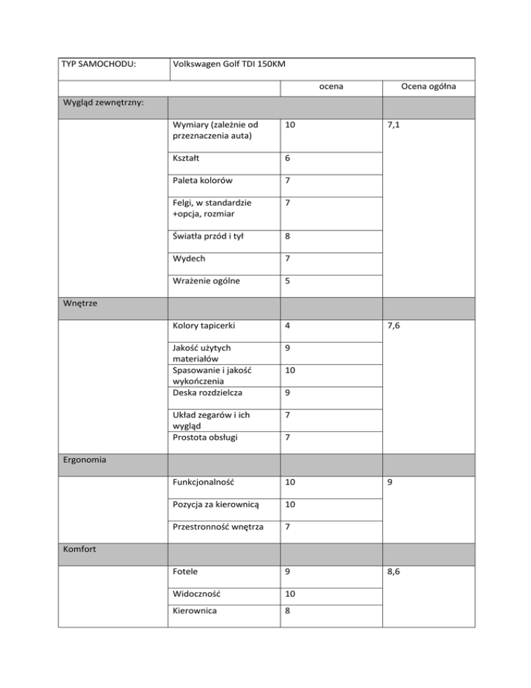TYP SAMOCHODU: Volkswagen Golf TDI 150KM ocena Ocena