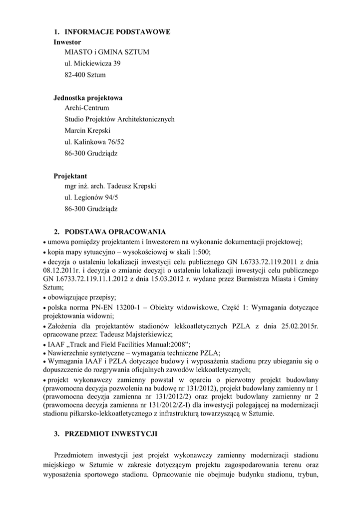 1. INFORMACJE PODSTAWOWE Inwestor MIASTO i GMINA SZTUM ul. Mickiewicza 39 82-400 Sztum Jednostka projektowa Archi-Centrum Studio Projektów Architektonicznych Marcin Krepski ul. Kalinkowa 76/52 86-300 Grudziądz Projektant mgr inż. arch. Tadeusz Krepski ul. Legionów 94/5 86-300 Grudziądz 2. PODSTAWA OPRACOWANIA umowa pomiędzy projektantem i Inwestorem na wykonanie dokumentacji projektowej; kopia mapy sytuacyjno – wysokościowej w skali 1:500; decyzja o ustaleniu lokalizacji inwestycji celu publicznego GN I.6733.72.119.2011 z dnia 08.12.2011r. i decyzja o zmianie decyzji o ustaleniu lokalizacji inwestycji celu publicznego GN I.6733.72.119.11.1.2012 z dnia 15.03.2012 r. wydane przez Burmistrza Miasta i Gminy Sztum; obowiązujące przepisy; polska norma PN-EN 13200-1 – Obiekty widowiskowe, Część 1: Wymagania dotyczące projektowania widowni; Założenia dla projektantów stadionów lekkoatletycznych PZLA z dnia 25.02.2015r. opracowane przez: Tadeusz Majsterkiewicz; IAAF „Track and Field Facilities Manual:2008”; Nawierzchnie syntetyczne – wymagania techniczne PZLA; Wymagania IAAF i PZLA dotyczące budowy i wyposażenia stadionu przy ubieganiu się o dopuszczenie do rozgrywania oficjalnych zawodów lekkoatletycznych; projekt wykonawczy zamienny powstał w oparciu o pierwotny projekt budowlany (prawomocna decyzja pozwolenia na budowę nr 131/2012), projekt budowlany zamienny nr 1 (prawomocna decyzja zamienna nr 131/2012/2) oraz projekt budowlany zamienny nr 2 (prawomocna decyzja zamienna nr 131/2012/Z-I) dla inwestycji polegającej na modernizacji stadionu piłkarsko-lekkoatletycznego z infrastrukturą towarzyszącą w Sztumie. 3. PRZEDMIOT INWESTYCJI Przedmiotem inwestycji jest projekt wykonawczy zamienny modernizacji stadionu miejskiego w Sztumie w zakresie dotyczącym projektu zagospodarowania terenu oraz wyposażenia sportowego stadionu. Opracowanie nie obejmuje budynku stadionu, trybun, ogrodzenia oddzielającego płytę boiska od budynku stadionu, chodników wokół budynku. Elementy te są już wykonane. Granice opracowania niniejszego projektu zamiennego należy rozpatrywać zgodnie z częścią rysunkową. 4. ZAKRES OPRACOWANIA Zakresem opracowania objęto wykonanie zestawienia wyposażenia technicznego obiektów lekkoatletycznych w urządzenia i sprzęt do organizacji zawodów lekkoatletycznych Kategorii V (wykaz opracowany przez Komisję Obiektów i Urządzeń PZLA na podstawie „Przepisów IAAF” i Regulaminów PZLA) 5. UWAGI OGÓLNE 1. Na oficjalnych zawodach ujętych w kalendarzu imprez PZLA, na których zawodnicy mogą uzyskiwać minima do mistrzostw Polski wszystkich kategorii wiekowych oraz wyniki uprawniające do nadania im klasy I i wyższej (M i MM) wymagane jest stosowanie jedynie sprzętu zawodniczego posiadającego aktualny certyfikat IAAF, zgodnie z wykazem zamieszczonym na stronie IAAF. 2. Zgodnie z decyzją Zarządu PZLA na zawodach, na których zawodnicy mogą uzyskiwać minima do mistrzostw Polski wszystkich kategorii wiekowych oraz wyniki uprawniające do nadania im klasy I i wyższej wymagane jest stosowanie aparatury do elektronicznego pomiaru czasu typu video, pozwalającego na identyfikację zawodników. Wyniki pomierzone za pomocą chronometru z drukarką i fotokomórką nie są uwzględniane jako podstawa do uzyskania klasy I i wyższej oraz jako minima na imprezy mistrzowskie. 3. W wykazie przedstawiono sprzęt niezbędny dla przeprowadzenia określonych konkurencji i sprzęt pomocniczy niezbędny dla kontroli sprzętu zawodniczego dla wszystkich konkurencji, co powinno ułatwić przygotowanie obiektu do przeprowadzenia zawodów, co najmniej szczebla okręgowego. 4. W powyższym wykazie nie przedstawiono sprzętu pomocniczego, jaki powinien znajdować się na wszystkich stadionach - takiego jak szczotki/miotły do oczyszczania rozbiegu z piasku i innych nieczystości, koszy plastikowych na śmieci, jakie powinny znajdować się w pobliżu startu na 100 m, 200 m, 400 m i 1500 m, na początku rozbiegów do skoku w dal/trójskoku, skoku o tyczce i skoku wzwyż, rozbiegu do rzutu oszczepem oraz w pobliżu kół do pchnięcia kulą, rzutu dyskiem i młotem, dla umożliwienia zawodnikom wyrzucenia butelek po napojach i innych odpadków, niezbędnego dla zachowania czystości na stadionie. Wskazane jest także zakupienie odkurzacza, który pozwoliłby co pewien czas lub przed zawodami oczyścić bieżnię i rozbiegi, wykonane z nawierzchni syntetycznych z piasku i innych nieczystości. 5. Przy projektowaniu nowo budowanych stadionów Komisja zaleca planowanie wyposażenia tych obiektów w sprzęt boiskowy i zawodniczy, posiadający certyfikaty wraz z zestawem do kontroli parametrów sprzętu rzutowego. Uwaga: Operowanie przykładowymi nazwami producenta, ma jedynie na celu doprecyzowanie poziomu oczekiwań Zamawiającego w stosunku do określonego rozwiązania. Tak więc posługiwanie się nazwami producentów czy produktów ma wyłącznie charakter przykładowy. Dopuszcza się przy realizacji zamówienia zastosowanie urządzeń i materiałów równoważnych co do jakości i surowców użytych do ich wykonania, w stosunku do materiałów i urządzeń określonych w dokumentacji projektowej. 6. OPIS WYPOSAŻENIA RZUT OSZCZEPEM STOJAK NA OSZCZEPY na kółkach, pojemność 18 szt., wykonany z rur i kształtowników stalowych, lakierowany proszkowo, OSZCZEPY – różne sztywności dla poszczególnych wag Air Flyer 800g,700g,600g,500g Grot stalowy cynkowany, trzon malowany proszkowo na kolor niebieski transparentny. certyfikat IAAF Sky Challenger 800g,700g,600g,500g Zwiększona sztywność, zawężona końcówka trzona, grot w kształcie „cygara”, cynkowany. Trzon malowany proszkowo na kolor czerwony transparentny. certyfikat IAAF Space Master 800g,700g,600g,500g Ultracienka końcówka trzona, maksymalna sztywność, ostry grot cynkowany grubopowłokowo, lakier proszkowy w kolorze seledynowym transparentnym, certyfikat IAAF PIŁECZKA PALANTOWA 15