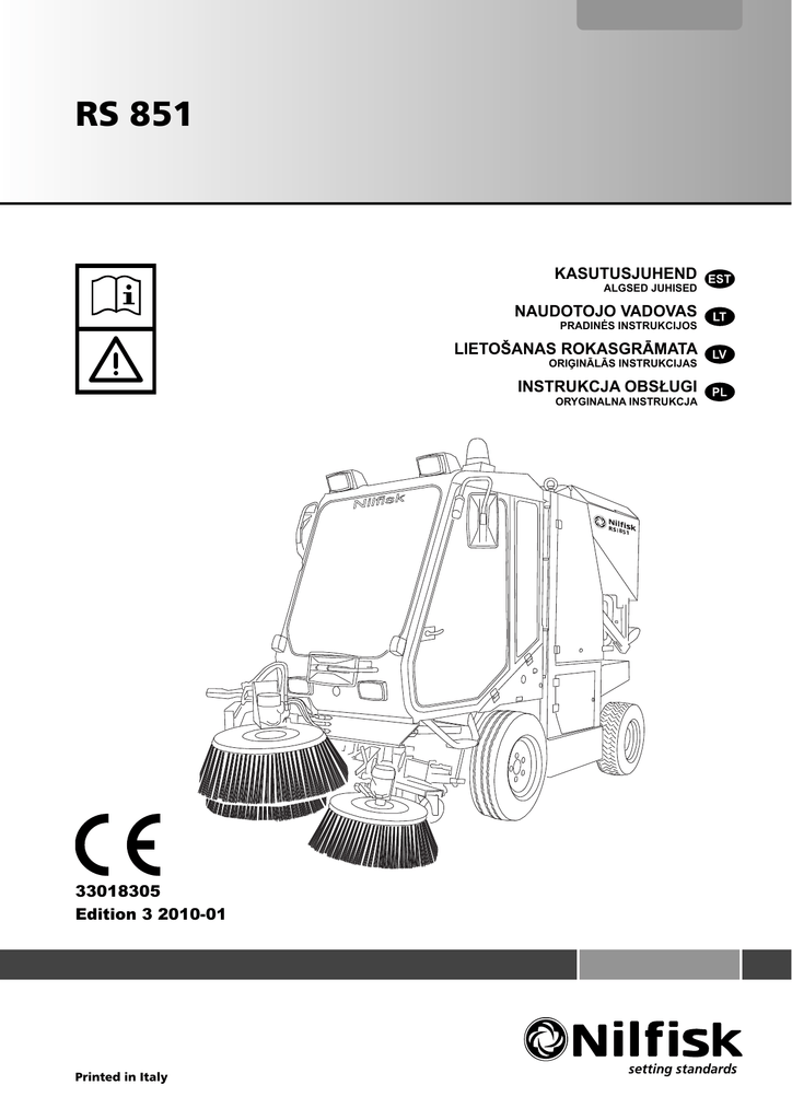 RS 851 KASUTUSJUHEND ALGSED JUHISED NAUDOTOJO VADOVAS PRADINĖS INSTRUKCIJOS LIETOŠANAS ROKASGRĀMATA ORIĢINĀLĀS INSTRUKCIJAS INSTRUKCJA OBSŁUGI ORYGINALNA INSTRUKCJA k Nilfis 851 33018305 Edition 3 2010-01 Printed in Italy setting standards A Сертификат за съответствие Conformity certificate Declaração de conformidade Osvědčení o shodě Πιστοποιητικό συμμόρφωσης Deklaracja zgodności Konformitätserklärung Megfelelősségi nyilatkozat Certificat de conformitate Overensstemmelsescertifikat Dichiarazione di conformità Заявление о соответствии Declaración de conformidad Atitikties deklaracija Överensstämmelsecertifikat Vastavussertifikaat Atbilstības deklarācija Certifikát súladu Déclaration de conformité Konformitetssertifisering Certifikat o ustreznosti Yhdenmukaisuustodistus Conformiteitsverklaring Uyumluluk sertifikası Модел / Model / Modell / Model / Modelo / Mudel / Modèle / Malli / Model / Μοντέλο / Modell / Modello / Modelis / Modelis / Modell / Model / Modelo / Model / Model / Модель / Modell / Model / Model / Model : ROAD SWEEPER Тип / Typ / Typ / Type / Tipo / Tüüp / Type / Tyyppi / Type / Τύπος / Típus / Tipo / Tipas / Tips / Type / Type / Tipo / Typ / Tip / Тип / Typ / Typ / Tip / Tip : RS 851 Сериен номер / Výrobní číslo / Seriennummer / Serienummer / Número de serie / Seerianumber / Numéro de série / Sarjanumero / Serial number / Σειριακός αριθμός / Sorozatszám / Numero di serie / Serijos numeris / Sērijas numurs / Serienummer / Serienummer / Número de série / Numer seryjny / Număr de serie / Серийный номер / Serienummer / Výrobné číslo / Serijska številka / Seri Numarası : Година на производство / Rok výroby / Baujahr / Fabrikationsår / Año de fabricación / Väljalaskeaasta / Année de fabrication / Valmistusvuosi / Year of construction / Έτος κατασκευής / Gyártási év / Anno di costruzione / Pagaminimo metai / Izgatavošanas gads / Byggeår / Bauwjaar / Ano de fabrico / Rok produkcji / Anul fabricaţiei / Год выпуска / Tillverkningsår / Rok výroby / Leto izdelave / Leto izdelave/İmal yılı : Долуподписаният потвърждава, че гореспоменатият модел е произведен в съответствие със следните директиви и стандарти. The undersigned certify that the above mentioned model is produced in accordance with the following directives and standards. A presente assinatura serve para declarar que os modelos supramencionados são produtos em conformidade com as seguintes directivas e normas. Níže podepsaný stvrzuje, že výše uvedený model byl vyroben v souladu s následujícími směrnicemi a normami. Ο κάτωθι υπογεγραμμένος πιστοποιεί ότι η παραγωγή του προαναφερθέντος μοντέλου γίνεται σύμφωνα με τις ακόλουθες οδηγίες και πρότυπα. Niżej podpisany zaświadcza, że wymieniony powyżej model produkowany jest zgodnie z następującymi dyrektywami i normami. Der Unterzeichner bestätigt hiermit dass die oben erwähnten Modelle gemäß den folgenden Richtlinien und Normen hergestellt wurden. Alulírottak igazoljuk, hogy a fent említett modellt a következő irányelvek és szabványok alapján hoztuk létre. Subsemnatul atest că modelul susmenţionat este produs în conformitate cu următoarele directive şi standarde. Undertegnede attesterer herved, at ovennævnte model er produceret i overensstemmelse med følgende direktiver og standarder. Il sottoscritto dichiara che i modelli sopra menzionati sono prodotti in accordo con le seguenti direttive e standard. Настоящим удостоверяется, что машина вышеуказанной модели изготовлена в соответствии со следующими директивами и стандартами. El abajo firmante certifica que los modelos arriba mencionados han sido producidos de acuerdo con las siguientes directivas y estandares. Toliau pateiktu dokumentu patvirtinama, kad minėtas modelis yra pagamintas laikantis nurodytų direktyvų bei standartų. Undertecknad intygar att ovannämnda modell är producerad i överensstämmelse med följande direktiv och standarder. Allakirjutanu kinnitab, et ülalnimetatud mudel on valmistatud kooskõlas järgmiste direktiivide ja normidega. Ar šo tiek apliecināts, ka augstākminētais modelis ir izgatavots atbilstoši šādām direktīvām un standartiem. Dolu podpísaný osvedčuje, že hore uvedený model sa vyrába v súlade s nasledujúcimi smernicami a normami. Je soussigné certifie que les modèles cidessus sont fabriqués conformément aux directives et normes suivantes. Undertegnede attesterer att ovennevnte modell är produsert i overensstemmelse med fölgende direktiv og standarder. Spodaj podpisani potrjujem, da je zgoraj omenjeni model izdelan v skladu z naslednjimi smernicami in standardi. Allekirjoittaia vakuuttaa että yllämainittu malli on tuotettu seuraavien direktiivien ja standardien mukaan. Ondergetekende verzekert dat de bovengenoemde modellen geproduceerd zijn in overeenstemming met de volgende richtlijnen en standaards. Aşağıda İmzası olan kişi, yukarıda bahsedilen model cihazın aşağıda verilen direktiflere ve standartlara uygunlukta imal edildiğini onaylar. EC Machinery chinery Direc Directive e 2006/42/E 2006/42/EC EN ISO 12100-1, EN ISO 12100-2, EN 294, EN 349, EN 982, EN 13019, EN 15429-1 EC EMC MC Directive 2004/104/EC 200 4/EC EN 55012, EN 50366 Manufacturer: Nilfisk-Advance S.p.A. Authorized signatory: Franco Mazzini, General Mgr Date: Signature: Address: Strada Comunale della Braglia, 18, 26862 GUARDAMIGLIO (LO) - ITALY Tel: +39 (0)377 451124, Fax: +39 (0)377 51443 Te