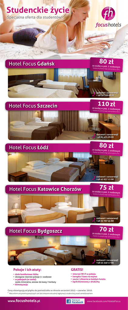 Studenckie życie Specjalna oferta dla studentów! 80 zł Hotel Focus Gdańsk za osobę w pok. 2 osob owym Dopłata do pojedynczego wykorzy stania: 55 zł zadzwoń i zarezerwuj! + 48 58 350 08 01 110 zł Hotel Focus Szczecin za osobę w pok. 2 osob owym Dopłata do pojedynczego wykorzy stania: 90 zł zadzwoń i zarezerwuj! +48 91 433 05 00 80 zł Hotel Focus Łódź za osobę w pok. 2 osob owym Dopłata do pojedynczego wykorzy stania: 45 zł zadzwoń i zarezerwuj! +48 42 637 12 00 Hotel Focus Katowice Chorzów 75 zł za osobę w pok. 2 osob owym Dopłata do pojedynczego wykorzy stania: 60 zł zadzwoń i zarezerwuj! +48 32 707 45 80 70 zł Hotel Focus Bydgoszcz za osobę w pok. 2 osob owym Dopłata do pojedynczego wykorzy stania: 45 zł zadzwoń i zarezerwuj! +48 52 340 17 66 Pokoje i ich atuty: GRATIS! • duże komfortowe łóżka • dostępne również pokoje 3- osobowe • w pokojach (w cenie): woda mineralna, zestaw do kawy i herbaty • klimatyzacja • internet Wi-Fi w pokoju • kanapka i kawa na wynos • sauna i siłownia w każdym hotelu • kącik biznesowy z drukarką Ceny obowiązują od piątku do poniedziałku w okresie wrzesień 2015 – czerwiec 2016. * Warunkiem otrzymania powyższych cen jest okazanie aktualnej legitymacji studenckiej przed zameldowaniem. www.focushotels.pl www.facebook.com/HoteleFocus