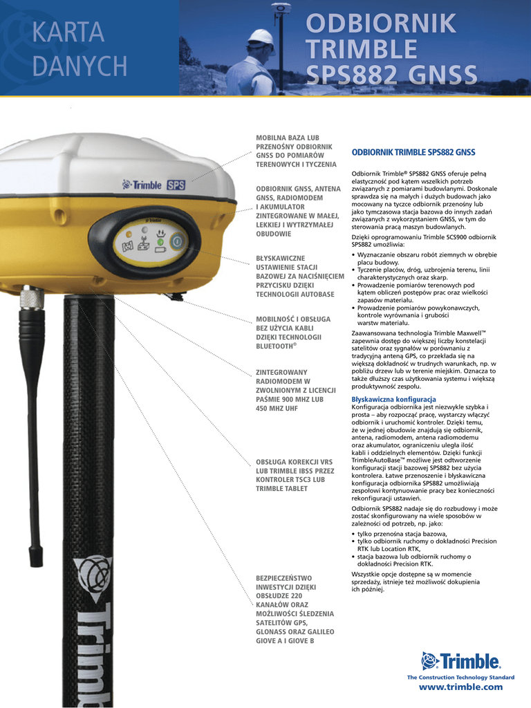KARTA DANYCH ODBIORNIK TRIMBLE SPS882 GNSS MOBILNA BAZA LUB PRZENOŚNY ODBIORNIK GNSS DO POMIARÓW TERENOWYCH I TYCZENIA ODBIORNIK GNSS, ANTENA GNSS, RADIOMODEM I AKUMULATOR ZINTEGROWANE W MAŁEJ, LEKKIEJ I WYTRZYMAŁEJ OBUDOWIE BŁYSKAWICZNE USTAWIENIE STACJI BAZOWEJ ZA NACIŚNIĘCIEM PRZYCISKU DZIĘKI TECHNOLOGII AUTOBASE MOBILNOŚĆ I OBSŁUGA BEZ UŻYCIA KABLI DZIĘKI TECHNOLOGII BLUETOOTH® ZINTEGROWANY RADIOMODEM W ZWOLNIONYM Z LICENCJI PAŚMIE 900 MHZ LUB 450 MHZ UHF OBSŁUGA KOREKCJI VRS LUB TRIMBLE IBSS PRZEZ KONTROLER TSC3 LUB TRIMBLE TABLET ODBIORNIK TRIMBLE SPS882 GNSS Odbiornik Trimble® SPS882 GNSS oferuje pełną elastyczność pod kątem wszelkich potrzeb związanych z pomiarami budowlanymi. Doskonale sprawdza się na małych i dużych budowach jako mocowany na tyczce odbiornik przenośny lub jako tymczasowa stacja bazowa do innych zadań związanych z wykorzystaniem GNSS, w tym do sterowania pracą maszyn budowlanych. Dzięki oprogramowaniu Trimble SCS900 odbiornik SPS882 umożliwia: • Wyznaczanie obszaru robót ziemnych w obrębie placu budowy. • Tyczenie placów, dróg, uzbrojenia terenu, linii charakterystycznych oraz skarp. • Prowadzenie pomiarów terenowych pod kątem obliczeń postępów prac oraz wielkości zapasów materiału. • Prowadzenie pomiarów powykonawczych, kontrole wyrównania i grubości warstw materiału. Zaawansowana technologia Trimble Maxwell™ zapewnia dostęp do większej liczby konstelacji satelitów oraz sygnałów w porównaniu z tradycyjną anteną GPS, co przekłada się na większą dokładność w trudnych warunkach, np. w pobliżu drzew lub w terenie miejskim. Oznacza to także dłuższy czas użytkowania systemu i większą produktywność zespołu. Błyskawiczna konfiguracja Konfiguracja odbiornika jest niezwykle szybka i prosta – aby rozpocząć pracę, wystarczy włączyć odbiornik i uruchomić kontroler. Dzięki temu, że w jednej obudowie znajdują się odbiornik, antena, radiomodem, antena radiomodemu oraz akumulator, ograniczeniu uległa ilość kabli i oddzielnych elementów. Dzięki funkcji TrimbleAutoBase™ możliwe jest odtworzenie konfiguracji stacji bazowej SPS882 bez użycia kontrolera. Łatwe przenoszenie i błyskawiczna konfiguracja odbiornika SPS882 umożliwiają zespołowi kontynuowanie pracy bez konieczności rekonfiguracji ustawień. Odbiornik SPS882 nadaje się do rozbudowy i może zostać skonfigurowany na wiele sposobów w zależności od potrzeb, np. jako: • tylko przenośna stacja bazowa, • tylko odbiornik ruchomy o dokładności Precision RTK lub Location RTK, • stacja bazowa lub odbiornik ruchomy o dokładności Precision RTK. BEZPIECZEŃSTWO INWESTYCJI DZIĘKI OBSŁUDZE 220 KANAŁÓW ORAZ MOŻLIWOŚCI ŚLEDZENIA SATELITÓW GPS, GLONASS ORAZ GALILEO GIOVE A I GIOVE B Wszystkie opcje dostępne są w momencie sprzedaży, istnieje też możliwość dokupienia ich później. The Construction Technology Standard www.trimble.com ODBIORNIK TRIMBLE SPS882 GNSS OGÓLNE Klawiatura i ekran . . . .wskaźniki LED śledzenia sygnału z satelitów, połączenia radiowego i stanu zasilania Wyłącznik główny do błyskawicznego uruchomienia Wymiary (szer. x wys.) . . . . . . . . . . . . . . . . . . . . . . . . . . . . . . . . . . 19 cm × 11,2 cm Masa . . . . . . . . . . . . . 1,35 kg sam odbiornik z radiomodemem i akumulatorem Cały system (odbiornik ruchomy z kontrolerem i tyczką) 3,7 kg WARUNKI EKSPLOATACJI Temp. eksploatacji1 . . . . . . . . . . . . . . . . . . . . . . . . . . . . . . . . . . . . –40 °C do +65 °C Temp. przechowywania . . . . . . . . . . . . . . . . . . . . . . . . . . . . . . . . –40 °C do +75 °C Wilgotność . . . . . . . . . . . . . . . . . . . . . . . . . . . . . . . . . . . . . . . 100%, z kondensacją Wodoszczelność . . . . . . . . . . . . . . . . wg klasy IP67 z zanurzeniem do głębokości 1 m, pyłoszczelność Upadek tyczki . . . . . . . . . . . . . . . . . . . . . .Odporność na upadek z 2 m na beton POMIARY • 220 kanałów L1C/A,L1/L2/L2C. Możliwość rozbudowy do L5 i GLONASS L1/ L2C/A, L1/L2P Full Cycle Carrier • Technologia eliminacji sygnału odbitego Trimble EVEREST™ • 4 kanały SBAS L1 C/A, L5 (WAAS/EGNOS/MSAS) POMIARY RÓŻNICOWE KODOWE GPS2 Dokładność pozioma . . . . . . . . . . . . . . . . . . . . . . . . . . . . . . . 0,25 m + 1 ppm RMS Dokładność pionowa. . . . . . . . . . . . . . . . . . . . . . . . . . . . . . . 0,50 m + 1 ppm RMS POMIARY KINEMATYCZNE (RTK)3 Dokładność pozioma . . . . . . . . . . . . . . . . . . . . . . . . . . . . . . . . 8 mm + 1 ppm RMS Dokładność pionowa. . . . . . . . . . . . . . . . . . . . . . . . . . . . . . . 15 mm + 1 ppm RMS ŚWIADECTWA ZGODNOŚCI Z NORMAMI • Certyfikat FCC, klasa B, część 15, 22, 24 • ICES-003 (Kanada). Cet appareil numérique de la classe B est conforme à la norme NMB-003 du Canada • RSS-310, RSS-210, i RSS-119 (Kanada) • Cet appareil est conforme à la norme CNR-310, CNR-210, et CNR-119 du Canada • Znak CE • Znak C-tick • Zgodność z dyrektywą RoHS • Zgodność z dyrektywą WEEE KOMUNIKACJA Lemo (szeregowo) . . . . . . . . .7-pinowe 0S Lemo, szeregowe 1, 3-żyłowe RS-232 Modem 1 (szeregowo) . . . . . . . . . . . D-sub, szeregowe 2, pełne 9-żyłowe RS232 Technologia bezprzewodowa Bluetooth . . . . . . . . . . . . . W pełni zintegrowany, szczelny moduł Bluetooth (2,4 GHz)4 Zintegrowane radiomodemy (opcjonalnie) . . . W pełni zintegrowany, szczelny radiomodem nadawczo-odbiorczy 450 MHz (UHF); radiomodem nadawczo-odbiorczy 900 MHz. Moc wbudowanego radiomodemu . . . . . . . . . . . . . . . . . . . . . . . . . . . . . . . . 0,5 W Obsługa zewnętrznych urządzeń. . . . . . . . GSM/GPRS, telefonów komórkowych Obsługa za pośrednictwem kontrolerów . . . . SPS z oprogramowaniem SCS900 Prędkość aktualizacji położenia odbiornika . . . . 1 Hz, 2 Hz, 5 Hz, 10 Hz i 20 Hz Wejście/wyjście danych korekcji . . . . . . . . . . . . . . CMR™, CMR+™, CMRx, RTCM3