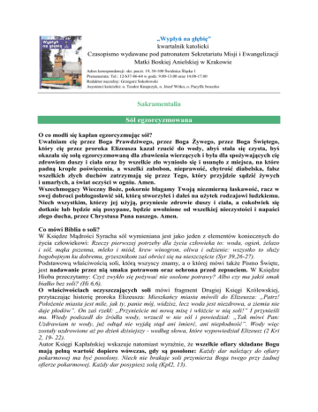 „Wypłyń na głębię” kwartalnik katolicki Czasopismo wydawane pod patronatem Sekretariatu Misji i Ewangelizacji Matki Boskiej Anielskiej w Krakowie Adres korespondencji: skr. poczt. 19, 58-100 Świdnica Śląska 1 Prenumerata: Tel.: 12/637-86-64 w godz. 9.00-13.00 oraz 14.00-17.00 Redaktor naczelny: Grzegorz Sokołowski Asystenci kościelni: o. Teodor Knapczyk, o. Józef Witko, o. Pacyfik Iwaszko Sakramentalia Sól egzorcyzmowana O co modli się kapłan egzorcyzmując sól? Uwalniam cię przez Boga Prawdziwego, przez Boga Żywego, przez Boga Świętego, który cię przez proroka Elizeusza kazał rzucić do wody, abyś stała się czysta, byś okazała się solą egzorcyzmowaną dla zbawienia wierzących i była dla spożywających cię zdrowiem duszy i ciała oraz by wszelkie zło wyniosło się i usunęło z miejsca, na które padną krople poświęcenia, a wszelki zabobon, nieprawość, chytrość diabelska, fałsz wszelkich złych duchów zatrzymają się przez Tego, który przyjdzie sądzić żywych i umarłych, a świat oczyści w ogniu. Amen. Wszechmogący Wieczny Boże, pokornie błagamy Twoją niezmierną łaskawość, racz w swej dobroci pobłogosławić sól, którą stworzyłeś i dałeś na użytek rodzajowi ludzkiemu. Niech wszystkim, którzy jej użyją, przyniesie zdrowie duszy i ciała, a cokolwiek się dotknie lub będzie nią posypane, będzie uwolnione od wszelkiej nieczystości i napaści złego ducha, przez Chrystusa Pana naszego. Amen. Co mówi Biblia o soli? W Księdze Mądrości Syracha sól wymieniana jest jako jeden z elementów koniecznych do życia człowiekowi: Rzeczy pierwszej potrzeby dla życia człowieka to: woda, ogień, żelazo i sól, mąka pszenna, mleko i miód, krew winogron, oliwa i odzienie: wszystko to służy bogobojnym ku dobremu, grzesznikom zaś obróci się na nieszczęście (Syr 39,26-27). Podstawową właściwością soli, którą wszyscy znamy, a o której mówi także Pismo Święte, jest nadawanie przez nią smaku potrawom oraz ochrona przed zepsuciem. W Księdze Hioba przeczytamy: Czyż zwykło się pożywać nie osolone potrawy? Albo czy ma jakiś smak białko bez soli? (Hi 6,6). O właściwościach oczyszczających soli mówi fragment Drugiej Księgi Królewskiej, przytaczając historię proroka Elizeusza: Mieszkańcy miasta mówili do Elizeusza: „Patrz! Położenie miasta jest mile, jak ty, panie mój, widzisz, lecz woda jest niezdrowa, a ziemia nie daje płodów”. On zaś rzekł: „Przynieście mi nową misę i włóżcie w nią soli!” I przynieśli mu. Wtedy podszedł do źródła wody, wrzucił w nie sól i powiedział: „Tak mówi Pan: Uzdrawiam te wody, już odtąd nie wyjdą stąd ani śmierć, ani niepłodność”. Wody więc zostały uzdrowione aż po dzień dzisiejszy - według słowa, które wypowiedział Elizeusz (2 Kri 2, 19- 22). Autor Księgi Kapłańskiej wskazuje natomiast wyraźnie, że wszelkie ofiary składane Bogu mają pełną wartość dopiero wówczas, gdy są posolone: Każdy dar należący do ofiary pokarmowej ma być posolony. Niech nie brakuje soli przymierza Boga twego przy żadnej ofierze pokarmowej. Każdy dar posypiesz solą (Kpł2, 13). O podobnym wymogu, odnośnie składania ofiar w Starym Testamencie, wspomina Księga Ezechiela: Te masz ofiarować przed Panem, a kapłani mają sypać sól i ofiarować je Panu jako ofiarę całopalną. (Ez43,24). Odwołajmy się jeszcze do Księgi Wyjścia, w której Bóg mówi Mojżeszowi o konieczności posolenia kadzidła, które dopiero po posoleniu nabierze właściwości oczyszczających: I znów powiedział Pan do Mojżesza: „Weź sobie wonności: żywicę pachnącą, muszelki i galbanum pachnące, i czyste kadzidło, niech będą w równej ilości. 35 Mieszając je uczynisz z tego kadzidło wonne - zrobione tak, jak się robi wonności - posolone, czyste, święte”. (Wj 30, 3435). Wszystkie przytoczone cytaty wskazują na pozytywne właściwości soli: oczyszcza, chroni, uświęca, nadaje smak. Biblia nie wspomina o tym, że sól mogłaby stanowić siłę niszczycielską, jak woda czy ogień, które zresztą również są niezbędne do życia. Spełniają więc podwójne funkcje. O soli jednak nie wspomina się jako o tej, która niszczy. Poza tym, odwołując się do Nowego Testamentu, należy przytoczyć słowa samego Jezusa: Wy jesteście solą ziemi (Mt 5, 13). Można odczytać to stwierdzenie, jak wezwanie do tego, by uczniowie Jezusa nadali smak całemu życiu i uchronili przed zepsuciem przymierze Boga z ludźmi. Takie jest bowiem zadanie soli. Bez apostołów niemożliwe jest więc życie. Dodatkowo, jakby na potwierdzenie tych słów, Jezus powie: Dobra jest sól. [...] Miejcie sól w sobie i zachowujcie pokój między sobą (Mk 9,50). Sól jako Sakramentalium Sól egzorcyzmowana pomaga zawsze w obronie przeciwko złym duchom, ma też specyficzną właściwość ochrony miejsc przed negatywnymi wpływami. Może zatem być pozostawiona w pomieszczeniach lub domach jako osłona, na przykład w kątach pokoju, w szufladzie szafy, pod dywanikami w samochodzie i w tych wszystkich miejscach, co do których zachodzi podejrzenie pozostawania pod wpływem sił demonicznych. Sól cechuje większa trwałość. Nie wyparowuje tak szybko jak woda. Znane są przypadki, w których po posypaniu solą egzorcyzmowaną pól uprawnych ustały choroby roślin lub zwierząt, jeśli sól zastosowano w oborach. Tradycja wkładania do ust nowonarodzonego dziecka odrobiny soli nawiązuje do zabezpieczenia życia dziecka przed niebezpieczeństwami. Sól jest także symbolem gościnności, dlatego podaje się ją przy powitaniu ważnym gościom. Przede wszystkim jednak błogosławiona sól może być używana normalnie w kuchni, aby każdego dnia razem z egzorcyzmowanym olejem była dostarczana do wewnątrz ciała. Oprac.: Redakcja Źródło: Kwartalnik katolicki „Wypłyń na głębię”, nr 2/2013, s. 7
