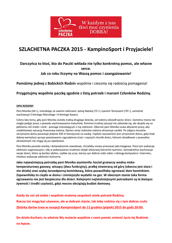 SZLACHETNA PACZKA 2015 - KampinoSport i Przyjaciele! Darczyńca to ktoś, kto do Paczki wkłada nie tylko konkretną pomoc, ale własne serce. Jak co roku liczymy na Waszą pomoc i zaangażowanie! Pomóżmy jednej z Babickich Rodzin wspólnie i cieszmy się radością pomagania! Przygotujmy wspólnie paczkę zgodnie z listą potrzeb i marzeń Członków Rodziny. OPIS RODZINY Pani Monika (44 l.), mieszkając ze swoimi rodzicami: panią Natalią (75 l.) i panem Tomaszem (79 l.), samotnie wychowuje 5-letniego Marcelego i 4-letniego Kacpra. Cztery lata temu, gdy pani Monika została matką drugiego dziecka, od rodziny odszedł ojciec dzieci. Samotna mama nie mogła podjąć pracy z powodu wychowywania maluchów. Pomimo trudnej sytuacji nie załamała się, ale skupiła się na pełnieniu roli matki i córki - pomaga mieszkającym z nią rodzicom. Obecnie pani Monika szuka aktywnie pracy, aby ustabilizować sytuację finansową rodziny. Oprócz renty rodziców rodzina otrzymuje zasiłek. Po odjęciu kosztów utrzymania domu pozostaje jedynie 430 zł miesięcznie na osobę. Ciężkim wyzwaniem jest utrzymanie domu, gdyż brak dobrej wentylacji sprzyja powstawaniu zagrzybienia ścian i częstych chorób dzieci, którymi dziadkowie z powodów zdrowotnych nie mogą się już opiekować. Pani Monika posiada wiedzę i doświadczenie zawodowe, chciałaby znowu pracować jako księgowa. Poza tym wykazuje zdolności organizacyjne i siłę w pokonywaniu trudności dzięki właściwej hierarchii wartości. Samodzielnie wychowuje swoje dzieci, które są bardzo zdolne, szybko się uczą: starszy syn dobrze radzi sobie z obsługą komputera i internetu, młodszy wykazuje zdolności kulinarne. Jako najważniejszą potrzebę pani Monika wymieniła: kocioł grzewczy wodny niskotemperaturowy gazowy, wiszący (dwu funkcyjny), pralkę otwieraną od góry (obecna jest stara i nie działa) oraz szybę żaroodporną kominkową, która pozwoliłaby ogrzewać dom kominkiem. Zapewniłoby to ciepło w domu i zmniejszyło wydatki na gaz. W obecnym stanie taka forma ogrzewania nie jest bezpieczna dla dzieci. Kolejnymi najistotniejszymi potrzebami są te bieżące: żywność i środki czystości, gdyż mocno obciążają budżet domowy. Każdy da coś od siebie i wspólnie możemy zaspokoić wiele potrzeb Rodziny. Rzeczy też mogą być używane, ale w dobrym stanie, tak żeby rodzina się z tym dobrze czuła. Zbiórka darów trwa w recepcji KampinoSport do 11 grudnia (piątek) 2015 do godz.20:00. Do dzieła Kochani, to właśnie Wy możecie wspólnie z nami pomóc zmienić życie tej Rodzinie na lepsze. POTRZEBY RODZINY Żywność trwała: Podstawowe produkty żywnościowe: Herbata, Kawa, Ryż, Kasza, Makaron, Mąka, Cukier, Olej, Dżem, Konserwy mięsne, Konserwy rybne, Warzywa w puszkach, słodycze dla dzieci, mleko UHT Specjalne produkty żywieniowe: produkty bezglutenowe - dla Pani Moniki Środki czystości i artykuły higieniczne: Potrzebne środki czystości: Proszek do prania, Płyn do mycia naczyń, Mydło/żel myjący, Płyny czyszczące, Szczoteczka do zębów, Artykuły dziecięce: szampon dla dzieci Inne: pasta do zębów bez fluoru ODZIEŻ I OBUWIE Lp Płeć Rodzaj (letnie/zimowe/ przejściowe) Kategoria (bluzka, spodnie, kurtka itp.) Rozmiar na 8-letnie dziecko na 7-letnie dziecko 121 cm (wys.) 36 36 36 Sylwetka 1 M zimowe rękawiczki 2 M zimowe rękawiczki 3 4 5 6 M K K K zimowe zimowe przejściowe podkoszulki sweter bluza golf Lp 1 2 3 Płeć Rodzaj (letnie / zimowe / przejściowe) Kategoria (klapki, tenisówki, kozaki itp.) Rozmiar M zimowe buty spacerowe 31-32 M zimowe buty spacerowe 30-31 K kapcie 38 Uwagi szczupła szczupła szczupła szczupła Uwagi Wyposażenie: • szyba żaroodporna kominkowa o wym. 60x38,5 cm (wym. na zewnątrz drzwiczek 57x36 cm) dla • • • • zapewnienia ciepła i zmniejszenia wydatków na gaz; kocioł grzewczy wodny nisko-temperaturowy gazowy, wiszący (dwu funkcyjny) o mocy 100W obecny jest stary i funkcjonuje nie najlepiej, rodziny na zakup nie stać nowego; pralka otwierana od góry - obecna jest stara i nie działa; robot kuchenny do ucierania, rozdrabniania, tarcia (np.ziemniaków) - obecny jest popsuty, opał do kominka (drewno) Szczególne upominki: Dzieci bardzo by się ucieszyły z zabawek: Kacper z samolotu, a Marceli z samochodu.