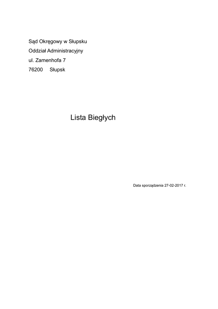 Sąd Okręgowy w Słupsku Oddział Administracyjny ul. Zamenhofa 7 76200 Słupsk Lista Biegłych Data sporządzenia 27-02-2017 r. Lista biegłych sądowych Architektura Lp. Nazwisko i Imię Dane adresowe 1 mgr inż. Urząd Pozctowy Gdynia 1 PANASEWICZ Anna ul.10 Lutego10 skr.pocztowa178 Małgorzata 81-301 Gdynia tel. 504 559 285 e-mail:[email protected] Strona 2 Zakres Specjalność architektura krajobrazu - ogrodnictwo - dendrologia - urządzanie zieleni, w tym zabytkowej - pielęgnacja zieleni, również zabytkowej Okres kadencji do 2017 r. Currenda Sp. z.o.o. SOPOT, program Oddział Administracyjny wersja 1.10.83.1 Wydruk z dnia 27-02-2017 12:21 Lista biegłych sądowych Badania biologiczne Lp. Nazwisko i Imię 1 mgr ŁUCZAK Wojciech Strona 3 Dane adresowe Zakres Specjalność Laboratorium Diagnostyki Molekularnej " GenMed" genetyka człowieka ul. Kramarska 2 61-765 Poznań tel. 502-684-881 Okres kadencji do 2021 r. Currenda Sp. z.o.o. SOPOT, program Oddział Administracyjny wersja 1.10.83.1 Wydruk z dnia 27-02-2017 12:21 Lista biegłych sądowych Badania daktyloskopijne Lp. Nazwisko i Imię 1 mgr KRUCZKOWSKA Izabela 2 mgr ŁOWIECKI Bogdan Strona 4 Dane adresowe Komenda Miejska Policji Sekcja Techniki Kryminalistycznej ul. 3-go Maja 1 76-200 Słupsk tel. 0-59 84-32-970 604-253-266 e-mail:[email protected] Komenda Miejska Policji Sekcja Techniki Kryminalistycznej ul. 3-go Maja 1 76-200 Słupsk tel. 0-59 814-69-62 Zakres Specjalność Okres kadencji do badania daktyloskopijne 2017 r. badania daktyloskopijne, biegły sądowy wykonuje wyłącznie opinie na zeleceni Wydziałów Pracy i Ubezpieczeń Społecznych poczynając od dnia 01.07.2013 r. 2017 r. Currenda Sp. z.o.o. SOPOT, program Oddział Administracyjny wersja 1.10.83.1 Wydruk z dnia 27-02-2017 12:21 Lista biegłych sądowych Badania dokumentów Lp. Nazwisko i Imię 1 mgr BUŁKA Sławomir 2 mgr Buśko Tomasz Dane adresowe Zakres Specjalność ul. Drzymały 20/1 78-200 Białogard tel. 508 185 524 ul. Pasieczna 27 81-639 Gdynia tel. tel. 503 033 586 Okres kadencji do kryminalistyczne badania dokumentów i pisma ręcznego 2019 r. kryminalistyczne klasyczne badania dokumentów 2019 r. grafologia i psychografologia 2019 r. badanie pisma ręcznego i dokumentów 2018 r. kryminalistyczne badania dokumentów 2019 r. kryminalistyczne, techniczne badanie dokumentów 2018 r. badanie pisma ręcznego 2018 r. badanie pisma ręcznego 2017 r. badania dokumentów 2020 r. pisma ręcznego oraz technicznego badania dokumentów 2018 r. badanie porównywawcze pisma ręcznego i podpisów 2018 r. e-mail:[email protected] 3 mgr GORZKOWSKA Karolina 4 mgr GUENTZEL Elżbieta tel. 505 842 830 e-mail:[email protected] Prime Food Sp zoo ul. Młyńska 43b 77-320 Przechlewo tel. 0-59 83-34-505 wew. 107 606-902-782 5 mgr GUMOWSKI Paweł Środkowo Pomorski Zespół Rzeczoznawców i Ekspertów Sądowych ul. Paderewskiego 5 76-200 Słupsk tel. 0-59 842-35-42 502-030-829 6 mgr HABKOWSKI Kurierów Armii Krajowej 2c/5 Mariusz 80-041 Gdańsk tel. 513-85-66-55 7 mgr ul. Dywizji Wołyńskiej 37C/3 JANISZEWSKA80-041 Gdańsk RYBKA Anna tel. 501-182-819 8 mgr inż. Jankowska ul. Cygańska Góra 27b/11 Małgorzata 80-171 Gdańsk tel. tel. 608 445 409 9 mgr MOSTOWIK Środkowo Pomorski Zespół Rzeczoznawców i Bogdan Ekspertów Sądowych ul. Paderewskiego 5 76-200 Słupsk tel. 0-59 842-35-42 607-717-200 10 mgr Oleśnicki Miła 14 Fabian 84-242 Luzino tel. 698 776 692 11 mgr WERYŃSKA Bolesława Prusa 11/10 Anna 76-200 Słupsk tel. 664 476 503 e-mail:[email protected] Strona 5 Currenda Sp. z.o.o. SOPOT, program Oddział Administracyjny wersja 1.10.83.1 Wydruk z dnia 27-02-2017 12:21 Lista biegłych sądowych Badania mechanoskopijne oraz ocena mechanicznych i elektroni Lp. Nazwisko i Imię Dane adresowe 1 mgr inż. MAJEWSKI B.Śmiałego 54 Mirosław 78-200 Białogard tel. 602 465 403 2 inż. Woźniak Marek ul. Dmowskiego 2/2 76-200 Słupsk tel. 605089553 Zakres Specjalność badania mechanoskopijne (oznakowanie identyfikacja pojazdów samochodowych, traseologicznych) badania menachoskopijne Okres kadencji do 2021 r. 2020 r. e-mail:[email protected]. Strona 6 Currenda Sp. z.o.o. SOPOT, program Oddział Administracyjny wersja 1.10.83.1 Wydruk z dnia 27-02-2017 12:21 Lista biegłych sądowych Badania wypadków komunikacyjnych Lp. Nazwisko i Imię 1 dr inż. DOBRUCKI Kazimierz 2 inż. DZIUBA Bronisław 3 mgr Kuczyński Łukasz Dane adresowe Zakres Specjalność Biuro Biegłego Sądowego skr. poczt. 30 65-182 Zielona Góra tel. 601-57-16-12 e-mail:[email protected] ul. Bukowa 64 76-200 Słupsk tel. 0-601 94-68-60 0-59 842 88 62 d. Maltańska 8 75-430 Koszalin tel. 603 239 916 e-mail:[email protected]; 4 mgr inż. MAJEWSKI B.Śmigłego 54 Mirosław 78-200 Białogard tel. 602 465 403 5 mgr inż. ul. Długosza 13 A MIKOŁAJCZYK 76-200 Słupsk Grzegorz tel. 0-59 841-44-12 0-605 78-79-29 0-59 81-00-875 6 mgr inż. OLEX Środkowo Pomorski Zespół Rzeczoznawców i Tomasz Ekspertów Sądowych ul. Paderewskiego 5 76-200 Słupsk tel. 0 60145-46-36 0-59 840-08-75 7 inż. POŁOŃSKI ul. Bydgoska 70 Leszek 64-920 Piła tel. 0-59 86-29-658 0-59 86-26-558 691 387-970 8 mgr SZCZYPIŃSKI Rafał e-mail:[email protected] ul. Wołkowyska 7/3 80-283 Gdańsk tel. 0-603-601-612 9 mgr inż. SZYCA Maciej e-mail:[email protected] ul. Parkowa 2 76-251 Kobylnica tel. 602 342 285 10 mgr Wiczkowski Zbigniew 11 mgr inż. WOLFF Zbigniew 12 mgr ZMYSŁOWSKI Jan e-mail:[email protected] Wojewódzki Ośrodek Ruchu Drogowego ul. Mierosławskiego 10 76-200 Słupsk tel. 0-59 84-12-800 0-59 842-48-39 501-787-422 e-mail:[email protected] UNIQA Towarzystwo Ubezpieczeń S.A. Biuro Likwidacji Szkód ul. Jaracza 28 76-200 Słupsk tel. 0-59 84-20-190 Wodnica 82 76-270 Ustka tel. 601 66 38 32 Okres kadencji do analiza i odtwarzanie wypadków drogowych 2020 r. wycena sprawnych i po wypadku pojazdów samochodowych pochodzących z Zachodu, weryfikacja rachunków napraw wykonanych w Polsce i w Niemczech; kryminalistyczno-techniczna rek