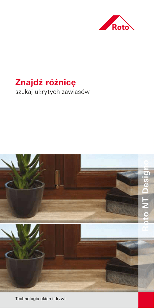 Znajdź różnicę Roto NT Designo szukaj ukrytych zawiasów Technologia okien i drzwi Design Roto NT Designo to ulubieniec wymagających estetów Właściciele pięknego domu mają na ogół wysokie wymagania w odniesieniu do estetyki okien. Zgodnie z obecnymi trendami im mniej widoczny jest „mechanizm” okna, tym ładniej. Zawiasy i inne elementy okucia mogłyby zakłócać harmonię i minimalizm formy okna. W tej dziedzinie Roto NT Designo wyznacza nowe standardy. Design Elegancki styl: Roto NT Designo – esteta wśród okuć do okien Innowacyjny system okuć, których nie widać na oknie Ukryte zawiasy, brak "narzucających się" osłonek – nic nie zakłóca szlachetnego wyglądu okna. Gładkie powierzchnie okien bez wystających elementów i zakamarków to także oszczędność czasu podczas ich mycia. Dzięki zintegrowanemu w zawiasie ogranicznikowi maksymalny kąt otwarcia nie przekracza 100º, co przeciwdziała przypadkowemu uderzaniu skrzydła o obramowanie okna. Jednocześnie otwarte skrzydło umożliwia pełny dostęp do okna i nie przesłania widoku na zewnątrz. Możliwość montażu dodatkowych okuć antywyważeniowych Roto NT Designo ma stosunkowo małe, kompaktowe zawiasy, dzięki czemu na obwodzie okucia jest dość miejsca na dozbrojenie okna nawet do klasy odporności antywłamaniowej WK2*. Elegancka klamka RotoSwing w wersji Secustik® dodatkowo podnosi poziom zabezpieczeń antywłamaniowych okna. Wyższe wymogi zabezpieczeń spełni odmiana RotoSwing zamykana na klucz. 10 0° Bezpieczne i wygodne otwarcie na 100º Klamka RotoSwing z ukrytą rozetką Prostota i wyrafinowana elegancja. Dzięki zastosowaniu inteligentnych rozwiązań technicznych w wersji Secustik® zabezpiecza obwód okucia przed przesunięciem od zewnątrz. Także do dużych i ciężkich skrzydeł Duże okna i drzwi balkonowe zasługują na odpowiednią oprawę Liczy się perfekcyjny wygląd i duża nośność Duże przeszklenia i okna z kilkuwarstwowymi szybami termoizolacyjnymi lub dźwiękoszczelnymi są niezwykle efektowne, ale jednocześnie bardzo ciężkie. Skrzydła o masie powyżej 100 kg nie należą dziś do rzadkości. Potrzebne są zatem „dyskretne” i zarazem "silne" oraz łatwe w montażu okucia do tych eleganckich i ciężkich okien z zawiasami ukrytymi. Rozwiązanie: Roto NT Designo 150 kg Stabilność ciężkich skrzydeł o masie do 150 kg zapewnia masywny odciążnik skrzydła Jest to jedyne na rynku, całkowicie ukryte okucie przeznaczone głównie do dużych i ciężkich skrzydeł o masie do 150 kg. Dwa dodatkowe i niewidoczny z zewnątrz elementy konstrukcyjne wystarczają, aby uzyskać maksymalną nośność i stabilność skrzydła. Okucie to odznacza się ponadto wysoką odpornością na włamanie – do klasy WK2* zgodnie z DIN EN 1627-1630 – m.in. dzięki zabezpieczeniu zawiasu dolnego przed wyważeniem oraz połączeniu teowemu w mechanizmie uchyłu. * Klasy odporności antywyważeniowej okna (WK) odnoszą się zawsze do całego okna jako elementu budowlanego. O spełnieniu wymogów klasy obok okucia decydują wymagane przez normy odpowiednie szyby, profile oraz staranne wykonanie i montaż okna. Roto Frank Okucia Budowlane Sp. z o.o. Technologia okien i drzwi Wał Miedzeszyński 402 03-994 Warszawa Telefon +48 22 / 567 09 00 Telefaks+48 22 / 567 09 09 [email protected] www.roto.pl B&N Stan: styczeń 2011. Zastrzega się możliwość zmian. PB 718-1 PL © 2008 Roto Frank AG ® Roto jest zastrzeżonym znakiem handlowym Twój specjalista w dziedzinie okien: