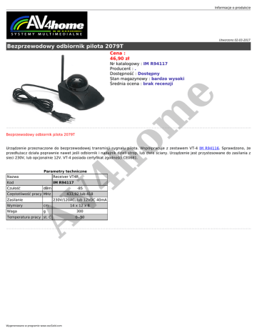 Informacje o produkcie Utworzono 02-03-2017 Bezprzewodowy odbiornik pilota 2079T Cena : 46,90 zł om e Nr katalogowy : IM R94117 Producent : . Dostępność : Dostępny Stan magazynowy : bardzo wysoki Średnia ocena : brak recenzji Bezprzewodowy odbiornik pilota 2079T 4h Urządzenie przeznaczone do bezprzewodowej transmisji sygnału pilota. Współpracuje z zestawem VT-4 IM R94116. Sprawdzono, że przedłużacz działa poprawnie nawet jeśli odbiornik i nadajnik dzieli strop, lub dwie ściany. Urządzenie jest przystosowane do zasilania z sieci 230V, lub opcjonalnie 12V. VT-4 posiada certyfikat zgodności CE0681. Parametry techniczne Nazwa Receiver VT4R Kod IM R94117 Czułość dBm -85 433,92 lub 418 AV Częstotliwość pracy MHz Zasilanie 230V/120AC, lub 12VDC 40mA Wymiary cm Waga g Temperatura pracy st. C Wygenerowano w programie www.oscGold.com 14 x 12 x 8 300 0--50