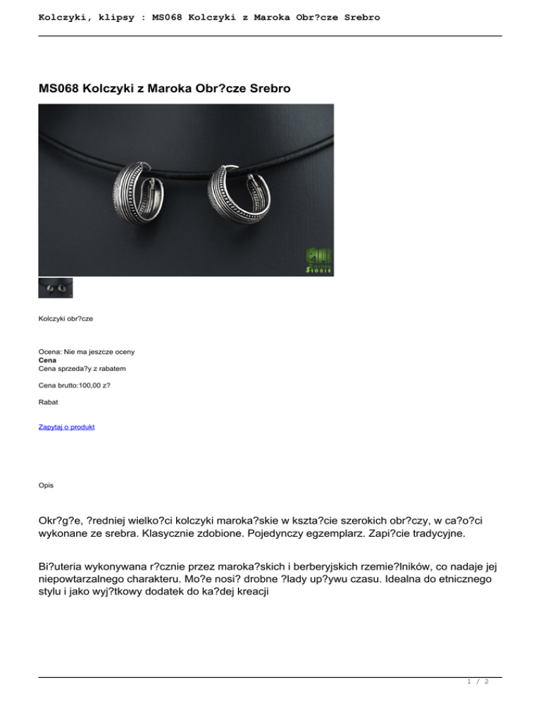 Kolczyki, klipsy : MS068 Kolczyki z Maroka Obr?cze Srebro MS068 Kolczyki z Maroka Obr?cze Srebro Kolczyki obr?cze Ocena: Nie ma jeszcze oceny Cena Cena sprzeda?y z rabatem Cena brutto:100,00 z? Rabat Zapytaj o produkt Opis Okr?g?e, ?redniej wielko?ci kolczyki maroka?skie w kszta?cie szerokich obr?czy, w ca?o?ci wykonane ze srebra. Klasycznie zdobione. Pojedynczy egzemplarz. Zapi?cie tradycyjne. Bi?uteria wykonywana r?cznie przez maroka?skich i berberyjskich rzemie?lników, co nadaje jej niepowtarzalnego charakteru. Mo?e nosi? drobne ?lady up?ywu czasu. Idealna do etnicznego stylu i jako wyj?tkowy dodatek do ka?dej kreacji 1 / 2 Kolczyki, klipsy : MS068 Kolczyki z Maroka Obr?cze Srebro Kamie?: Brak Kolor kamienia: Nie dotyczy Materia?: Srebro Waga: 3,4 g Wymiary ca?o?ci: D?ugo?? 2,2 cm; Szeroko?? 2 cm; Grubo?? 0,7 cm Kraj pochodzenia: Maroko W zestawie ozdobne pude?eczko. Opinie Nikt jeszcze nie recenzowa? tego produktu. 2 / 2 Powered by TCPDF (www.tcpdf.org)