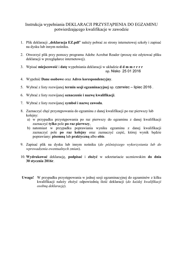Instrukcja wypełniania DEKLARACJI PRZYSTĄPIENIA DO EGZAMINU potwierdzającego kwalifikacje w zawodzie 1. Plik deklaracji „deklaracja EZ.pdf” należy pobrać ze strony internetowej szkoły i zapisać na dysku lub innym nośniku. 2. Otworzyć plik przy pomocy programu Adobe Acrobat Reader (proszę nie edytować pliku deklaracji w przeglądarce internetowej). 3. Wpisać miejscowość i datę wypełniania deklaracji w układzie d d m m r r r r np. Nisko 25 01 2016 4. Wypełnić Dane osobowe oraz Adres korespondencyjny. 5. Wybrać z listy rozwijanej termin sesji egzaminacyjnej np. czerwiec – lipiec 2016 . 6. Wybrać z listy rozwijanej oznaczenie i nazwę kwalifikacji. 7. Wybrać z listy rozwijanej symbol i nazwę zawodu. 8. Zaznaczyć chęć przystępowania do egzaminu z danej kwalifikacji po raz pierwszy lub kolejny: a) w przypadku przystępowania po raz pierwszy do egzaminu z danej kwalifikacji zaznaczyć tylko pole po raz pierwszy, b) natomiast w przypadku poprawiania wyniku egzaminu z danej kwalifikacji zaznaczyć pole po raz kolejny oraz zaznaczyć część, której wynik będzie poprawiany: pisemną lub praktyczną albo obie. 9. Zapisać plik na dysku lub innym nośniku (do późniejszego wykorzystania lub do wprowadzenia ewentualnych zmian). 10. Wydrukować deklarację, podpisać i złożyć w sekretariacie uczniowskim do dnia 30 stycznia 2016r. Uwaga! W przypadku przystępowania w jednej sesji egzaminacyjnej do egzaminów z kilku kwalifikacji należy złożyć odpowiednią ilość deklaracji (do każdej kwalifikacji osobną deklarację).