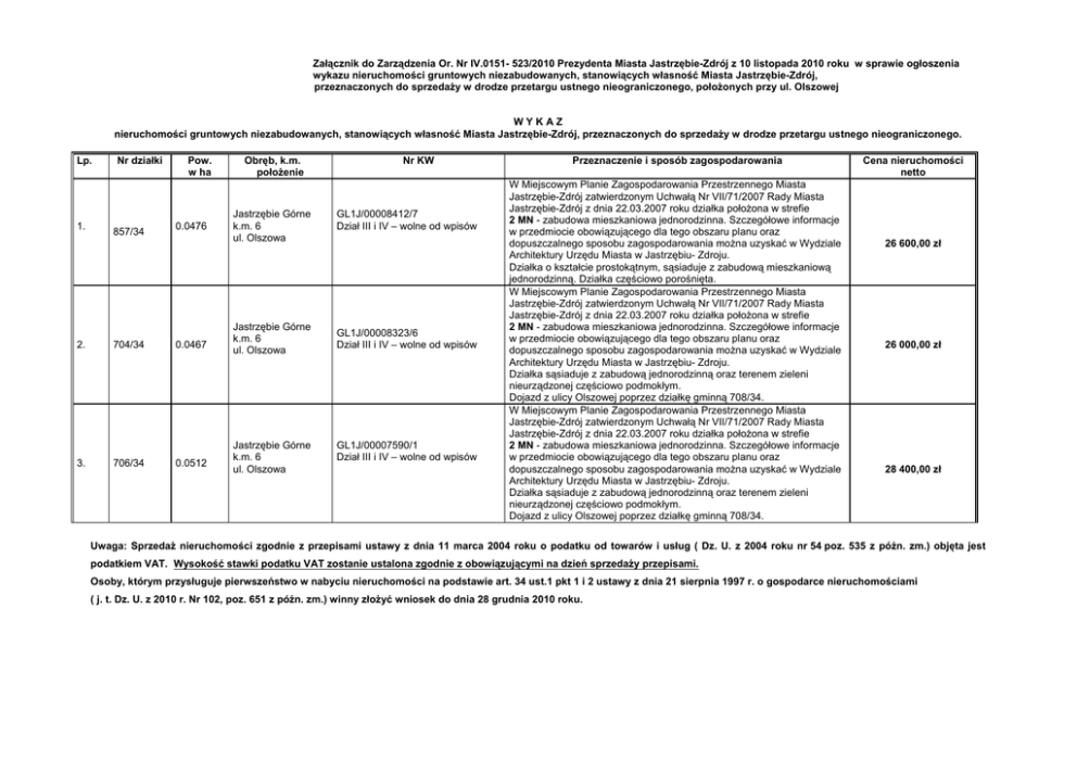 Załącznik do Zarządzenia Or. Nr IV.0151- 523/2010 Prezydenta Miasta Jastrzębie-Zdrój z 10 listopada 2010 roku w sprawie ogłoszenia wykazu nieruchomości gruntowych niezabudowanych, stanowiących własność Miasta Jastrzębie-Zdrój, przeznaczonych do sprzedaży w drodze przetargu ustnego nieograniczonego, położonych przy ul. Olszowej WYKAZ nieruchomości gruntowych niezabudowanych, stanowiących własność Miasta Jastrzębie-Zdrój, przeznaczonych do sprzedaży w drodze przetargu ustnego nieograniczonego. Lp. 1. 2. 3. Nr działki 857/34 704/34 706/34 Pow. w ha 0.0476 0.0467 0.0512 Obręb, k.m. położenie Jastrzębie Górne k.m. 6 ul. Olszowa Jastrzębie Górne k.m. 6 ul. Olszowa Jastrzębie Górne k.m. 6 ul. Olszowa Nr KW GL1J/00008412/7 Dział III i IV – wolne od wpisów GL1J/00008323/6 Dział III i IV – wolne od wpisów GL1J/00007590/1 Dział III i IV – wolne od wpisów Przeznaczenie i sposób zagospodarowania W Miejscowym Planie Zagospodarowania Przestrzennego Miasta Jastrzębie-Zdrój zatwierdzonym Uchwałą Nr VII/71/2007 Rady Miasta Jastrzębie-Zdrój z dnia 22.03.2007 roku działka położona w strefie 2 MN - zabudowa mieszkaniowa jednorodzinna. Szczegółowe informacje w przedmiocie obowiązującego dla tego obszaru planu oraz dopuszczalnego sposobu zagospodarowania można uzyskać w Wydziale Architektury Urzędu Miasta w Jastrzębiu- Zdroju. Działka o kształcie prostokątnym, sąsiaduje z zabudową mieszkaniową jednorodzinną. Działka częściowo porośnięta. W Miejscowym Planie Zagospodarowania Przestrzennego Miasta Jastrzębie-Zdrój zatwierdzonym Uchwałą Nr VII/71/2007 Rady Miasta Jastrzębie-Zdrój z dnia 22.03.2007 roku działka położona w strefie 2 MN - zabudowa mieszkaniowa jednorodzinna. Szczegółowe informacje w przedmiocie obowiązującego dla tego obszaru planu oraz dopuszczalnego sposobu zagospodarowania można uzyskać w Wydziale Architektury Urzędu Miasta w Jastrzębiu- Zdroju. Działka sąsiaduje z zabudową jednorodzinną oraz terenem zieleni nieurządzonej częściowo podmokłym. Dojazd z ulicy Olszowej poprzez działkę gminną 708/34. W Miejscowym Planie Zagospodarowania Przestrzennego Miasta Jastrzębie-Zdrój zatwierdzonym Uchwałą Nr VII/71/2007 Rady Miasta Jastrzębie-Zdrój z dnia 22.03.2007 roku działka położona w strefie 2 MN - zabudowa mieszkaniowa jednorodzinna. Szczegółowe informacje w przedmiocie obowiązującego dla tego obszaru planu oraz dopuszczalnego sposobu zagospodarowania można uzyskać w Wydziale Architektury Urzędu Miasta w Jastrzębiu- Zdroju. Działka sąsiaduje z zabudową jednorodzinną oraz terenem zieleni nieurządzonej częściowo podmokłym. Dojazd z ulicy Olszowej poprzez działkę gminną 708/34. Cena nieruchomości netto 26 600,00 zł 26 000,00 zł 28 400,00 zł Uwaga: Sprzedaż nieruchomości zgodnie z przepisami ustawy z dnia 11 marca 2004 roku o podatku od towarów i usług ( Dz. U. z 2004 roku nr 54 poz. 535 z późn. zm.) objęta jest podatkiem VAT. Wysokość stawki podatku VAT zostanie ustalona zgodnie z obowiązującymi na dzień sprzedaży przepisami. Osoby, którym przysługuje pierwszeństwo w nabyciu nieruchomości na podstawie art. 34 ust.1 pkt 1 i 2 ustawy z dnia 21 sierpnia 1997 r. o gospodarce nieruchomościami ( j. t. Dz. U. z 2010 r. Nr 102, poz. 651 z późn. zm.) winny złożyć wniosek do dnia 28 grudnia 2010 roku.