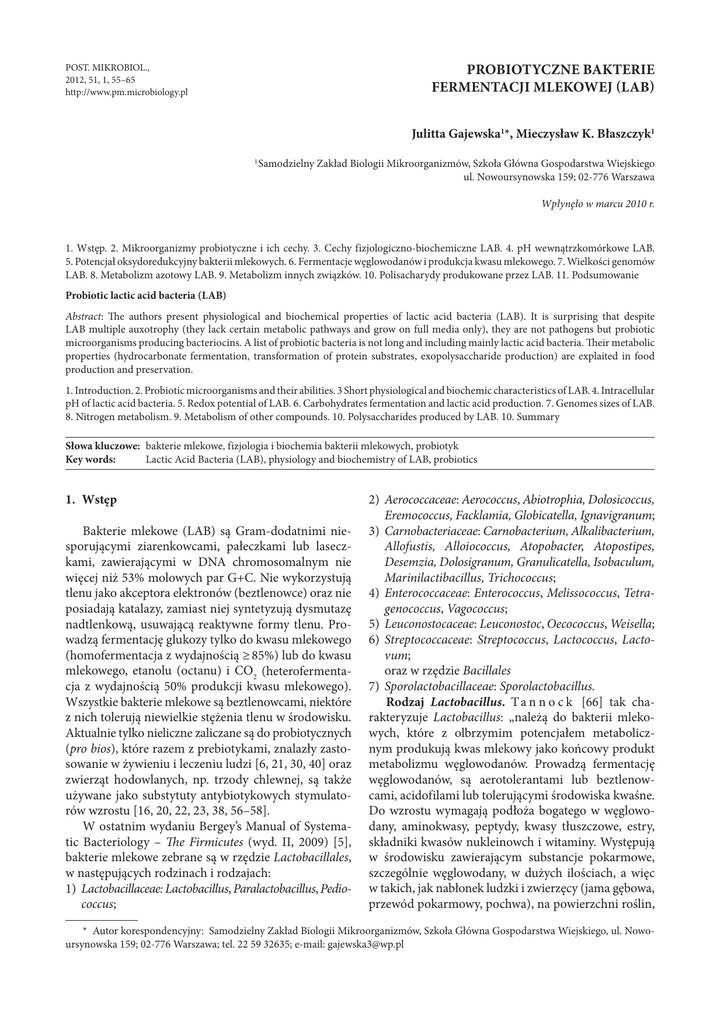 POST. MIKROBIOL., 2012, 51, 1, 55–65 http://www.pm.microbiology.pl PROBIOTYCZNE BAKTERIE FERMENTACJI MLEKOWEJ (LAB) Julitta Gajewska1*, Mieczysław K. Błaszczyk1 1 Samodzielny Zakład Biologii Mikroorganizmów, Szkoła Główna Gospodarstwa Wiejskiego ul. Nowoursynowska 159; 02-776 Warszawa Wpłynęło w marcu 2010 r. 1. Wstęp. 2. Mikroorganizmy probiotyczne i ich cechy. 3. Cechy fizjologiczno-biochemiczne LAB. 4. pH wewnątrzkomórkowe LAB. 5. Potencjał oksydoredukcyjny bakterii mlekowych. 6. Fermentacje węglowodanów i produkcja kwasu mlekowego. 7. Wielkości genomów LAB. 8. Metabolizm azotowy LAB. 9. Metabolizm innych związków. 10. Polisacharydy produkowane przez LAB. 11. Podsumowanie Probiotic lactic acid bacteria (LAB) Abstract: The authors present physiological and biochemical properties of lactic acid bacteria (LAB). It is surprising that despite LAB multiple auxotrophy (they lack certain metabolic pathways and grow on full media only), they are not pathogens but probiotic microorganisms producing bacteriocins. A list of probiotic bacteria is not long and including mainly lactic acid bacteria. Their metabolic properties (hydrocarbonate fermentation, transformation of protein substrates, exopolysaccharide production) are explaited in food production and preservation. 1. Introduction. 2. Probiotic microorganisms and their abilities. 3 Short physiological and biochemic characteristics of LAB. 4. Intracellular pH of lactic acid bacteria. 5. Redox potential of LAB. 6. Carbohydrates fermentation and lactic acid production. 7. Genomes sizes of LAB. 8. Nitrogen metabolism. 9. Metabolism of other compounds. 10. Polysaccharides produced by LAB. 10. Summary Słowa kluczowe: bakterie mlekowe, fizjologia i biochemia bakterii mlekowych, probiotyk Key words: Lactic Acid Bacteria (LAB), physiology and biochemistry of LAB, probiotics 1. Wstęp Bakterie mlekowe (LAB) są Gram-dodatnimi niesporującymi ziarenkowcami, pałeczkami lub laseczkami, zawierającymi w DNA chromosomalnym nie więcej niż 53% molowych par G+C. Nie wykorzystują tlenu jako akceptora elektronów (beztlenowce) oraz nie posiadają katalazy, zamiast niej syntetyzują dysmutazę nadtlenkową, usuwającą reaktywne formy tlenu. Prowadzą fermentację glukozy tylko do kwasu mlekowego (homofermentacja z wydajnością ≥ 85%) lub do kwasu mlekowego, etanolu (octanu) i CO2 (heterofermentacja z wydajnością 50% produkcji kwasu mlekowego). Wszystkie bakterie mlekowe są beztlenowcami, niektóre z nich tolerują niewielkie stężenia tlenu w środowisku. Aktualnie tylko nieliczne zaliczane są do probiotycznych (pro bios), które razem z prebiotykami, znalazły zastosowanie w żywieniu i leczeniu ludzi [6, 21, 30, 40] oraz zwierząt hodowlanych, np. trzody chlewnej, są także używane jako substytuty antybiotykowych stymulatorów wzrostu [16, 20, 22, 23, 38, 56–58]. W ostatnim wydaniu Bergey’s Manual of Systematic Bacteriology – The Firmicutes (wyd. II, 2009) [5], bakterie mlekowe zebrane są w rzędzie Lactobacillales, w następujących rodzinach i rodzajach: 1) Lactobacillaceae: Lactobacillus, Paralactobacillus, Pediococcus; 2) Aerococcaceae: Aerococcus, Abiotrophia, Dolosicoccus, Eremococcus, Facklamia, Globicatella, Ignavigranum; 3) Carnobacteriaceae: Carnobacterium, Alkalibacterium, Allofustis, Alloiococcus, Atopobacter, Atopostipes, Desemzia, Dolosigranum, Granulicatella, Isobaculum, Marinilactibacillus, Trichococcus; 4) Enterococcaceae: Enterococcus, Melissococcus, Tetragenococcus, Vagococcus; 5) Leuconostocaceae: Leuconostoc, Oecococcus, Weisella; 6) Streptococcaceae: Streptococcus, Lactococcus, Lactovum; oraz w rzędzie Bacillales 7) Sporolactobacillaceae: Sporolactobacillus. Rodzaj Lactobacillus. T a n n o c k [66] tak charakteryzuje Lactobacillus: „należą do bakterii mlekowych, które z olbrzymim potencjałem metabolicznym produkują kwas mlekowy jako końcowy produkt metabolizmu węglowodanów. Prowadzą fermentację węglowodanów, są aerotolerantami lub beztlenowcami, acidofilami lub tolerującymi środowiska kwaśne. Do wzrostu wymagają podłoża bogatego w węglowodany, aminokwasy, peptydy, kwasy tłuszczowe, estry, składniki kwasów nukleinowch i witaminy. Występują w środowisku zawierającym substancje pokarmowe, szczególnie węglowodany, w dużych ilościach, a więc w takich, jak nabłonek ludzki i zwierzęcy (jama gębowa, przewód pokarmowy, pochwa), na powierzchni roślin, * Autor korespondencyjny: Samodzielny Zakład Biologii Mikroorganizmów, Szkoła Główna Gospodarstwa Wiejskiego, ul. Nowoursynowska 159; 02-776 Warszawa; tel. 22 59 32635; e-mail: [email protected] 56 JULITTA GAJEWSKA, MIECZYSŁAW K. BŁASZCZYK w odchodach, ściekach oraz fermentowanej i psującej się żywności. Lactobacillus pojawiają się w przewodzie pokarmowym ludzi zaraz po urodzeniu.” U zdrowego dorosłego człowieka Lactobacillus występują w jamie ustnej w ilości 103–107 jednostek tworzących kolonie jtk/ml, jelicie krętym w ilości 103–107 jtk/ml, w okrężnicy w ilości 104–108 jtk/ml oraz dominują wśród wspólnoty bakterii pochwy. Są wykorzystywane w produkcji fermentowanej żywności: warzyw, mięsa, a w szczególności fermentowanych produktów mlecznych. Zainteresowanie bakteriami z rodzaju Lactobacillus rośnie, głównie z powodów biotechnologicznych, czego wyrazem są poszukiwania nowych gatunków. I tak w 1984 roku znano 44 gatunki Lactobacilli, 88 w 2003 a 135 gatunków 2007, zaś w następnym roku znaleziono i opisano kolejnych 10 gatunków. Lactobacillus jest rodzajem wysoko heterogennym (G+C w DNA od 33 do 55%). Do tej pory zsekwencjonowano genomy następujących gatunków: L. acidophilus, L. delbrueckii subsp. bulgaricus, L. johnsonii, L. sakei, L. salivarius i L. plantarum [4]. Taksonomia i miejsce filogenetyczne gatunków rodzaju Lactobacillus nie korespondują z właściwościami metabolicznymi. 145 gatunków bakterii mlekowych [13], należących do Lactobacilli wedle typu