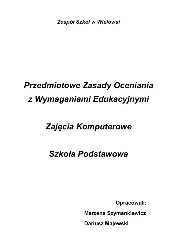 Zespół Szkół w Wielowsi Przedmiotowe Zasady Oceniania z Wymaganiami Edukacyjnymi Zajęcia Komputerowe Szkoła Podstawowa Opracowali: Marzena Szymankiewicz Dariusz Majewski 1. Uczniowie i rodzice znają zasady oceniania i wymagań na poszczególne stopnie szkolne. 2. Nauczyciel w swojej pracy: uwzględnia potrzeby i zainteresowania ucznia, docenia samodzielność pracy uczniów (np. pomysły zadań), włącza wszystkich uczniów do aktywnej pracy na lekcji, stwarza możliwości współpracy, daje szanse wykazania się uczniom o różnych uzdolnieniach, organizuje twórczą pracę na lekcji, tworzy sytuacje, w których uczniowie odkrywają samodzielnie nowe możliwości (komputera i oprogramowania), wykorzystuje odpowiednie pomoce dydaktyczne - mobilizuje uczniów do samodzielnego ich przygotowania, mobilizuje uczniów do korzystania z różnych źródeł informacji, uczy oceny i samooceny. 3. Z uwagi na charakter przedmiotu, ocenianie osiągnięć uczniów odbywa się najczęściej przez zadania praktyczne (uczeń odpytywany jest podczas pracy z komputerem). ocena stawiana jest za samodzielność w pracy, staranność wykonania, postępy ucznia w nauce. na bieżąco nauczyciel sprawdza prawidłowość wykonywanych zadań, wskazuje braki i niedociągnięcia w umiejętnościach uczniów, mobilizuje uczniów do samooceny. 4. Sprawdzenie wiadomości teoretycznych uczniów - odbywa się w formie kartkówek i sprawdzianów. Kartkówki są niezapowiadane i obejmują materiał do 3 lekcji w tył. Sprawdziany zapowiadane są uczniom z tygodniowym wyprzedzeniem (podawany jest zakres materiału). 0 - 30% 31% - 40% 51% - 70% 71% - 90% 91% - 100% pow. 100% + zad dodatkowe niedostateczny dopuszczający dostateczny dobry bardzo dobry celujący Uczeń, który nie był obecny na sprawdzianie z przyczyn usprawiedliwionych pisze go w terminie ustalonym z nauczycielem, ale nie później, niż 2 tygodnie po powrocie do szkoły. Ocena uzyskana ze sprawdzianu może być przez ucznia poprawiona w terminie i na zasadach ustalonych wcześniej z nauczycielem. Poprawiać ocenę ze sprawdzianu można tylko raz. 5. Kryteria śródrocznego i końcowo rocznego oceniania. podstawą do wystawienia oceny śródrocznej i końcowo rocznej są oceny cząstkowe, jednakże nie jest ona średnią arytmetyczną ocen uzyskanych w ciągu okresu/roku, ocena końcowo roczna jest łączną oceną dwóch okresów, na miesiąc przed planowanym posiedzeniem klasyfikacyjnym rady pedagogicznej nauczyciel jest zobowiązany powiadomić ucznia o grożącej ocenie niedostatecznej, informacje o planowanej ocenie okresowej/rocznej nauczyciel podaje na dwa tygodnie przed terminem klasyfikacji okresowej/rocznej, uczeń ma prawo znać ocenę z przedmiotu na co najmniej 7 dni przed planowanym posiedzeniem klasyfikacyjnym rady pedagogicznej. 6. Zasady informacji zwrotnej Nauczyciel – rodzic. Nauczyciel rodziców informuje o: wymaganiach i kryteriach oceniania, aktualnym stopniu rozwoju i postępach w nauce ucznia, trudnościach ucznia w nauce oraz daje wskazówki do pracy z uczniem. Nauczyciel – uczeń. wystawia oceny jawne i uzasadnia je, informuje uczniów o wymaganiach i kryteriach oceniania, pomaga w samodzielnym rozwoju, motywuje do dalszej pracy. 7. W przypadku uczniów z opinią Poradni Psychologiczno - Pedagogicznej należy obniżyć wymagania na poszczególne oceny. Nauczyciel musi podejść do takiego ucznia indywidualnie. Wymagania edukacyjne dla przedmiotu zajęcia komputerowe (na poziomie szkoły podstawowej) Uwaga! W wymaganiach dla wyższych ocen zawierają się również wymagania na oceny niższe. Temat (rozumiany jako lekcja) Regulamin i przepisy BHP obowiązujące w pracowni informatycznej; organizacja zajęć Komputer nie jest zabawką Co jest w środku komputera? Wymagania na ocenę dopuszczającą. Uczeń: Wymagania na ocenę dostateczną. Uczeń: Wymagania na ocenę dobrą. Uczeń: Każdy uczeń: - zna zagrożenia związane z niewłaściwym korzystaniem z komputera - dba o sprzęt w pracowni - bezpiecznie korzysta z urządzeń elektrycznych w pracowni - przyjmuje prawidłową postawę podczas pracy z komputerem - przestrzega przepisów regulaminu pracowni - wie, w jakich - prawidłowo nazywa - prawidłowo nazywa i urządzeniach stosuje się różne rodzaje opisuje przeznaczenie sterowanie komputerów i opisuje poszczególnych łączy komputerowe, w tym w ich zastosowanie komputera, w tym urządzeniach - określa zalety złączy dźwiękowych, powszechnego użytku, stosowania magistrali USB, RJ-45 np. telefonach itp. poszczególnych - wybiera odpowiednie - wie, jakie cechy rodzajów komputerów złącze do danego sterowania urządzenia komputerowego peryferyjnego pozwalają na jego szerokie zastosowanie - wie, czym jest płyta - rozpoznaje rodzaje - prawidłowo główna i rozpoznaje gniazd na obudowie rozpoznaje i nazywa proces, pamięć oraz komputera, wie, co większość elementów kartę graficzną może do nich stacjonarnego podłączyć komputera osobistego - rozpoznaje rodzaje gniazd na obudowie komputera, wie, co może do nich podłączyć Wymagania na ocenę bardzo dobrą. Uczeń: Wymagania na ocenę celującą. Uczeń: - poprawnie nazywa i opisuje przeznaczenie popularnych urządzeń peryferyjnych - wie, jaki wpływ na działanie komputerów mają parametry ich elementów składowych, np. pojemność pamięci, szybkość procesora itp. - określa funkcje wskazanych elementów komputera - zna niektóre parametry elementów komputera, np. pojemność pamięci - umie prawidłowo podłączyć podstawowe elementy komputera – dysk twardy, napęd optyczny, kartę rozszerzeń Co ożywia komputer? - definiuje system operacyjny i wymienia nazwy podstawowych systemów: Windows XP, Vista 7, 8, Mac OS, Linux (np. Ubuntu), Android - świadomie posługuje się ikonami, określając ich funkcję na podstawie wyglądu - stosuje zasady higieny pracy z komputerem - instaluje programy w systemie Windows wyposażone w kreatora in