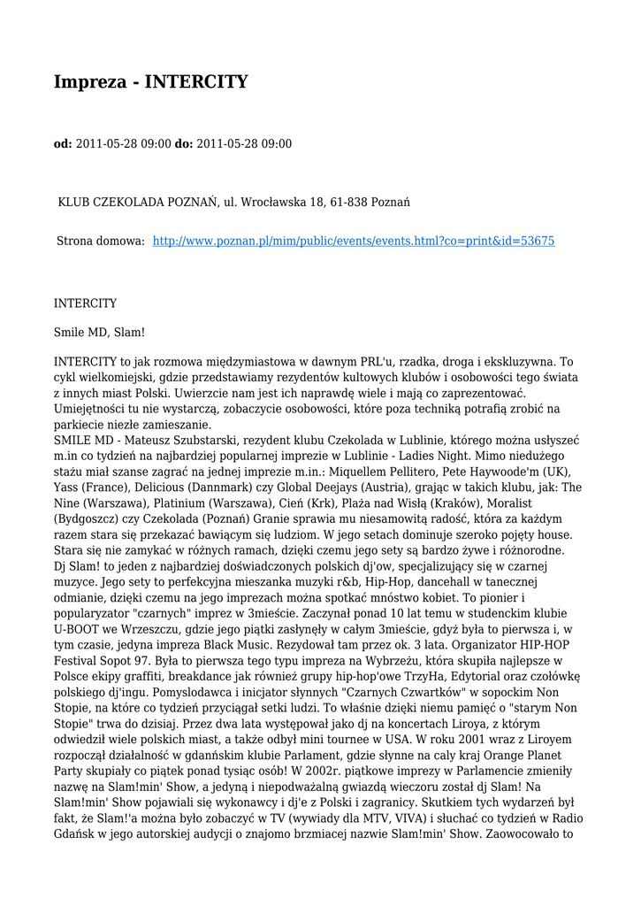 Impreza - INTERCITY od: 2011-05-28 09:00 do: 2011-05-28 09:00 KLUB CZEKOLADA POZNAŃ, ul. Wrocławska 18, 61-838 Poznań Strona domowa: http://www.poznan.pl/mim/public/events/events.html?co=print&id=53675 INTERCITY Smile MD, Slam! INTERCITY to jak rozmowa międzymiastowa w dawnym PRL'u, rzadka, droga i ekskluzywna. To cykl wielkomiejski, gdzie przedstawiamy rezydentów kultowych klubów i osobowości tego świata z innych miast Polski. Uwierzcie nam jest ich naprawdę wiele i mają co zaprezentować. Umiejętności tu nie wystarczą, zobaczycie osobowości, które poza techniką potrafią zrobić na parkiecie niezłe zamieszanie. SMILE MD - Mateusz Szubstarski, rezydent klubu Czekolada w Lublinie, którego można usłyszeć m.in co tydzień na najbardziej popularnej imprezie w Lublinie - Ladies Night. Mimo niedużego stażu miał szanse zagrać na jednej imprezie m.in.: Miquellem Pellitero, Pete Haywoode'm (UK), Yass (France), Delicious (Dannmark) czy Global Deejays (Austria), grając w takich klubu, jak: The Nine (Warszawa), Platinium (Warszawa), Cień (Krk), Plaża nad Wisłą (Kraków), Moralist (Bydgoszcz) czy Czekolada (Poznań) Granie sprawia mu niesamowitą radość, która za każdym razem stara się przekazać bawiącym się ludziom. W jego setach dominuje szeroko pojęty house. Stara się nie zamykać w różnych ramach, dzięki czemu jego sety są bardzo żywe i różnorodne. Dj Slam! to jeden z najbardziej doświadczonych polskich dj'ow, specjalizujący się w czarnej muzyce. Jego sety to perfekcyjna mieszanka muzyki r&b, Hip-Hop, dancehall w tanecznej odmianie, dzięki czemu na jego imprezach można spotkać mnóstwo kobiet. To pionier i popularyzator "czarnych" imprez w 3mieście. Zaczynał ponad 10 lat temu w studenckim klubie U-BOOT we Wrzeszczu, gdzie jego piątki zasłynęły w całym 3mieście, gdyż była to pierwsza i, w tym czasie, jedyna impreza Black Music. Rezydował tam przez ok. 3 lata. Organizator HIP-HOP Festival Sopot 97. Była to pierwsza tego typu impreza na Wybrzeżu, która skupiła najlepsze w Polsce ekipy graffiti, breakdance jak również grupy hip-hop'owe TrzyHa, Edytorial oraz czołówkę polskiego dj'ingu. Pomyslodawca i inicjator słynnych "Czarnych Czwartków" w sopockim Non Stopie, na które co tydzień przyciągał setki ludzi. To właśnie dzięki niemu pamięć o "starym Non Stopie" trwa do dzisiaj. Przez dwa lata występował jako dj na koncertach Liroya, z którym odwiedził wiele polskich miast, a także odbył mini tournee w USA. W roku 2001 wraz z Liroyem rozpoczął działalność w gdanńskim klubie Parlament, gdzie słynne na caly kraj Orange Planet Party skupiały co piątek ponad tysiąc osób! W 2002r. piątkowe imprezy w Parlamencie zmieniły nazwę na Slam!min' Show, a jedyną i niepodważalną gwiazdą wieczoru został dj Slam! Na Slam!min' Show pojawiali się wykonawcy i dj'e z Polski i zagranicy. Skutkiem tych wydarzeń był fakt, że Slam!'a można było zobaczyć w TV (wywiady dla MTV, VIVA) i słuchać co tydzień w Radio Gdańsk w jego autorskiej audycji o znajomo brzmiacej nazwie Slam!min' Show. Zaowocowało to również kontraktami sponsorskimi (Fubu, Camden Town, Chrom). Przez wakacje 2004r., co czwartek rezydował w sopockim klubie Viva, gdzie jego występ przychodziło oglądać co tydzień prawie dwa tysiące osób! Potwierdziło to niewątpliwie jego klasę. Tam też gościł swoich kolegów 'po fachu' m.in. dj 600V, dj Kostek, dj Oki (Niemcy) oraz MC Bunny & Redge z grupy Da B.R.E.A.K. W miedzyczasie występował na imprezach w wielu miastach Polski m.in. w Warszawie (Scena 2000, Nemo) jak również w Niemczech (Prisma, BBC, PM). Od września 2004r. mieszka w Niemczech, gdzie szybko został zauważony i doceniony. Supporty i imprezy z artystami z USA, m.in. Shai, Horace Brown, Dru Hill, Fatman Scoop, świadczą o tym, że Slam! to nietuzinkowy DJ i dobrze wykorzystuje czas na obczyźnie. W żadnym klubie nie rezyduje na stałe, dzięki czemu występuje w znanych klubach wielu miast. SMILE MD (Lublin), SLAM! (Sopot) Start: 21.00, wstęp: 20 pln / selekcja Źródło: http://www.poznan.pl/mim/public/events/events…