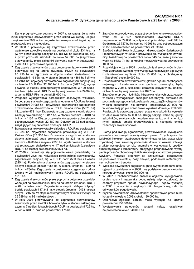 ZAŁĄCZNIK NR 1 do zarządzenia nr 31 dyrektora generalnego Lasów Państwowych z 25 kwietnia 2008 r. Dane prognostyczne zebrane w 2007 r. wskazują, że w roku 2008 zagrożenie drzewostanów przez szkodliwe owady ulegnie zwiększeniu o 30% wobec zagrożenia z roku poprzedniego i będzie przedstawiało się następująco. W 2008 r. przewiduje się zagrożenie drzewostanów przez ważniejsze szkodliwe owady na powierzchni około 234 tys. ha (w tym przez foliofagi sosny na ok. 181 tys. ha i świerka 400 ha), a przez pozostałe szkodniki na około 52 600 ha (zagrożenie drzewostanów przez szkodniki pierwotne sosny w poszczególnych RDLP przedstawia rycina 1). Zagrożenie drzewostanów przez brudnicę mniszkę w roku 2008 przewiduje się na terenie dwunastu RDLP, na powierzchni 26 450 ha – zagrożenie w stopniu słabym stwierdzono na powierzchni 19 628 ha, w stopniu średnim na 4361 ha i silnym na 2461 ha; najwięcej drzewostanów zagrożonych znajduje się na terenie RDLP Piła (12 706 ha) i Szczecin (4077 ha); występowanie w stopniu ostrzegawczym odnotowano w 120 nadleśnictwach (dwunastu RDLP), na łącznej powierzchni 69 862 ha, w tym w RDLP Piła na ponad 26 000 ha. Prognoza występowania boreczników sosnowych wskazuje, że będą one stanowiły zagrożenie w jedenastu RDLP, na łącznej powierzchni 21 987 ha – największe powierzchnie zagrożonych drzewostanów stwierdzono w RDLP Zielona Góra (5575 ha) i Szczecin (4731 ha). Drzewostany zagrożone w stopniu słabym zajmują powierzchnię 16 817 ha, w stopniu średnim – 4040 ha i silnym – 1130 ha. Obszar drzewostanów zagrożonych w stopniu ostrzegawczym wynosi 22 889 ha. Dotyczy on 72 nadleśnictw znajdujących się na terenie dziesięciu RDLP. Barczatka sosnówka wystąpi w dziewięciu RDLP, na powierzchni 30 226 ha. Największe zagrożenie przewiduje się w RDLP Zielona Góra (17 300 ha). Drzewostany zagrożone w stopniu słabym zajmować będą powierzchnię 18 325 ha, w stopniu średnim – 6906 ha i silnym – 4995 ha. Występowanie w stopniu ostrzegawczym stwierdzono w 47 nadleśnictwach (dziewięciu RDLP), na łącznej powierzchni 22 824 ha. W 2008 r. przewiduje się pojawienie osnui gwiaździstej na powierzchni 2421 ha. Największe powierzchnie drzewostanów zagrożonych znajdują się w RDLP Łódź (550 ha) i Poznań (525 ha). Powierzchnia drzewostanów zagrożonych w stopniu słabym obejmuje obszar 1058 ha, w stopniu średnim – 629 ha i silnym – 734 ha. Zagrożenie na poziomie ostrzegawczym odnotowano w 25 nadleśnictwach (ośmiu RDLP), na powierzchni 1918 ha. Zagrożenie drzewostanów przez poprocha cetyniaka przewidywane jest na powierzchni 20 050 ha na terenie dwunastu RDLP, w 69 nadleśnictwach. Zagrożenie w stopniu słabym dotyczyć będzie powierzchni 17 342 ha, w stopniu średnim – 2493 ha oraz silnym – 215 ha. W stopniu ostrzegawczym szkodnik wystąpi na 25 289 ha, w 98 nadleśnictwach. W roku 2008 przewidywane jest zagrożenie drzewostanów sosnowych przez siwiotka borowca tylko w stopniu ostrzegawczym, w 7 nadleśnictwach dwóch RDLP na powierzchni 725 ha, w tym w RDLP Toruń na powierzchni 475 ha. • • • • • • • • Zagrożenie powodowane przez strzygonię choinówkę przewidy• • • • wane jest w 107 nadleśnictwach (dwunastu RDLP) na powierzchni 79 830 ha, w tym w stopniu: słabym na 43 808 ha, średnim na 25 727 ha i silnym na 10 295 ha oraz ostrzegawczym w 135 nadleśnictwach na powierzchni 79 830 ha. Spośród szkodników liściożernych drzewostanów świerkowych i modrzewiowych w 2008 r. przewiduje się wystąpienie zawodnicy świerkowej na powierzchni około 343 ha, zasnuj świerkowych na blisko 71 ha, a krobika modrzewiowca na powierzchni 1000 ha. Przewiduje się, że w 2008 r. powierzchnia drzewostanów liściastych, zagrożona wzmożonym występowaniem zwójek dębowych i miernikowców, wyniesie około 10 000 ha, a chrabąszczy – (imagines) około 20 000 ha. Szkodniki korzeni drzew i krzewów, głównie pędraki chrabąszcza majowego i kasztanowca oraz guniaka czerwczyka, będą zagrażać w 2008 r. szkółkom i uprawom leśnym w 359 nadleśnictwach, na łącznej powierzchni 1677 ha. Zagrożenie upraw, młodników i drągowin iglastych przez owady w stopniu wymagającym zabiegów ochronnych, określone na podstawie występowania i zwalczania poszczególnych gatunków w roku poprzednim, nie powinno przekroczyć 20 000 ha. W omawianej grupie szkodników wyraźnie dominuje szeliniak. Powierzchnia upraw zagrożonych przez tego szkodnika wyniesie w 2008 roku około 15 000 ha. Drugą pozycję wśród tej grupy szkodników, zwalczanych metodami mechanicznymi i chemicznymi, zajmuje smolik drągowinowiec, a następnie smolik znaczony i zwójki sosnowe. Biorąc pod uwagę ograniczoną przewidywalność wystąpienia procesów chorobowych wywoływanych przez różnych sprawców (wielkość inokulum grzybowego determinowana jest przez wiele czynników) oraz zmienną podatność drzew w okresie infekcji, a także występujące co roku anomalie w występowaniu opadów atmosferycznych i temperatury, precyzyjne prognozowanie wystąpienia procesów chorobowych i ich skutków jest obarczone pewnym ryzykiem. Poniższe prognozy są szacunkowe, opracowane na podstawie wieloletniej bazy danych, poddanych matematycznym obliczeniom trendów. Wielkość powierzchni zagrożenia grzybowymi chorobami infekcyjnymi przewidywana w 2008 r. na podstawie trendu wielomianowego 2o wynosi około 400 000 ha. W 2007 r. zaobserwowano nasilenie objawów występowania osutek sosny i mączniaka dębu, należy więc oczekiwać, że choroby grzybowe aparatu asymilacyjnego i pędów wystąpią w 2008 r. w wymiarze większym niż ubiegłoroczny, zależnie od warunków pogodowych. Łączna powierzchnia drzewostanów opanowanych przez hubę korzeni wyniesie w 2008 r. około 190 000 ha. Opieńkowa zgnilizna korzeni może wystąpić na łącznej powierzchni 150 000 ha. Występowania patogenów korzeni należy ocz