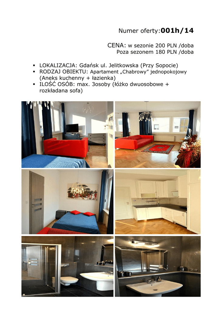 Numer oferty:001h/14 CENA: w sezonie 200 PLN /doba Poza sezonem 180 PLN /doba LOKALIZACJA: Gdańsk ul. Jelitkowska (Przy Sopocie) RODZAJ OBIEKTU: Apartament „Chabrowy” jednopokojowy (Aneks kuchenny + łazienka) ILOŚĆ OSÓB: max. 3osoby (łóżko dwuosobowe + rozkładana sofa) Numer oferty:001h/14 LOKALIZACJA: ul. Jelitkowska (Gdańsk) Lp. PRZEDMIOT OCENY UWAGI 1. Nowe/stare budownictwo Nowe budownictwo 2. Nowe/stare meble Nowe meble 3. Parking na posesji/Garaż 5miejsc parkingowych/ obok parking ogólnodostępny 4. Balkon / taras / ogródek Taras/balkon 5. Telewizor (Kablówka, TV Sat), Radio TV 6. Dostęp do telefonu nie 7. Dostęp do Internetu Tak 8. Dostęp do kuchni: Lodówka Kuchenka Czajnik bezprzewodowy Wyposażenie (sztućce, zastawa, garnki) 9. Kuchnia z pełnym wyposażeniem, lodówka, kuchenka, czajnik bezprzewodowy Dostęp do łazienki: Wanna Kabina prysznicowa Oddzielnie WC Łazienka współużytkowana Łazienka z kabiną prysznicową, WC, 10. Pościel, ręczniki Tak 11. Dostęp do szafy / półek Tak 12. Pobyt ze zwierzątkiem Nie 13. Pokój zamykany na klucz Tak 14. Niepełnosprawni (winda, podjazd) Nie 15. Plac zabaw dla dzieci Nie 16. Gdańsk granica z Sopotem. 200m do morza Spokojna dzielnica Autobusy podmiejskie, tramwaj 17. Lokalizacja Centrum – Dworzec PKP Plaża, park Dzielnica Komunikacja miejska Osoby palące 18. Piwnica/schowek Tak 19. Faktura VAT lub Rachunek Faktura VAT 20. Inne Sauna dodatkowo płatna 25zł/ możliwość śniadania koszt 15zł W wyznaczonych miejscach