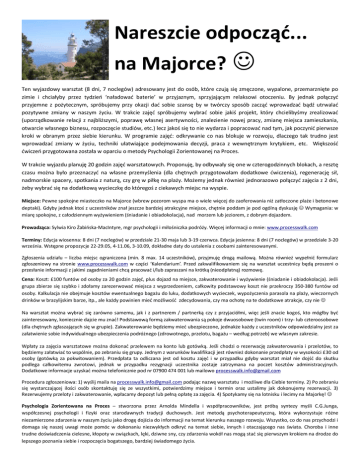 Nareszcie odpocząć... na Majorce? Ten wyjazdowy warsztat (8 dni, 7 noclegów) adresowany jest do osób, które czują się zmęczone, wypalone, przemarznięte po zimie i chciałyby przez tydzień ‘naładować baterie’ w przyjaznym, sprzyjającym relaksowi otoczeniu. By jednak połączyć przyjemne z pożytecznym, spróbujemy przy okazji dać sobie szansę by w twórczy sposób zacząć wprowadzać bądź utrwalać pozytywne zmiany w naszym życiu. W trakcie zajęć spróbujemy wybrać sobie jakiś projekt, który chcielibyśmy zrealizować (uporządkowanie relacji z najbliższymi, poprawę własnej asertywności, znalezienie nowej pracy, zmianę miejsca zamieszkania, otwarcie własnego biznesu, rozpoczęcie studiów, etc.) lecz jakoś się to nie wydarza i popracować nad tym, jak poczynić pierwsze kroki w obranym przez siebie kierunku. W programie zajęć: odkrywanie co nas blokuje w rozwoju, dlaczego tak trudno jest wprowadzać zmiany w życiu, techniki ułatwiające podejmowania decyzji, praca z wewnętrznym krytykiem, etc. Większość ćwiczeń przygotowana została w oparciu o metody Psychologii Zorientowanej na Proces. W trakcie wyjazdu planuję 20 godzin zajęć warsztatowych. Proponuję, by odbywały się one w czterogodzinnych blokach, a resztę czasu można było przeznaczyć na własne przemyślenia (dla chętnych przygotowałam dodatkowe ćwiczenia), regenerację sił, nadmorskie spacery, spotkania z naturą, czy grę w piłkę na plaży. Możemy jednak również jednorazowo połączyć zajęcia z 2 dni, żeby wybrać się na dodatkową wycieczkę do któregoś z ciekawych miejsc na wyspie. Miejsce: Pewne spokojne miasteczko na Majorce (wbrew pozorom wyspa ma o wiele więcej do zaoferowania niż zatłoczone plaże i betonowe deptaki). Gdyby jednak ktoś z uczestników znał jeszcze bardziej atrakcyjne miejsce, chętnie poddam je pod ogólną dyskusję Wymagania: w miarę spokojne, z całodziennym wyżywieniem (śniadanie i obiadokolacja), nad morzem lub jeziorem, z dobrym dojazdem. Prowadząca: Sylwia Kiro Żabińska-MacIntyre, mgr psychologii i miłośniczka podróży. Więcej informacji o mnie: www.processwalk.com Terminy: Edycja wiosenna: 8 dni (7 noclegów) w przedziale 21-30 maja lub 3-19 czerwca. Edycja jesienna: 8 dni (7 noclegów) w przedziale 3-20 września. Wstępne propozycje 22-29.05, 4-11.06, 3-10.09, dokładne daty do ustalenia z osobami zainteresowanymi. Zgłoszenia udziału – liczba miejsc ograniczona (min. 8 max. 14 uczestników), przyjmuję drogą mailową. Można również wypełnić formularz zgłoszeniowy na stronie www.processwalk.com w części ‘Kalendarium’. Przed zakwalifikowaniem się na warsztat uczestnicy będą proszeni o przesłanie informacji z jakimi zagadnieniami chcą pracować i/lub zapraszani na krótką (nieodpłatną) rozmowę. Cena: Koszt: £100 funtów od osoby za 20 godzin zajęć, plus dojazd na miejsce, zakwaterowanie i wyżywienie (śniadanie i obiadokolacja). Jeśli grupa zbierze się szybko i zdołamy zarezerwować miejsca z wyprzedzeniem, całkowity podstawowy koszt nie przekroczy 350-380 funtów od osoby. Kalkulacja nie obejmuje kosztów ewentualnego bagażu do luku, dodatkowych wycieczek, wypożyczenia parasola na plaży, wieczornych drinków w brazylijskim barze, itp., ale każdy powinien mieć możliwość zdecydowania, czy ma ochotę na te dodatkowe atrakcje, czy nie Na warsztat można wybrać się zarówno samemu, jak i z partnerem / partnerką czy z przyjaciółmi, więc jeśli znacie kogoś, kto mógłby być zainteresowany, koniecznie dajcie mu znać! Podstawową formą zakwaterowania są pokoje dwuosobowe (twin room) i trzy- lub czteroosobowe (dla chętnych zgłaszających się w grupie). Zakwaterowanie będziemy mieć ubezpieczone, jednakże każdy z uczestników odpowiedzialny jest za załatwienie sobie indywidualnego ubezpieczenia podróżnego (zdrowotnego, przelotu, bagażu – według potrzeb) we własnym zakresie. Wpłaty za zajęcia warsztatowe można dokonać przelewem na konto lub gotówką. Jeśli chodzi o rezerwację zakwaterowania i przelotów, to będziemy załatwiać to wspólnie, po zebraniu się grupy. Jednym z warunków kwalifikacji jest również dokonanie przedpłaty w wysokości £30 od osoby (gotówką za pokwitowaniem). Przedpłata ta odliczana jest od kosztu zajęć i w przypadku gdyby warsztat miał nie dojść do skutku podlega całkowitemu zwrotowi, jednak w przypadku rezygnacji uczestnika zostaje zatrzymana na poczet kosztów administracyjnych. Dodatkowe informacje uzyskać można telefonicznie pod nr 07900 474 001 lub mailowo [email protected] Procedura zgłoszeniowa: 1) wyślij maila na [email protected] podając nazwę warsztatu i możliwe dla Ciebie terminy. 2) Po zebraniu się wystarczającej ilości osób skontaktuję się ze wszystkimi, potwierdzimy miejsce i termin oraz ustalimy jak dokonujemy rezerwacji. 3) Rezerwujemy przeloty i zakwaterowanie, wpłacamy depozyt lub pełną opłatę za zajęcia. 4) Spotykamy się na lotnisku i lecimy na Majorkę! Psychologia Zorientowana na Proces – stworzona przez Arnolda Mindella i współpracowników, jest próbą syntezy myśli C.G.Junga, współczesnej psychologii i fizyki oraz starodawnych tradycji duchowych. Jest metodą psychoterapeutyczną, która wykorzystuje różne niezamierzone zdarzenia w naszym życiu jako drogę dojścia do informacji na temat kierunku naszego rozwoju. Wszystko, co do nas przychodzi i domaga się naszej uwagi może pomóc w dokonaniu niezwykłych odkryć na temat siebie, innych i otaczającego nas świata. Choroba i inne trudne doświadczenia cielesne, kłopoty w związkach, lęki, dziwne sny, czy zdarzenia wokół nas mogą stać się pierwszym krokiem na drodze do lepszego poznania siebie i rozpoczęcia bogatszego, bardziej świadomego życia.