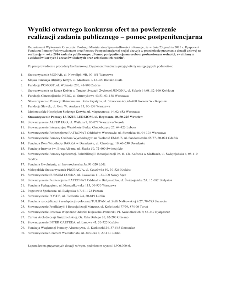 Wyniki otwartego konkursu ofert na powierzenie realizacji zadania publicznego – pomoc postpenitencjarna Departament Wykonania Orzeczeń i Probacji Ministerstwa Sprawiedliwości informuje, że w dniu 23 grudnia 2015 r. Dysponent Funduszu Pomocy Pokrzywdzonym oraz Pomocy Postpenitencjarnej podjął decyzję w przedmiocie przyznania dotacji celowej na realizację w roku 2016 zadania publicznego: „Pomoc postpenitencjarna osobom pozbawionym wolności, zwalnianym z zakładów karnych i aresztów śledczych oraz członkom ich rodzin”. Po przeprowadzeniu procedury konkursowej, Dysponent Funduszu przyjął oferty następujących podmiotów: 1. Stowarzyszenie MONAR, ul. Nowolipki 9B, 00-151 Warszawa 2. Śląska Fundacja Błękitny Krzyż, ul. Mostowa 1, 43-300 Bielsko-Biała 3. Fundacja POMOST, ul. Wolności 276, 41-800 Zabrze 4. Stowarzyszenie na Rzecz Kobiet w Trudnej Sytuacji Życiowej JUNONA, ul. Sokola 14/68, 82-500 Kwidzyn 5. Fundacja Chrześcijańska NEBO, ul. Strumykowa 40/53, 03-138 Warszawa 6. Stowarzyszenie Pomocy Bliźniemu im. Brata Krystyna, ul. Słoneczna 63, 66-400 Gorzów Wielkopolski 7. Fundacja Sławek, ul. Gen. W. Andersa 13, 00-159 Warszawa 8. Mokotowskie Hospicjum Świętego Krzyża, ul. Magazynowa 14, 02-652 Warszawa 9. Stowarzyszenie Pomocy LUDZIE LUDZIOM, ul. Reymonta 10, 50-225 Wrocław 10. Stowarzyszenie ALTER EGO, ul. Wiślana 7, 05-077 Warszawa-Wesoła 11. Stowarzyszenie Integracyjne Wspólnoty Barka, Chudobczyce 27, 64-423 Lubosz 12. Stowarzyszenie Penitencjarne PATRONAT Oddział w Warszawie, ul. Siennicka 48, 04-393 Warszawa 13. Stowarzyszenie Pomocy Osobom Wychodzącym na Wolność EMAUS, ul. Sandomierska 55/57, 80-074 Gdańsk 14. Fundacja Dom Wspólnoty BARKA w Drezdenku, ul. Chrobrego 10, 66-530 Drezdenko 15. Fundacja-Instytut św. Brata Alberta, ul. Śląska 50, 72-600 Świnoujście 16. Stowarzyszenie Pomocy Społecznej, Rehabilitacji i Resocjalizacji im. H. Ch. Kofoeda w Siedlcach, ul. Świętojańska 4, 08-110 Siedlce 17. Fundacja Uwolnienie, ul. Inowrocławska 5a, 91-020 Łódź 18. Małopolskie Stowarzyszenie PROBACJA, ul. Czyżówka 50, 30-526 Kraków 19. Stowarzyszenie SURSUM CORDA, ul. Lwowska 11, 33-300 Nowy Sącz 20. Stowarzyszenie Penitencjarne PATRONAT Oddział w Białymstoku, ul. Świętojańska 2A, 15-082 Białystok 21. Fundacja Pedagogium, ul. Marszałkowska 115, 00-950 Warszawa 22. Pogotowie Społeczne, ul. Bydgoska 6/7, 61-123 Poznań 23. Stowarzyszenie POSTIS, ul. Fieldorfa 7/4, 20-819 Lublin 24. Fundacja resocjalizacji i readaptacji społecznej TULIPAN, ul. Zofii Nałkowskiej 8/27, 70-785 Szczecin 25. Stowarzyszenie Profilaktyki i Resocjalizacji Mateusz, ul. Kościuszki 77/79, 87/100 Toruń 26. Stowarzyszenie Bractwo Więzienne Oddział Kujawsko-Pomorski, Pl. Kościeleckich 7; 85-347 Bydgoszcz 27. Caritas Archidiecezji Gnieźnieńskiej, Os. Orła Białego 20, 62-200 Gniezno 28. Stowarzyszenie INTER CAETERA, ul. Łanowa 43, 30-725 Kraków 29. Fundacja Wzajemnej Pomocy Alternatywa, ul. Karkoszki 24, 37-545 Gomunice 30. Stowarzyszenie Centrum Wolontariatu, ul. Jezuicka 4, 20-113 Lublin. Łączna kwota przyznanych dotacji w/wym. podmiotom wynosi 1.900.000 zł.