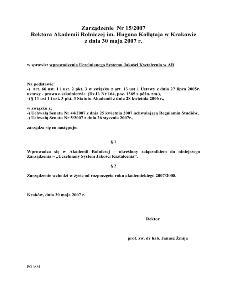 Zarządzenie Nr 15/2007 Rektora Akademii Rolniczej im. Hugona
