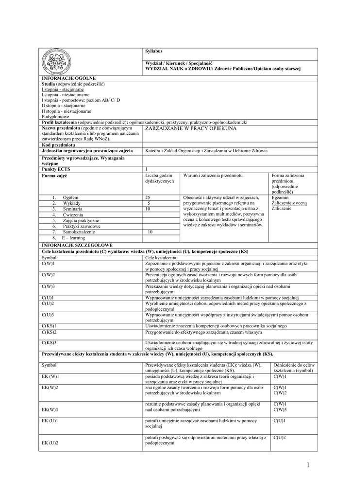 Syllabus Wydział / Kierunek / Specjalność WYDZIAŁ NAUK o ZDROWIU/ Zdrowie Publiczne/Opiekun osoby starszej INFORMACJE OGÓLNE Studia (odpowiednie podkreślić) I stopnia - stacjonarne I stopnia - niestacjonarne I stopnia - pomostowe: poziom AB/ C/ D II stopnia - stacjonarne II stopnia - niestacjonarne Podyplomowe Profil kształcenia (odpowiednie podkreślić): ogólnoakademicki, praktyczny, praktyczno-ogólnoakademicki Nazwa przedmiotu (zgodnie z obowiązującym ZARZĄDZANIE W PRACY OPIEKUNA standardem kształcenia i/lub programem nauczania zatwierdzonym przez Radę WNoZ). Kod przedmiotu Katedra i Zakład Organizacji i Zarządzania w Ochronie Zdrowia Jednostka organizacyjna prowadząca zajęcia Przedmioty wprowadzające. Wymagania wstępne Punkty ECTS Forma zajęć 1. 2. 3. 4. 5. 6. 7. 8. Ogółem Wykłady Seminaria Ćwiczenia Zajęcia praktyczne Praktyki zawodowe Samokształcenie E – learning 1 Liczba godzin dydaktycznych 25 5 10 Warunki zaliczenia przedmiotu Obecność i aktywny udział w zajęciach, przygotowanie pisemnego referatu na wyznaczony temat i prezentacja ustna z wykorzystaniem multimediów, pozytywna ocena z końcowego testu sprawdzającego wiedzę z zakresu wykładów i seminariów. Forma zaliczenia przedmiotu (odpowiednie podkreślić) Egzamin Zaliczenie z oceną Zaliczenie 10 INFORMACJE SZCZEGÓŁOWE Cele kształcenia przedmiotu (C) wynikowe: wiedza (W), umiejętności (U), kompetencje społeczne (KS) Symbol Cele kształcenia C(W)1 Zapoznanie z podstawowymi pojęciami z zakresu organizacji i zarządzania oraz etyki w pomocy społecznej i pracy socjalnej C(W)2 Prezentacja ogólnych zasad tworzenia i rozwoju nowych form pomocy dla osób potrzebujących w środowisku lokalnym C(W)3 Przekazanie wiedzy dotyczącej planowania i organizacji opieki nad osobami potrzebującymi C(U)1 Wypracowanie umiejętności zarządzania zasobami ludzkimi w pomocy socjalnej C(U)2 Wyrobienie umiejętności doboru odpowiednich metod pracy opiekuna społecznego z podopiecznymi C(U)3 Wypracowanie umiejętności współpracy z instytucjami świadczącymi pomoc osobom potrzebującym C(KS)1 Uświadomienie znaczenia kompetencji osobowych pracownika socjalnego C(KS)2 Przygotowanie do efektywnego zarządzania czasem własnym Uświadomienie osobom znajdującym się w trudnej sytuacji zdrowotnej i życiowej istoty organizacji ich czasu wolnego Przewidywane efekty kształcenia studenta w zakresie wiedzy (W), umiejętności (U), kompetencji społecznych (KS). C(KS)3 Symbol EK (W)1 EK(W)2 EK(W)3 EK (U)1 EK (U)2 Przewidywane efekty kształcenia studenta (EK): wiedza (W), umiejętności (U), kompetencje społeczne (KS). posiada podstawową wiedzę z zakresu teorii organizacji i zarządzania oraz etyki w pracy socjalnej zna ogólne zasady tworzenia i rozwoju form pomocy dla osób potrzebujących w środowisku lokalnym Odniesienie do celów kształcenia (symbol) C(W)1 rozumie podstawowe zasady planowania i organizacji opieki nad osobami potrzebującymi C(W)1 C(W)3 potrafi umiejętnie zarządzać zasobami ludzkimi w pomocy socjalnej C(U)1 potrafi posługiwać się odpowiednimi metodami pracy własnej z podopiecznymi C(U)2 C(W)1 C(W)2 1 EK (U)3 posiada umiejętność współpracy z instytucjami świadczącymi pomoc osobom potrzebującym C(U)3 EK (KS)1 rozumie znaczenie kompetencji osobowych pracownika socjalnego, potrafi projektować i organizować proces własnego uczenia się potrafi efektywnie zarządzać czasem własnym C(KS)1 rozumie uświadomienie osobom znajdującym się w trudnej sytuacji zdrowotnej i życiowej istoty organizacji ich czasu wolnego C(KS)1 C(KS)3 C(KS)2 EK (KS)2 EK (KS)3 Treści programowe (TP): opis przedmiotu wynikający z obowiązującego standardu kształcenia i/lub programu nauczania zatwierdzonego przez Radę WNoZ Symbol Forma realizacji treści kształcenia: np. wykład, seminaria, Odniesienie do ćwiczenia, zajęcia praktyczne, praktyki zawodowe, efektów kształcenia samokształcenie, E- learning (symbol) EK (W)1 TP1 – Planowanie i organizacja opieki nad wykład EK (W)3 osobami potrzebującymi EK (KS)3 TP2 – Inicjowanie nowych form pomocy dla osób potrzebujących oraz powoływanie instytucji świadczących pomoc w środowisku lokalnym wykład EK (W)1 EK(W)2 TP3 - Etyka w zarządzaniu i pracy socjalnej wykład EK (W)1 TP4 – Znaczenie organizacji i zarządzania w pomocy społecznej i pracy socjalnej seminaria EK (W)1 EK (U)2 TP5 – Zarządzanie zasobami ludzkimi w pomocy socjalnej seminaria EK (W)1 EK (W)2 EK (U)1 EK (KS)2 TP6 – Kompetencje osobowe pracownika socjalnego seminaria EK (W)1 EK(W)2 EK (U)3 EK (KS)1 TP7 - Metody pracy opiekuna społecznego z człowiekiem potrzebującym pomocy seminaria EK (U)1 EK (U)2 TP8 - Efektywne zarządzanie czasem. Trudności w gospodarowaniu czasem. Techniki zarządzania czasem seminaria EK(W)3 EK (KS)2 TP9 – Współpraca z instytucjami świadczącymi pomoc osobom potrzebującym seminaria EK (W)1 EK (U)3 EK (KS)1 TP10 – Organizacja czasu wolnego osób w trudnej sytuacji zdrowotnej i życiowej seminaria EK (KS)3 Metody dydaktyczne (sposób pracy nauczyciela, umożliwiający osiągnięcie celów kształcenia) Środki dydaktyczne wykorzystywane w procesie kształcenia Wykaz piśmiennictwa dla studenta Piśmiennictwo podstawowe do 4 pozycji Wykład, praca zespołowa, case study, dyskusja moderowana, ćwiczenia symulacyjne. Prezentacja multimedialna, papier A4, mazaki, foliogram, materiały źródłowe. 1. D. Talarska, K. Wieczorowska-Tobis, E. Szwałkiewicz (red.), Opieka nad osobami przewlekle chorymi, w wieku podeszłym i niesamodzielnymi, PZWL, Warszawa 2009. 2. B. Szatur-Jaworska, P. Błędowski, M. Dzięgielewska, Podstawy gerontologii społecznej, Oficyna Wydawnicza ASPRA-JR, Warszawa 2006. 3. D. Becelewska, Wsparcie emocjonalne w pracy socjalnej, Biblioteka pracownika socjalnego, Katowice 2005. 4. T. B. Kulik, M. Latalski, Zdrowie publiczne. Podręcznik dla studentów i absolwentów Wydziałów Pielęgniarstwa i Nauk o Zdrowiu 