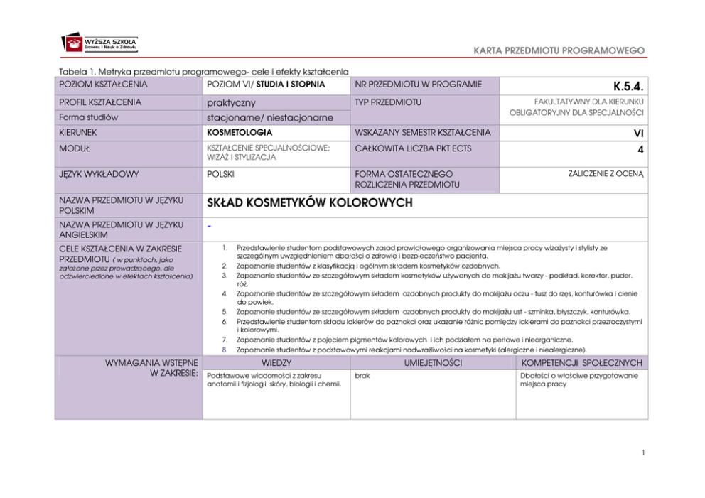 KARTA PRZEDMIOTU PROGRAMOWEGO Tabela 1. Metryka przedmiotu programowego- cele i efekty kształcenia POZIOM KSZTAŁCENIA POZIOM VI/ STUDIA I STOPNIA NR PRZEDMIOTU W PROGRAMIE PROFIL KSZTAŁCENIA praktyczny Forma studiów stacjonarne/ niestacjonarne KIERUNEK KOSMETOLOGIA WSKAZANY SEMESTR KSZTAŁCENIA MODUŁ KSZTAŁCENIE SPECJALNOŚCIOWE; WIZAŻ I STYLIZACJA CAŁKOWITA LICZBA PKT ECTS JĘZYK WYKŁADOWY POLSKI FORMA OSTATECZNEGO ROZLICZENIA PRZEDMIOTU NAZWA PRZEDMIOTU W JĘZYKU POLSKIM SKŁAD KOSMETYKÓW KOLOROWYCH NAZWA PRZEDMIOTU W JĘZYKU ANGIELSKIM - CELE KSZTAŁCENIA W ZAKRESIE PRZEDMIOTU ( w punktach, jako założone przez prowadzącego, ale odzwierciedlone w efektach kształcenia) 1. 2. 3. 4. 5. 6. 7. 8. WYMAGANIA WSTĘPNE W ZAKRESIE: TYP PRZEDMIOTU K.5.4. FAKULTATYWNY DLA KIERUNKU OBLIGATORYJNY DLA SPECJALNOŚCI VI 4 ZALICZENIE Z OCENĄ Przedstawienie studentom podstawowych zasad prawidłowego organizowania miejsca pracy wizażysty i stylisty ze szczególnym uwzględnieniem dbałości o zdrowie i bezpieczeństwo pacjenta. Zapoznanie studentów z klasyfikacją i ogólnym składem kosmetyków ozdobnych. Zapoznanie studentów ze szczegółowym składem kosmetyków używanych do makijażu twarzy - podkład, korektor, puder, róż. Zapoznanie studentów ze szczegółowym składem ozdobnych produkty do makijażu oczu - tusz do rzęs, konturówka i cienie do powiek. Zapoznanie studentów ze szczegółowym składem ozdobnych produkty do makijażu ust - szminka, błyszczyk, konturówka. Przedstawienie studentom składu lakierów do paznokci oraz ukazanie różnic pomiędzy lakierami do paznokci przezroczystymi i kolorowymi. Zapoznanie studentów z pojęciem pigmentów kolorowych i ich podziałem na perłowe i nieorganiczne. Zapoznanie studentów z podstawowymi reakcjami nadwrażliwości na kosmetyki (alergiczne i niealergiczne). WIEDZY Podstawowe wiadomości z zakresu anatomii i fizjologii skóry, biologii i chemii. UMIEJĘTNOŚCI brak KOMPETENCJI SPOŁECZNYCH Dbałości o właściwe przygotowanie miejsca pracy 1 KARTA PRZEDMIOTU PROGRAMOWEGO EFEKTY KSZTAŁCENIA W ZAKRESIE PRZEDMIOTU STUDENT/ ABSOLWENT: W ODNIESIENIU DO OBSZAROWYCH EK W ODNIESIENIU DO KIERUNKOWYCH EK ODNIESIENIE DO FORM ZAJĘĆ W 1. Organizuje stanowisko pracy zgodnie z zasadami higieny i bezpieczeństwa. M1_K07; M1_K06 KK_01; KK_02 X 2. Zna klasyfikację i ogólny skład kosmetyków ozdobnych. M1_W01 KW_02 X 3. Potrafi omówić szczegółowy skład kosmetyków używanych do makijażu twarzy - podkład, korektor, puder, róż. M1_WO1 KW_02 X 4. Potrafi omówić szczegółowy skład ozdobnych produktów do makijażu oczu tusz do rzęs, konturówka i cienie do powiek. M1_W01 KW_02 X 5. Potrafi omówić szczegółowy skład ozdobnych produktów do makijażu ust – szminka, błyszczyk, konturówka. M1_W01 KW_02 X 6. Zna skład lakierów do paznokci oraz potrafi podać różnice pomiędzy lakierami do paznokci przezroczystymi i kolorowymi. M1_W01 KW_02 X 7. Zna definicję pigmentów kolorowych i ich podział na perłowe i nieorganiczne. M1_W01 KW_02 X 8. Potrafi rozpoznać podstawowe reakcje nadwrażliwości na kosmetyki (alergiczne i niealergiczne). M1_W10 KU_07 X Tabela 2. Walidacja i weryfikacja efektów kształcenia EFEKTY KSZTAŁCENIA- student Formy prezentacji EK ĆW/K/W inne Poziomy osiągnięcia EK i odpowiadające im oceny ndst (2) dst (3) db (4) bdb (5) 1. Organizuje stanowisko pracy zgodnie z zasadami higieny i bezpieczeństwa. Wykład. Kolokwium w formie testu wielokrotnego wyboru. Popełnia błędy w przygotowaniu stanowiska pracy. Prawidłowo, choć niezbyt szczegółowo potrafi przygotować stanowisko pracy. Prawidłowo, i dość szczegółowo potrafi przygotować stanowisko pracy. Potrafi w pełni prawidłowo przygotować stanowisko pracy zgodnie z zasadami BHP i troską o pacjenta. 2. Zna klasyfikację i ogólny skład kosmetyków ozdobnych. Wykład. Kolokwium w formie testu wielkokrotnego wyboru Popełnia błędy w omawianiu klasyfikacji i składu kosmetyków ozdobnych. Prawidłowo, choć niezbyt szczegółowo potrafi omówić klasyfikację i skład kosmetyków ozdobnych. Prawidłowo i dość szczegółowo potrafi omówić klasyfikację i skład kosmetyków ozdobnych Prawidłowo, i bardzo szczegółowo potrafi omówić klasyfikację i skład kosmetyków ozdobnych. 3. Potrafi omówić szczegółowy skład kosmetyków używanych do makijażu twarzy - podkład, korektor, puder, róż. Wykład: kolokwium w formie pytań otwartych Popełnia błędy w omawianiu szczegółowego składu kosmetyków używanych do makijażu twarzy. Prawidłowo, choć niezbyt szczegółowo potrafi omówić skład kosmetyków używanych do makijażu twarzy. Prawidłowo, i dość szczegółowo potrafi omówić skład kosmetyków używanych do makijażu twarzy. Prawidłowo, i bardzo szczegółowo potrafi omówić skład kosmetyków używanych do makijażu twarzy. 2 KARTA PRZEDMIOTU PROGRAMOWEGO 4. Potrafi omówić szczegółowy skład ozdobnych produktów do makijażu oczu - tusz do rzęs, konturówka i cienie do powiek. Wykład: kolokwium w formie pytań otwartych. Popełnia błędy w omawianiu szczegółowego składu ozdobnych produktów używanych do makijażu oczu. Prawidłowo, choć niezbyt szczegółowo potrafi omówić szczegółowy skład ozdobnych produktów używanych do makijażu oczu. Prawidłowo i dość szczegółowo potrafi omówić szczegółowy skład ozdobnych produktów używanych do makijażu oczu. Prawidłowo i bardzo szczegółowo potrafi omówić szczegółowy skład ozdobnych produktów używanych do makijażu oczu. 5. Potrafi omówić szczegółowy skład ozdobnych produktów do makijażu ust – szminka, błyszczyk, konturówka. Wykład: kolokwium w formie pytań otwartych. Popełnia błędy w omawianiu szczegółowego składu ozdobnych produktów używanych do makijażu ust. Prawidłowo, choć niezbyt szczegółowo potrafi omówić szczegółowy skład ozdobnych produktów używanych do makijażu ust. Prawidłowo i 