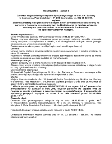 OGŁOSZENIE – pakiet 3 Dyrektor Wojewódzkiego Szpitala Specjalistycznego nr 5 im. św. Barbary w Sosnowcu, Plac Medyków 1, 41-200 Sosnowiec, tel. 032 36 82 701, ogłasza pisemny przetarg nieograniczony na najem 2,0 m2 powierzchni zlokalizowanej na parterze w holu przy wejściu głównym do Szpitala oraz na I piętrze w trzonie windowym z przeznaczeniem na zainstalowanie 2 automatów do sprzedaży gorących napojów. Stawka wywoławcza : Cena wywoławcza czynszu 1m2 za miesiąc wynosi : 505.00 zł + 22% VAT. Stawka czynszu obejmuje ponoszone przez przyszłego najemcę wszelkie pozostałe koszty związane z korzystaniem z obiektu, a w szczególności takie jak: media (energia elektryczna, co, wywóz nieczystości itp.) Zaoferowana stawka czynszu musi być wyższa od stawki wywoławczej. Umowa: Umowa najmu zostanie zawarta zostanie z podmiotem wyłonionym w drodze przetargu na okres 36 miesięcy. Najemca w ramach zawartej umowy nie będzie zobowiązany dodatkowo płacić za media (energia elektryczna, co) oraz podatek od nieruchomości. Warunki przetargu: Oferent związany jest z ofertą na okres 30 dni licząc od daty otwarcia ofert. Oferent, który wygra przetarg zobowiązany jest podpisać umowę dzierżawy w ciągu 14 dni od daty ogłoszenia wyniku przetargu. Unieważnienie przetargu: Wojewódzki Szpital Specjalistyczny Nr 5 im. św. Barbary w Sosnowcu zastrzega sobie prawo zamknięcia przetargu bez wybrania którejkolwiek z ofert. Oferta: Miejsce i termin składania ofert: Wojewódzki Szpital Specjalistyczny Nr 5 im. św. Barbary w Sosnowcu, Plac Medyków 1, w Kancelarii Szpitala /pokój D-0-2/do dnia 28.10.2010r do godz 10.00 w zamkniętej kopercie z napisem: ” Oferta przetargowa nr sprawy NP/DJ/24/10/2010 na najem 2,0 m2 powierzchni zlokalizowanej na parterze w holu przy wejściu głównym do Szpitala oraz na I piętrze w trzonie windowym z przeznaczeniem na zainstalowanie 2 automatów do sprzedaży gorących napojów na okres 3 lat. Nie otwierać przed 28.10.2010r godz. 10 15” Otwarcie ofert: Otwarcie ofert przetargowych odbędzie się w dniu 28.10.2010r o godz. 10.15 w Wojewódzkim Szpitalu Specjalistycznym Nr 5 im. św. Barbary w Sosnowcu, Plac Medyków 1 /Dział Zamówień Publicznych i Monitoringu Dostaw pok. B-1-3/. Przedmiot dzierżawy można oglądać w dni robocze w godz. 10.00-14.00. Dodatkowe informacje można uzyskać pod nr tel. 32 3682753 i 3682477 na stronie internetowej www.wss5.pl nr sprawy NP/DJ/24/10/2010 Sosnowiec dn. ………………… 2010r. . Nazwa i adres Oferenta: …………………………………………………………… ………………………………………………………….. …………………………………………………………. OFERTA – pakiet 3 dla Wojewódzkiego Szpitala Specjalistycznego nr 5 im. św. Barbary w Sosnowcu 41-200, Plac Medyków 1 1. Nawiązując do ogłoszenia o pisemnym przetargu nieograniczonym na najem 2,0 m2 powierzchni zlokalizowanej na parterze w holu przy wejściu głównym do Szpitala oraz na I piętrze w trzonie windowym z przeznaczeniem na zainstalowanie 2 automatów do sprzedaży gorących napojów na okres 3 lat, oferuję: miesięczną stawkę czynszu za najem 1 m2 powierzchni: netto: ……….....…….. słownie: …......................................................................................................... plus należny podatek VAT tj.……………………… słownie:……………………………. brutto : ……………….. słownie:……………………………………………………………............................ Stawka czynszu obejmuje ponoszone koszty związane z korzystaniem z obiektu, takie jak: media (energia elektryczna, co). 2. Okres najmu - 3 lata 3. Oświadczam, że zapoznałem się z regulaminem,warunkami przetargu, projektem umowy i nie wnoszę do nich zastrzeżeń. 4. Oświadczam, że zapoznałem się ze stanem technicznym przedmiotu najmu i nie wnoszę zastrzeżeń. 6. Oświadczam, że uważam się za związanego niniejszą ofertą na okres 30 dni licząc od daty otwarcia oferty. 7.Uprawnionym przedstawicielem do kontaktów z Wynajmującym jest ……………………….........................tel..................................... którego reprezentacja wynika z (KRS, pełnomocnictwo, inne) ………………………………………………………………………………………………..… 8. NIP ........................................................... 9. REGON .................................................... …............................................... podpis oferenta lub osób uprawnionych do występowania w jego imieniu SZCZEGÓŁOWE WARUNKI –pakiet 3 pisemnego przetargu nieograniczonego na najem będącej w użytkowaniu Wojewódzkiego Szpitala Specjalistycznego nr 5 w Sosnowcu 2,0 m2powierzchni zlokalizowanej na parterze w holu przy wejściu głównym do Szpitala oraz na I piętrze w trzonie windowym z przeznaczeniem na zainstalowanie 2 automatów do sprzedaży gorących napojów na okres 3 lat. 1. Przedmiotem przetargu jest najem powierzchni – 2,0 m2 z przeznaczeniem na zainstalowanie 2 automatów na gorące napoje. 2. Przedmiot najmu można oglądać w dni robocze w godz. 10.00-14.00. 3. W przetargu mogą wziąć udział osoby fizyczne i prawne. 4. Cena wywoławcza czynszu 1m2 za miesiąc wynosi : 505.00 zł + 22% VAT. Stawka czynszu obejmuje ponoszone przez przyszłego najemcę wszelkie pozostałe koszty związane z korzystaniem z obiektu, a w szczególności takie jak: media (energia elektryczna,co) 5. Oferta powinna zawierać, zgodnie z załączonym drukiem: - nazwę i adres oferenta - udokumentowany status prawny oferenta - datę sporządzenia oferty - proponowaną miesięczną stawkę czynszu najmu - proponowany okres najmu, który nie może być dłuższy niż 36 miesięcy -podpis oferenta 6. Miejsce i termin składania ofert: Wojewódzki Szpital Specjalistyczny Nr 5 im. św.
