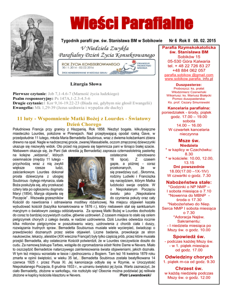 Wieści Parafialne Tygodnik parafii pw. św. Stanisława BM w Sobikowie V Niedziela Zwykła Parafialny Dzień Życia Konsekrowanego Nr 6 Rok II 08. 02. 2015 Parafia Rzymskokatolicka św. Stanisława BM Sobików 15 05-530 Góra Kalwaria tel. + 48 22 726 83 27 +48 884 062 057 parafia.sobikow @gmail.com www.sobikow.parafia. info.pl Liturgia Słowa Pierwsze czytanie: Job 7,1-4.6-7 (Marność życia ludzkiego) Psalm responsoryjny: Ps 147A,1-2.3-4.5-6 Drugie czytanie:1 Kor 9,16-19.22-23 (Biada mi, gdybym nie głosił Ewangelii) Ewangelia: Mk 1,29-39 (Jezus uzdrawia i wypędza złe duchy) 11 luty - Wspomnienie Matki Bożej z Lourdes - Światowy Dzień Chorego Południowa Francja przy granicy z Hiszpanią. Rok 1858. Niezbyt bogate, kilkutysięczne miasteczko Lourdes, położone w Pirenejach. Nad przepływającą opodal rzeką Gave, w przedpołudnie 11 lutego, młoda Maria Bernadetta Soubirous, wraz z dwiema koleżankami zbiera drewno na opał. Nagle w nadrzecznej grocie, zwanej Massabielle, oczom zmęczonej dziewczynki ukazuje się niezwykły widok. Oto przed nią pojawia się tajemnicza pani w lśniąco białej szacie. Niebawem okazuje się, że Pani (tak określa ją Bernadetta) zaprasza czternastoletnią pasterkę na kolejne „widzenia”, których ostatecznie odnotowano osiemnaście (między 11 lutego 16 lipca). Z czasem przychodzą wraz z nią zwykli gapie, a później - coraz większe rzesze ludzi, przekonanych, że w zaściankowym Lourdes dokonał się prawdziwy cud…Skromna, prosta dziewczyna z ubogiej rodziny Ludwiki i Franciszka Soubirous - byłego młynarza, stała się narzędziem, którym Matka Boża posłużyła się, aby przekazać ludzkości swoje orędzie. W cztery lata po ogłoszeniu dogmatu o Niepokalanym Poczęciu Maryi (1854), Maryja objawiła się światu jako „Niepokalane Poczęcie” . Wezwała grzeszników do czynienia pokuty oraz cały Kościół do nawrócenia i odmawiania modlitwy różańcowej. Na miejscu objawień kazała wybudować kościół (bazylika konsekrowana w 1876 r.), który niebawem stał się sanktuarium maryjnym o światowym zasięgu oddziaływania. Za sprawą Matki Bożej w Lourdes dochodziło do coraz to bardziej oczywistych cudów, głównie uzdrowień. Z czasem miejsce to stało się celem pielgrzymek chorych z całego świata, w nadziei uzdrowienia. Dziś Lourdes odwiedza rocznie kilka milionów pielgrzymów w poszukiwaniu wiary, uzdrowienia z chorób ciała i duszy, rozwiązania trudnych spraw. Bernadetta Soubiurous musiała wiele wycierpieć, świadcząc o prawdziwości doznanych przez siebie objawień. Liczne badania, prowokacje ze stron naukowców, lekarzy, ateistów (XIX wieczna Francja!) były tylko częścią prób, przez które musiała przejść Bernadetta, aby ostatecznie Kościół potwierdził, że w Lourdes rzeczywiście doszło do cudu. Za namową biskupa Tarbes, wstąpiła do zgromadzenia sióstr Notre Dame w Nevers. Miało to oszczędzić Bernadetcie natarczywego zainteresowania świata objawieniami, jakich doznała. W tym też miejscu wzrastała w łasce i zjednoczeniu z Bogiem. Tam też 16 kwietnia 1879 roku zmarła w opinii świętości, w wieku 35 lat,. Bernadetta Soubirous została beatyfikowana 14 czerwca 1925 r. przez Piusa XI. Jej kanonizacja odbyła się w Rzymie, w Uroczystość Niepokalanego Poczęcia, 8 grudnia 1933 r., w uznaniu świętości jej życia. Warto zaznaczyć, że ciało Bernadetty, złożone w sarkofagu, nie rozłożyło się! Obecnie można podziwiać jej relikwie złożone w kaplicy kościoła klasztoru w Nevers. /Piotr Lewandowski/ Duszpasterze: Proboszcz: ks. prałat Włodzimierz Czerwiński Wikariusz: ks. Mariusz Białęcki Pomoc duszpasterska: Ks. prof. Cezary Smuniewski Kancelaria parafialna: poniedziałek - środy, piątek godz. 17.00 – 19.00 sobota 14.00 – 16.00 W czwartek kancelaria nieczynna Msze św. Niedziela * w kaplicy w Czachówku: 8.30 * w kościele: 10.00, 12.00, 13.15 Dni powszednie 18.00(17.00 –1X-1IV) W czwartki o godz. 7.30 Nabożeństwa stałe: *Godzinki o NP NMP – I sobota miesiąca o 7.10 *Nowenna do MBNP środa o 17.30 *Nabożeństwo do Niep. Serca NMP I sobota miesiąca o 7.30 *Adoracja Najśw. Sakramentu: - I niedziela miesiąca po Mszy św. o godz. 10.00 Spowiedź św. - podczas każdej Mszy św. - w 1. piątek miesiąca od godz. 17.00 Odwiedziny chorych 1. piątek m-ca od godz. 9.30 Chrzest św. w każdą niedzielę podczas Mszy św. o godz. 12.00 ORĘDZIE OJCA ŚWIĘTEGO NA XXIII ŚWIATOWY DZIEŃ CHOREGO Drodzy bracia i siostry, z okazji XXIII Światowego Dnia Chorego, ustanowionego przez św. Jana Pawła II, zwracam się do Was wszystkich, którzy nosicie ciężar choroby i na wiele sposobów jesteście złączeni z cierpiącym ciałem Chrystusa; jak również do Was, pracowników i wolontariuszy zaangażowanych w służbie zdrowia. Temat w tym roku zaprasza nas do medytacji słów z Księgi Hioba: "Niewidomemu byłem oczami, chromemu służyłem za nogi" (29,15). Chciałbym ją podjąć w perspektywie mądrości serca (sapientia cordis). 1. Mądrość ta nie jest znajomością teoretyczną, abstrakcyjną, wynikiem rozumowania. Raczej jest ona, jak określa ją św. Jakub w swoim Liście, "czysta, dalej, skłonna do zgody, ustępliwa, posłuszna, pełna miłosierdzia i dobrych owoców, wolna od względów ludzkich i obłudy" (3,17). Z tego też powodu jest ona postawą wlaną przez Ducha Świętego w umysły i serca tych, którzy potrafią otworzyć się na cierpienia braci i dostrzec w nich obraz Boga. Uczyńmy zatem naszym zawołanie Psalmu: "Naucz nas liczyć dni nasze / abyśmy osiągnęli mądrość serca" (Ps 90,12). W tej mądrości serca (sapientia cordis), która jest darem Boga, możemy zebrać owoce Światowego Dnia Chorego. 2. Mądrością serca jest służba bliźniemu. W mowie Hioba, która zawiera słowa "Niewidomemu byłem oczami, chromemu służyłem za nogi" jest podkreślony wymiar służby potrzebującym ze strony tego prawego człowieka, który