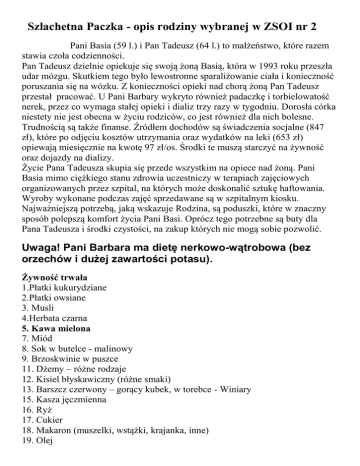 Szlachetna Paczka - opis rodziny wybranej w ZSOI nr 2 Pani Basia (59 l.) i Pan Tadeusz (64 l.) to małżeństwo, które razem stawia czoła codzienności. Pan Tadeusz dzielnie opiekuje się swoją żoną Basią, która w 1993 roku przeszła udar mózgu. Skutkiem tego było lewostronne sparaliżowanie ciała i konieczność poruszania się na wózku. Z konieczności opieki nad chorą żoną Pan Tadeusz przestał pracować. U Pani Barbary wykryto również padaczkę i torbielowatość nerek, przez co wymaga stałej opieki i dializ trzy razy w tygodniu. Dorosła córka niestety nie jest obecna w życiu rodziców, co jest również dla nich bolesne. Trudnością są także finanse. Źródłem dochodów są świadczenia socjalne (847 zł), które po odjęciu kosztów utrzymania oraz wydatków na leki (653 zł) opiewają miesięcznie na kwotę 97 zł/os. Środki te muszą starczyć na żywność oraz dojazdy na dializy. Życie Pana Tadeusza skupia się przede wszystkim na opiece nad żoną. Pani Basia mimo ciężkiego stanu zdrowia uczestniczy w terapiach zajęciowych organizowanych przez szpital, na których może doskonalić sztukę haftowania. Wyroby wykonane podczas zajęć sprzedawane są w szpitalnym kiosku. Najważniejszą potrzebą, jaką wskazuje Rodzina, są poduszki, które w znaczny sposób polepszą komfort życia Pani Basi. Oprócz tego potrzebne są buty dla Pana Tadeusza i środki czystości, na zakup których nie mogą sobie pozwolić. Uwaga! Pani Barbara ma dietę nerkowo-wątrobowa (bez orzechów i dużej zawartości potasu). Żywność trwała 1.Płatki kukurydziane 2.Płatki owsiane 3. Musli 4.Herbata czarna 5. Kawa mielona 7. Miód 8. Sok w butelce - malinowy 9. Brzoskwinie w puszce 11. Dżemy – różne rodzaje 12. Kisiel błyskawiczny (różne smaki) 13. Barszcz czerwony – gorący kubek, w torebce - Winiary 15. Kasza jęczmienna 16. Ryż 17. Cukier 18. Makaron (muszelki, wstążki, krajanka, inne) 19. Olej Puszki: 1. Golonka 2. Mielonka luksusowa 3. Szyneczka z kurcząt Nabiał 1. Ser żółty – pakowany próżniowo 3. Serki białe (takie jak Almette lub Piątnica) 4. Masło (proszę dostarczyć w ostatnich dniach akcji) Wędliny pakowane próżniowo: 1.Szynka drobiowa Środki czystości: 1. Proszek do prania 2. Płyn do mycia naczyń 4. Mydło w kostce 5. Pasta do zębów 6. Płyny czyszczące – do szyb, podłóg, kuchni Słodycze 1. Czekolady nadziewane 3. Wafelki familijne (kakaowe, śmietankowe) Odzież Pan Tadeusz: buty zimowe – rozmiar 40 skarpetki – rozmiar 40 bokserki – S lub M (dla szczupłego mężczyzny) Wyposażenie mieszkania: 1.kołdra (160 x 200) 2. 2 poduszki - Silikonowe 80 x40 cm 3.koc 4.ręczniki 5. pościel standardowa: 180x200 cm – 2 sztuki 6. prześcieradła – duże, flanelowe, bez gumki 7. żarówki energooszczędne – z dużym gwintem 8. żyrandol (nieduży) – zakup: nauczyciele ZSOI 2 Leki 1.Wapno- Calperos Świąteczny upominek: Pani Barbara- róż Bourjois (16 Rose Coup de Foudre), biała mulina do haftu