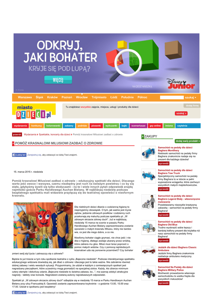 Warszawa Śląsk Kraków Poznań Wrocław Trójmiasto Łódź Południe Północ szukaj ▸ Tu znajdziesz wszystkie zajęcia, miejsca, usługi i produkty dla dzieci: wydarzenia powrót konkursy kolorowanki zabawy podróże piosenki wyliczanki bajki scenariusze Wydarzenia Spektakle, koncerty dla dzieci Pomóż krasnalowi Milusiowi zadbać o zdrowie gry online imiona czytelnia ZAKUPY POMÓŻ KRASNALOWI MILUSIOWI ZADBAĆ O ZDROWIE Lubię to! Zarejestruj się, aby zobaczyć co lubią Twoi znajomi. Samochód na pedały dla dzieci Baghera Montlhery Niebieski samochód na pedały firmy Baghera znakomicie nadaje się na prezent dla każdego dziecka! sprawdź 15. marca 2015 r. niedziela Pomóż krasnalowi Milusiowi zadbać o zdrowie – edukacyjny spektakl dla dzieci. Dlaczego warto jeść owoce i warzywa, czemu niezbędny jest ruch na świeżym powietrzu i co by się stało, gdybyśmy żywili się tylko słodyczami - na te i wiele innych pytań odpowiedź znajdą najmłodsi goście Parku Handlowego Auchan Bielany. W najbliższą niedzielę podczas bezpłatnego spektaklu mali widzowie przyłączą się do teatralnej opowieści o niesfornym krasnalu. Dla niektórych dzieci dbanie o codzienną higienę to nieprzyjemny obowiązek. O tym, jak ważne jest mycie zębów, jedzenie zdrowych posiłków i codzienny ruch przekonają się maluchy podczas spektaklu pt. „W zdrowym skrzacie zdrowy duch". Już w najbliższą niedzielę 15 marca na scenie w pasażu Parku Handlowego Auchan Bielany zaprezentowana zostanie opowieść o małym krasnalu Milusiu, który nie bardzo wie, co jest dla niego dobre, a co nie. Niesforny bohater ciągle grymasi, nie chce jeść i nie dba o higienę, dlatego zostaje ukarany przez wróżkę, która zabiera mu głos. Miluś musi teraz poprosić o pomoc małych widzów. Czy z pomocą najmłodszych krasnalowi uda się ponownie przemówić? Czy bohater zmieni swój styl życia i zatroszczy się o zdrowie? Będzie to już trzecie w tym roku spotkanie teatralne z cyklu „Bajeczne niedziele". Podczas interaktywnego spektaklu edukacyjnego widzowie dowiedzą się, jak dbać o zdrowie i dlaczego jest to takie ważne. Nie zabraknie również dobrej zabawy i wielu wesołych sytuacji. Przypominamy, że udział w każdym z comiesięcznych spotkań jest nagradzany pieczątkami, które uczestnicy mogą gromadzić na specjalnej ulotce. Każdy, kto zbierze minimum cztery stemple i dokończy zdanie „Bajeczne niedziele to świetna zabawa, bo...", ma szansę zdobyć atrakcyjne nagrody - tablety oraz konsole. Nagrodzeni zostaną autorzy najciekawszych odpowiedzi. Spektakl pt. „W zdrowym skrzacie zdrowy duch" odbędzie się w niedzielę 15 marca w Parku Handlowym Auchan Bielany przy ulicy Francuskiej 6. Opowieść zostanie zaprezentowana trzykrotnie - o godzinie 13.00, 15.00 oraz 17.00. Udział w spotkaniu jest bezpłatny! Lubię to! Zarejestruj się, aby zobaczyć co lubią Twoi znajomi. Samochód na pedały dla dzieci Baghera Tow Truck Specjalistyczny samochód na pedały firmy Baghera to w istocie w pełni wyposażona wciągarka, która zachwyci wszystkich małych majsterkowiczów. sprawdź Samochód na pedały dla dzieci Baghera Legend Biały - własnoręczne malowanie Przedstawiamy niezwykle kreatywną zabawkę - samochód na pedały firmy Baghera! sprawdź Samochód na pedały dla dzieci Baghera Old Blue Trudno wyobrazić sobie lepszy i bardziej trafiony prezent dla trzylatka niż nasz samochód na pedały firmy Baghera! sprawdź Jeździk dla dzieci Baghera Classic Ambulans Jeździk firmy Baghera znakomicie naśladuje ambulans medyczny. sprawdź Samochód Na Pedały dla dzieci Baghera Military Police Możliwość prowadzenia własnego samochodziku to wielka frajda dla wszystkich maluszków! sprawdź ZOSTAW KOMENTARZ Przeładuj Twoje imię lub nick Przepisz kod z obrazka Twój komentarz Wyślij komentarz KOMENTARZE Brak komentarzy W każdy czwartek wysyłamy najświeższe wiadomości o imprezach dla dzieci, pomysłach na zabawy i konkursach z atrakcyjnymi nagrodami. Wśród czytelników losujemy bezpłatne zaproszenia! Zapisz się - to nic nie kosztuje! wybierz region: wpisz email: akceptuję politykę prywatności zobacz, jak wygląda newsletter zapisz się na newsletter ZABAWY DLA DZIECI DZIŚ POLECAMY Broszka z modeliny NA KAŻDĄ OKAZJĘ... Wazonik Z Gałązką Pachnący Woreczek Pyszne Serca szukaj KALENDARZ WYDARZEŃ Naszyjnik Z Popcornu marzec Naszyjnik Z Jabłkowych Pestek Pn Wt śr Cz Pt So Nd 1 2 3 4 5 6 7 8 9 10 11 12 13 14 15 16 17 18 19 20 21 22 23 24 25 26 27 28 29 30 31 dzisiaj więcej Znajdź nas na Facebooku Miasto Dzieci Lubię to! 53 094 osoby lubią obiekt Miasto Dzieci. NASI EKSPERCI Wojciech Eichelberger Psycholog, psychoterapeuta, współtwórca Instytutu Psychoimmunologii Wtyczka społecznościowa Facebooka Aneta Strelau Dietetyk kliniczny z wieloletnim doświadczeniem zadaj pytanie Reklama Zareklamuj się w tym miejscu - prosto i skutecznie! WYDARZENIA NA WEEKEND • Jesteś mamą? Naucz się pięknie fotografować swoje dziecko • Warsztaty naukowe dla dzieci od 5 do 15 lat • Włoska Wiosna - robimy Makaron • Kosmiczna podróż w Teatrze Bąbli • Spotkanie dla mam i córek w WCTD • Pomóż krasnalowi Milusiowi zadbać o zdrowie wszystkie INSPIRACJE DO LEPSZEGO ŻYCIA Odzyskać ojca – zapraszamy na kolejny #... Myślę, więc nie ślę – co Twoje dzie... Jak uprawiać zioła w doniczce?... Pomysł na prezent – świece homemade... miłoć i rodzina lifestyle inspiracje eko-styl praca POLECAMY W SERWISIE MIASTODZIECI.PL Kolorowanki Zabawy Malujemy pisankę Koci wazonik Smaczne święta Witraż słoneczko Wesołych Świąt wiosenny kotek Struś wiosenne drzewko Pani Wiosna Wiosenne ciasteczka Pomaluj sam! Ceramiczne motylki Kolorowanki Disneya Sałatka warstwowa z jajkami Artykuły Na cebulkę, czyli jak ubierać dzieci jesienią i wiosną Rozwój dziecięcych pasji: taniec Oswajanie dziecka z wizytami u dentysty w 10 krokach Skład produktów spożywcz