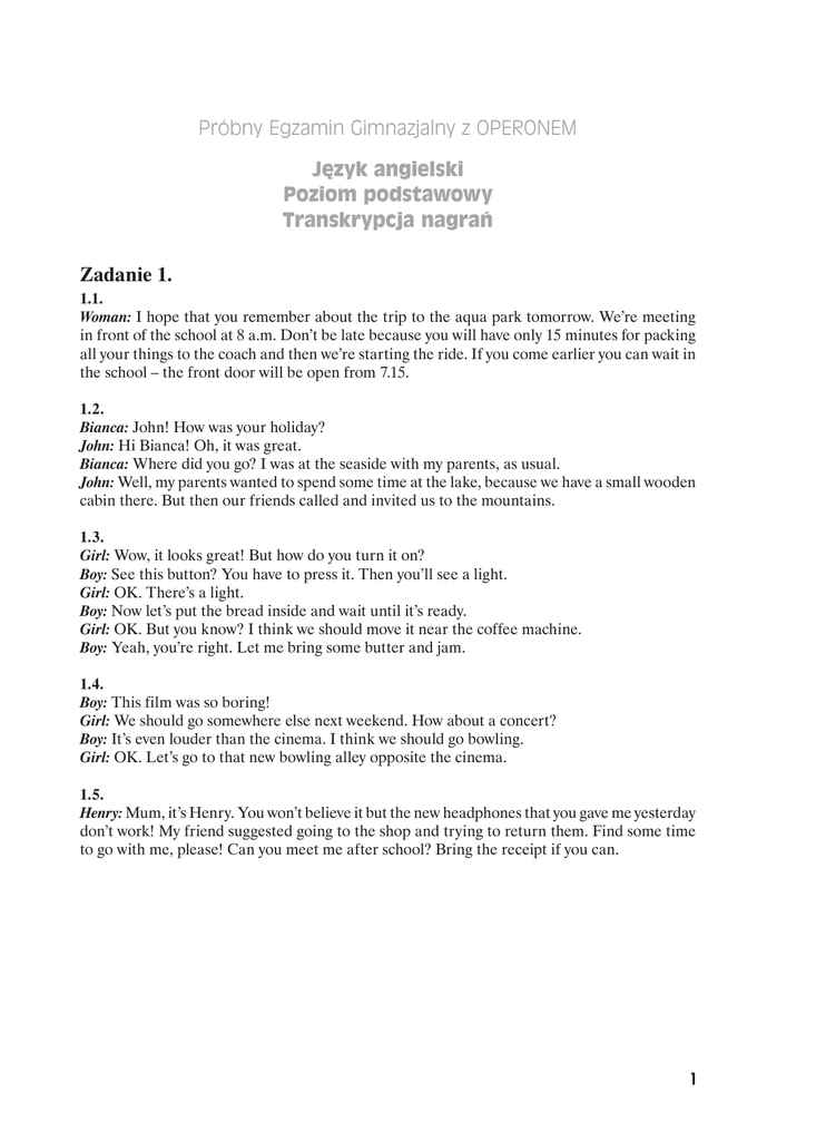 Próbny Egzamin Gimnazjalny z OPERONEM Język angielski Poziom podstawowy Transkrypcja nagrań Zadanie 1. 1.1. Woman: I hope that you remember about the trip to the aqua park tomorrow. We’re meeting in front of the school at 8 a.m. Don’t be late because you will have only 15 minutes for packing all your things to the coach and then we’re starting the ride. If you come earlier you can wait in the school – the front door will be open from 7.15. 1.2. Bianca: John! How was your holiday? John: Hi Bianca! Oh, it was great. Bianca: Where did you go? I was at the seaside with my parents, as usual. John: Well, my parents wanted to spend some time at the lake, because we have a small wooden cabin there. But then our friends called and invited us to the mountains. 1.3. Girl: Wow, it looks great! But how do you turn it on? Boy: See this button? You have to press it. Then you’ll see a light. Girl: OK. There’s a light. Boy: Now let’s put the bread inside and wait until it’s ready. Girl: OK. But you know? I think we should move it near the coffee machine. Boy: Yeah, you’re right. Let me bring some butter and jam. 1.4. Boy: This film was so boring! Girl: We should go somewhere else next weekend. How about a concert? Boy: It’s even louder than the cinema. I think we should go bowling. Girl: OK. Let’s go to that new bowling alley opposite the cinema. 1.5. Henry: Mum, it’s Henry. You won’t believe it but the new headphones that you gave me yesterday don’t work! My friend suggested going to the shop and trying to return them. Find some time to go with me, please! Can you meet me after school? Bring the receipt if you can. 1 Transkrypcja nagrań. Język angielski. Poziom podstawowy Próbny Egzamin Gimnazjalny z OPERONEM i „Gazetą Wyborczą” Zadanie 2. Girl: So, Tim, how is your new house? Have you and your parents already moved in? Boy: Yes, we moved in last Saturday. Girl: And what does your room look like? Boy: Well, it’s quite big and the walls are light yellow. Girl: But you don’t like yellow! Boy: Yes, I really wanted my room to be blue but my parents painted the living room light blue because the open kitchen is dark blue. Girl: My kitchen is white. Boy: Oh, my father also wanted the kitchen to be white. But my mother didn’t agree. So only our bathroom is white, because then it’s easier to clean. Girl: Well, at least your bathroom isn’t green like mine! Zadanie 3. Boy: When I was nine years old, our family went camping. On the camping site we met a sixteenyear-old boy, who played the guitar and sang. From that moment I wanted to play the guitar. I bought my first guitar a year later, and when I was eleven I went to music school. My first teacher was lazy. He didn’t care about how I was playing. When I was twelve years old, I started to work with a better teacher. That year, I got the second place in a competition. My second teacher worked with me by playing exercises. During the next two years I took part in all three of the competitions that were held in my city, and I won first prizes in two of them. adapted from www.topics-mag.com Zadanie 4. 4.1. Welcome to Dublin! 4.2. Thanks for helping me in Maths. 4.3. Excuse me, does this bus go to the city centre? 4.4. How about eating some ice-cream? 2