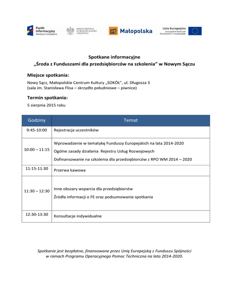 Spotkane informacyjne „Środa z Funduszami dla przedsiębiorców na szkolenia” w Nowym Sączu Miejsce spotkania: Nowy Sącz, Małopolskie Centrum Kultury „SOKÓŁ”, ul. Długosza 3 (sala im. Stanisława Flisa – skrzydło południowe – piwnice) Termin spotkania: 5 sierpnia 2015 roku Godziny 9:45-10:00 Temat Rejestracja uczestników Wprowadzenie w tematykę Funduszy Europejskich na lata 2014-2020 10:00 – 11:15 Ogólne zasady działania Rejestru Usług Rozwojowych Dofinansowanie na szkolenia dla przedsiębiorców z RPO WM 2014 – 2020 11:15-11:30 11:30 – 12:30 Przerwa kawowa Inne obszary wsparcia dla przedsiębiorstw Źródła informacji o FE oraz podsumowanie spotkania 12:30-13:30 Konsultacje indywidualne Spotkanie jest bezpłatne, finansowane przez Unię Europejską z Funduszu Spójności w ramach Programu Operacyjnego Pomoc Techniczna na lata 2014-2020.